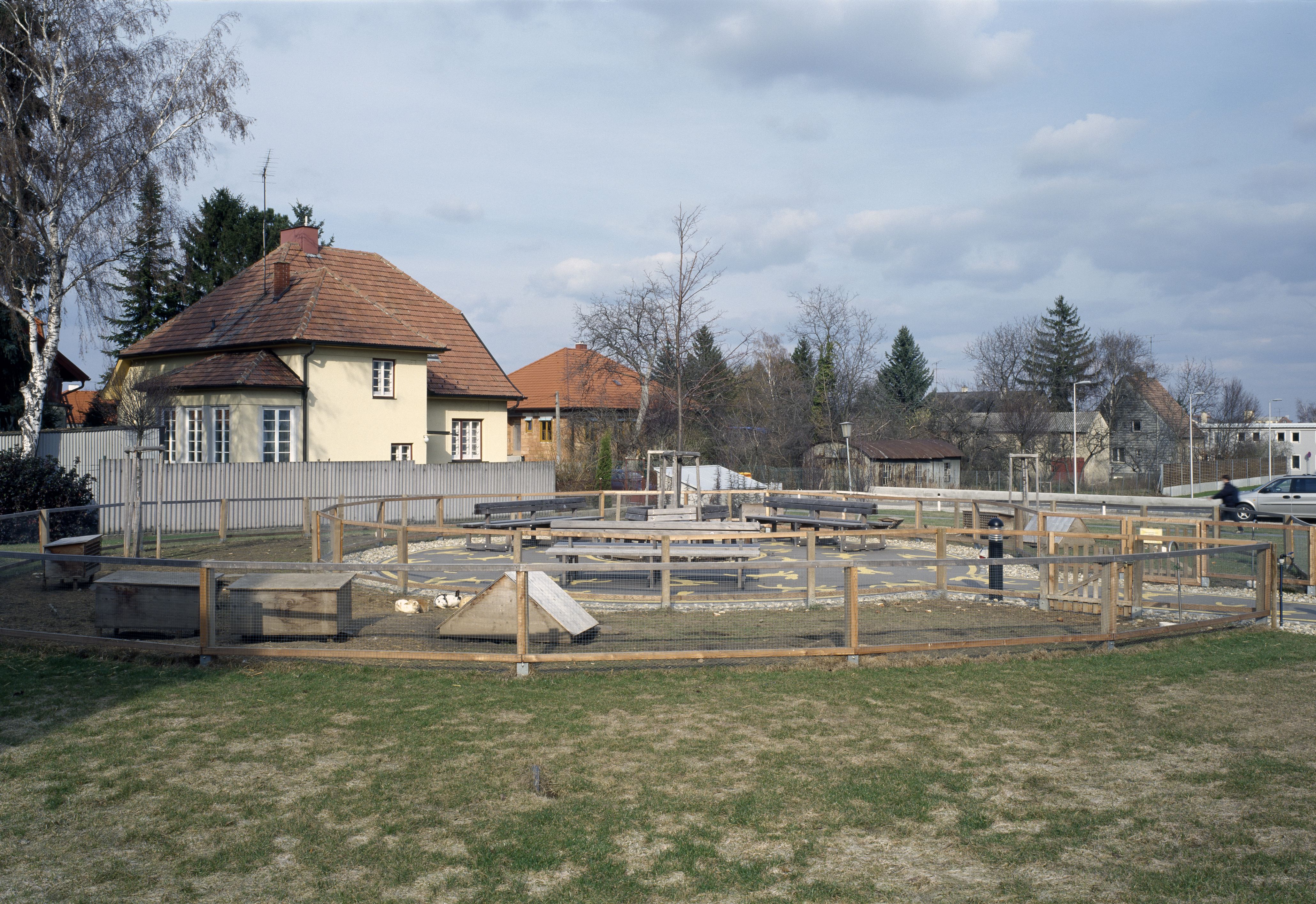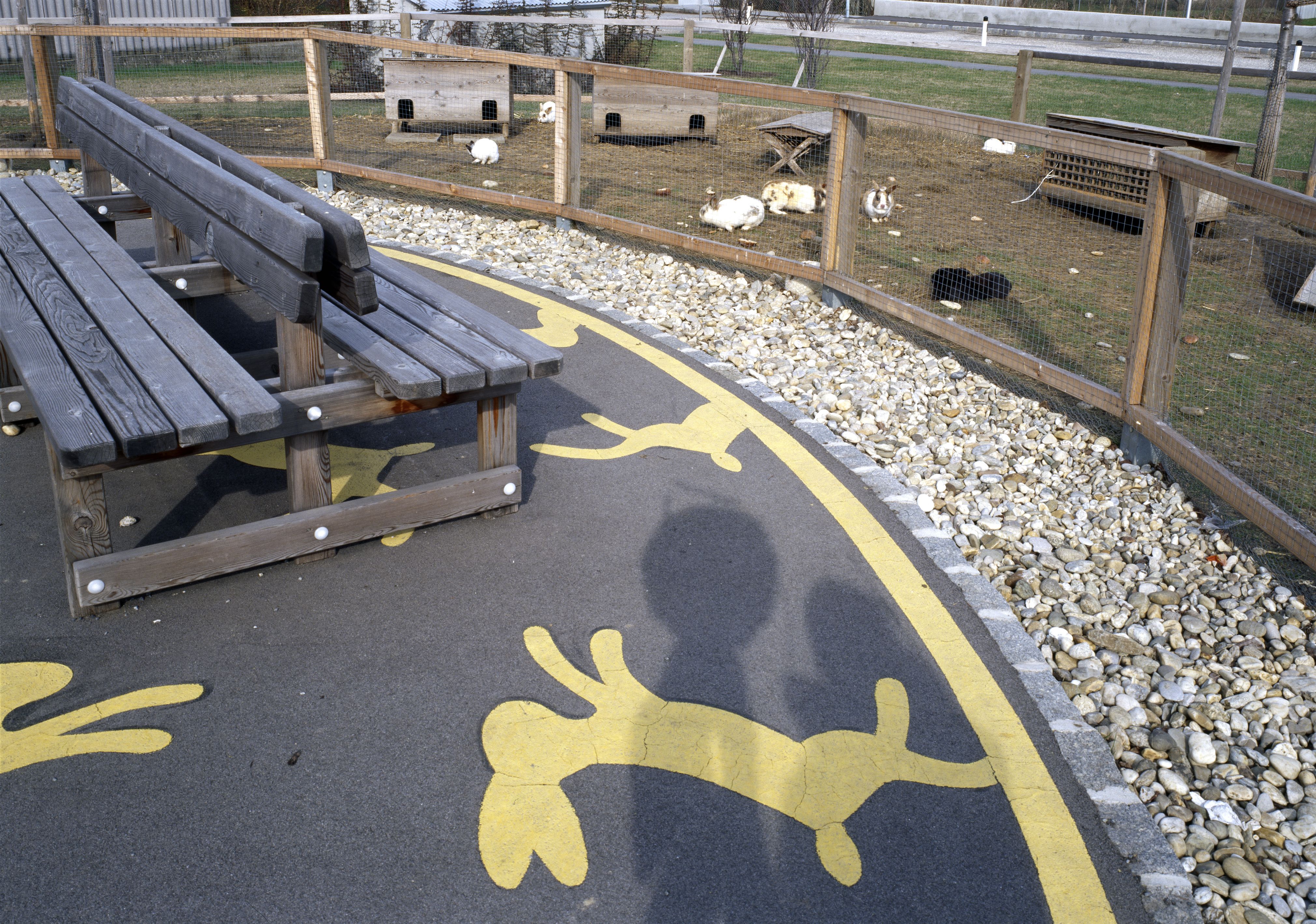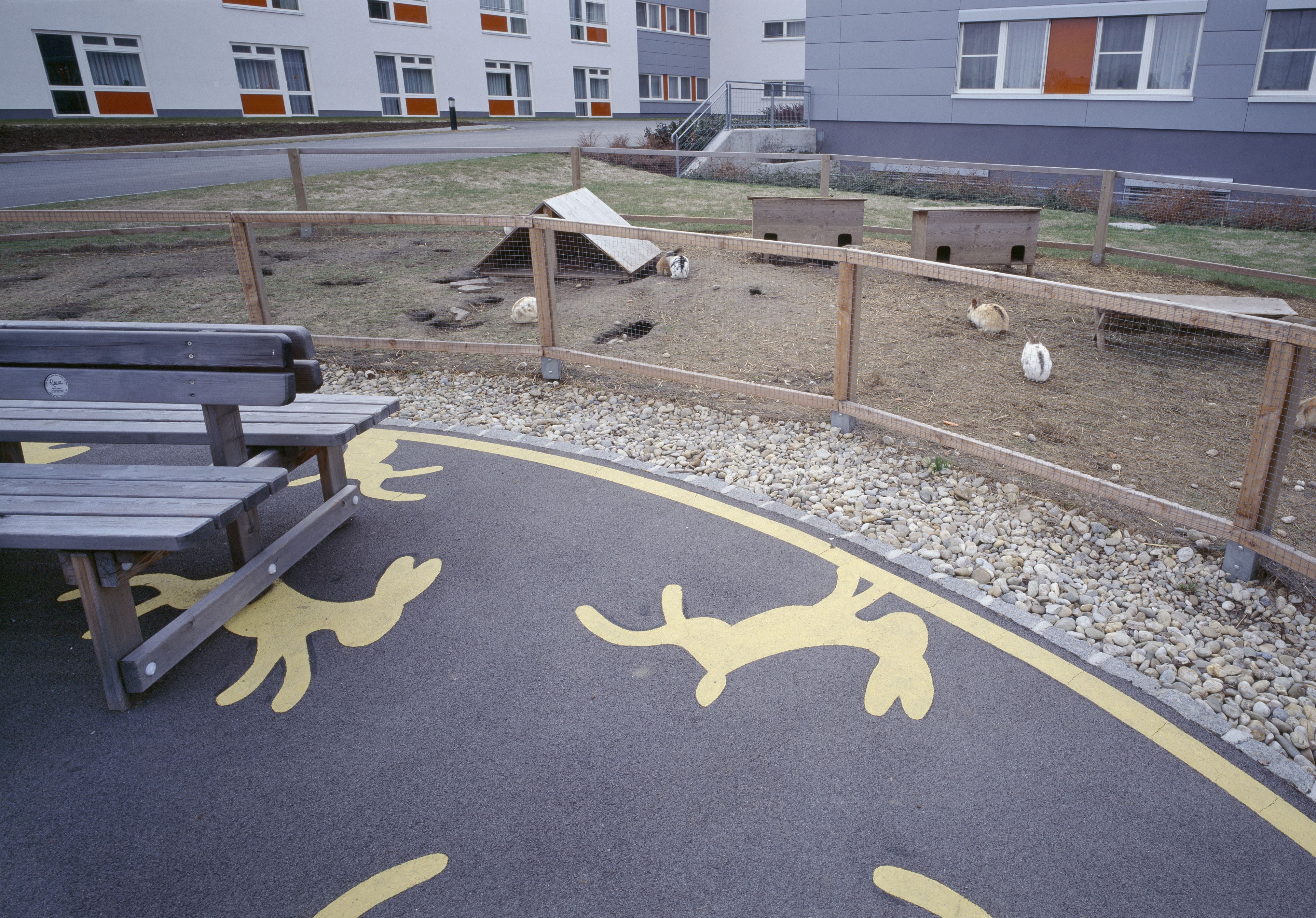 The concept for the newly built senior citizens home combines a purely artistic approach with a social one. It includes the planting of the courtyard with a larch tree and a round bench built around its trunk, additional wooden benches, a hare run with live animals as well as stylised depictions of hares on the surfacing.