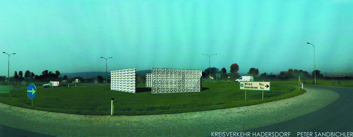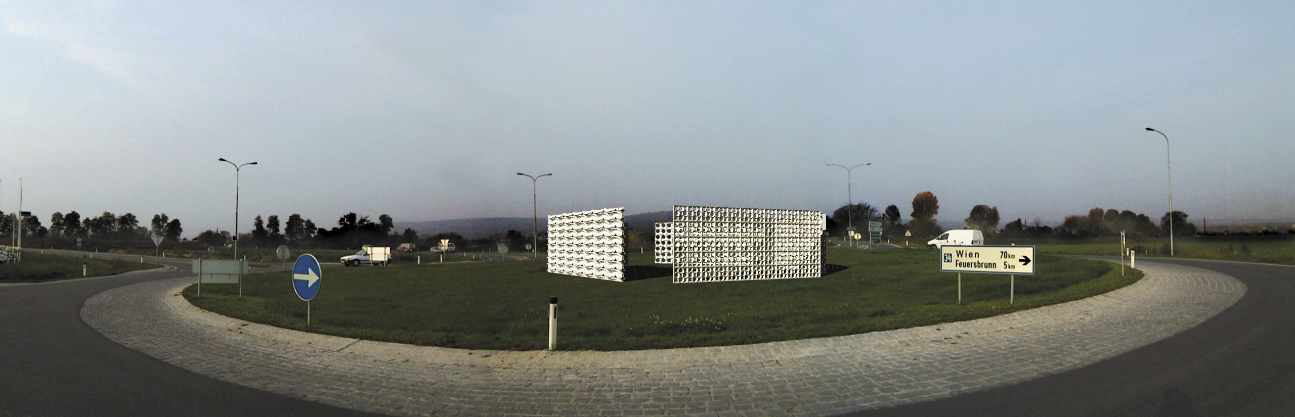 Peter Sandbichler proposed an installation for a roundabout in Hadersdorf. He took an analytical approach to the difficult exercise of completing a roundabout, a construction exercise that has been pursued with a vehement will to design in recent years. His concept unifies a principally sculptural approach with the conditions for perception and awareness. A group of five modular moulded concrete elements were to be positioned in a circle at a distance to one another and at some distance from the edge of the road. Each of the roughly seven metres long and three metres high walls is assembled out of modular elements with transparent ornamentation. Sandbichler calls them "membranes", comprising basic elements from various epochs, styles and cultures, which he has rendered abstract and translated into an endless structure. He emphasises that he has also incorporated elements of local regional architecture in the process. They were to be lit up at night. Decisive for drivers is the phenomenon of transparency and overlapping as they pass, the effect at night that Sandbichler describes as "like filters of a light machine that generate varying sequences of images". These appear to be conceived as matching the focus and the radially conceived elements of the roundabout, and although they block the view they open up new perspectives, ones with both a visual and a culturally encoded dimension.