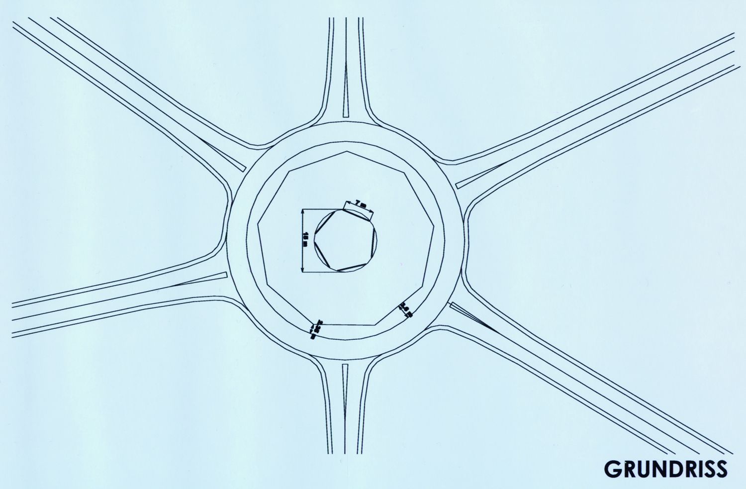 The unrealised concept entitled The Blocked View — Concrete Tiling envisaged the erection on the roundabout of a circular group of five apparently transparent cast concrete walls, each seven metres wide and three metres high. They were to have been lit by night to generate different illuminated images.