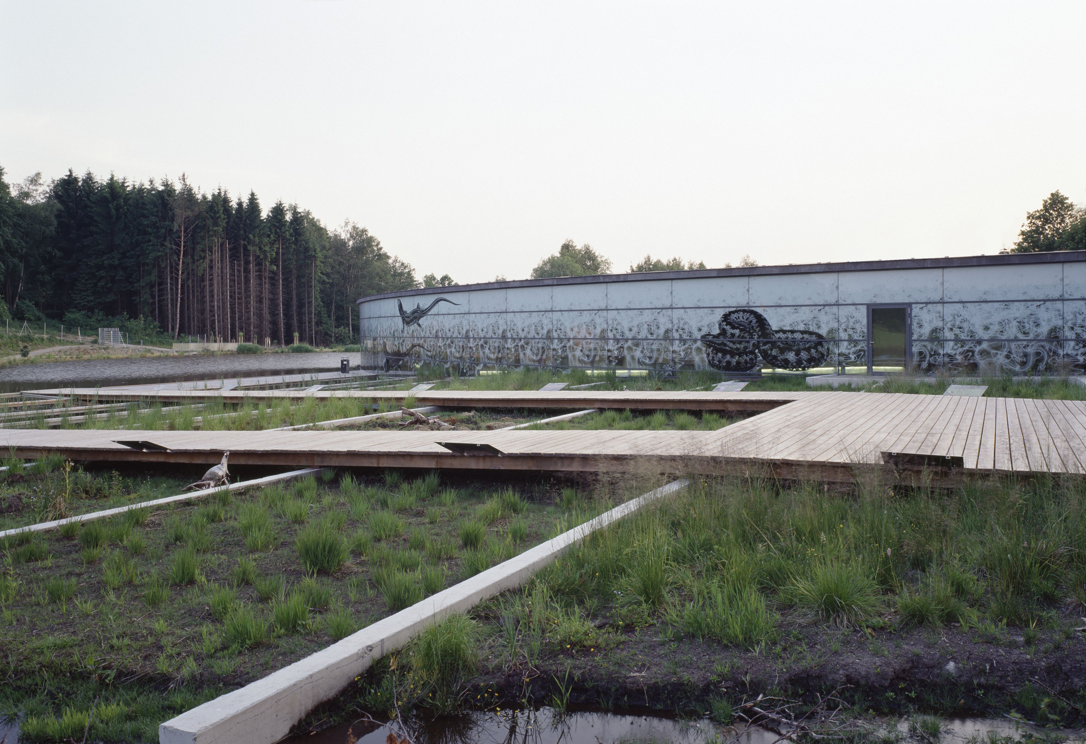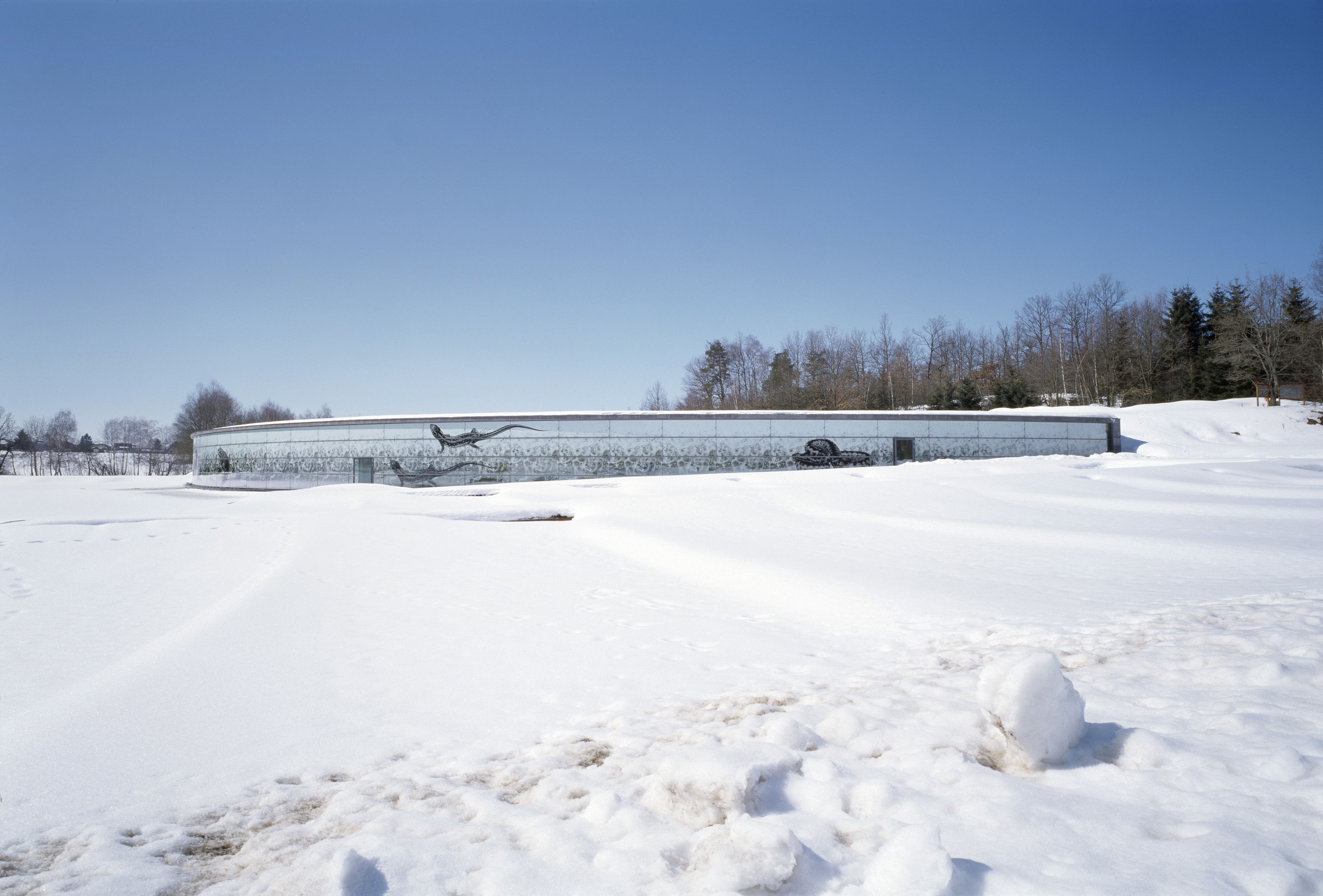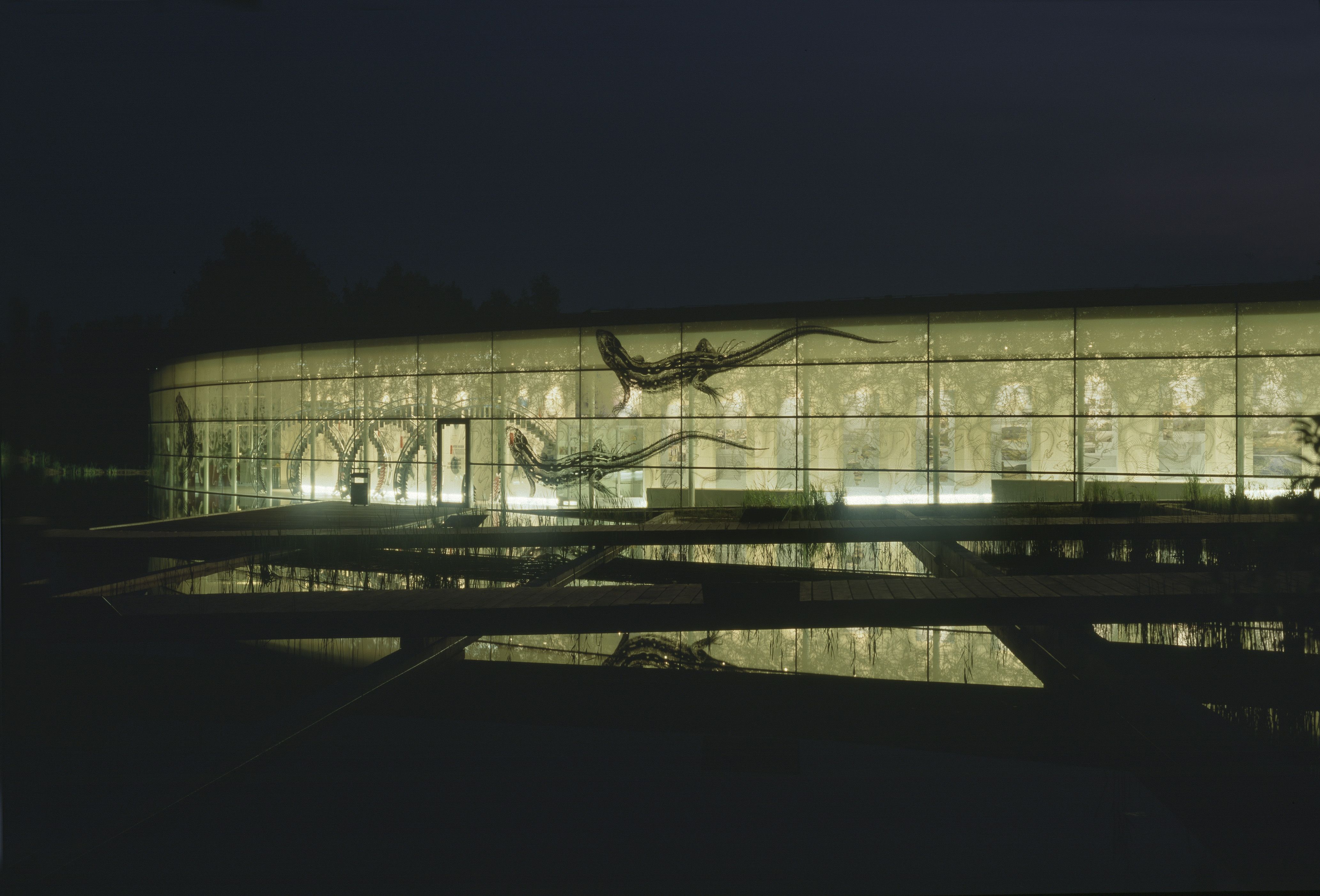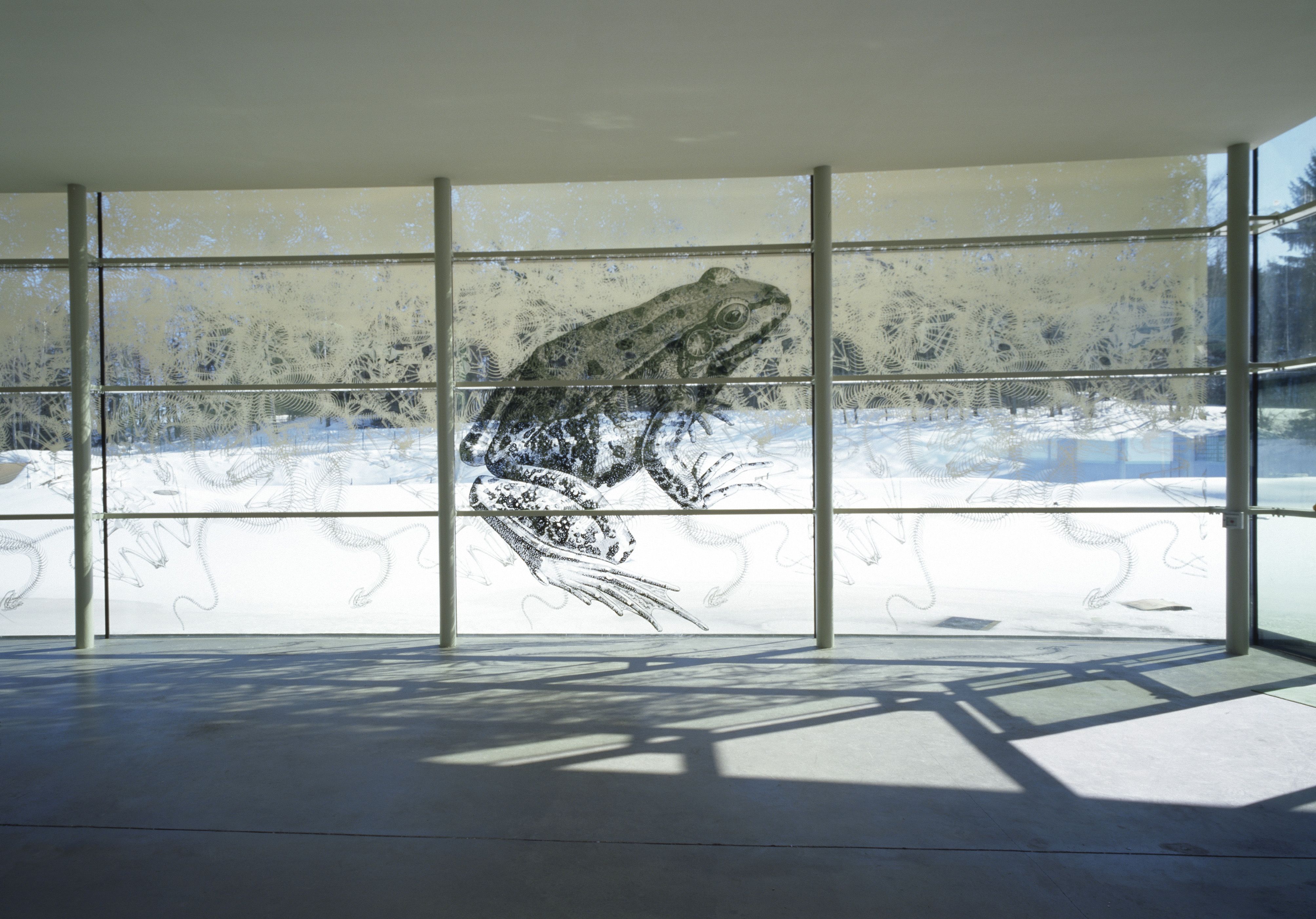 The three black depictions of a water frog, a sand lizard and a European adder on the façade of the building are based on illustrations from historical reference books. They were screen-printed onto the outer glass skin over background ornamentation showing white skeletons and amphibians covering the entire façade.