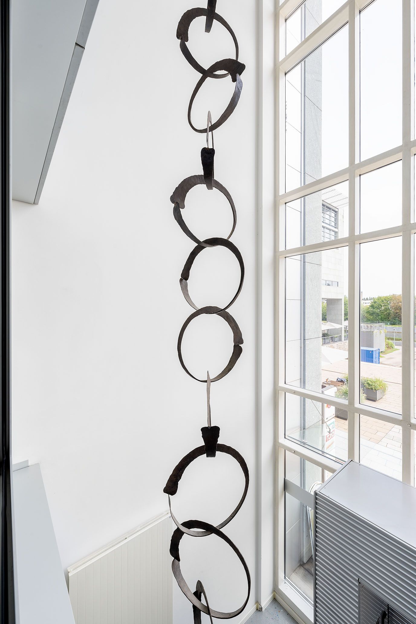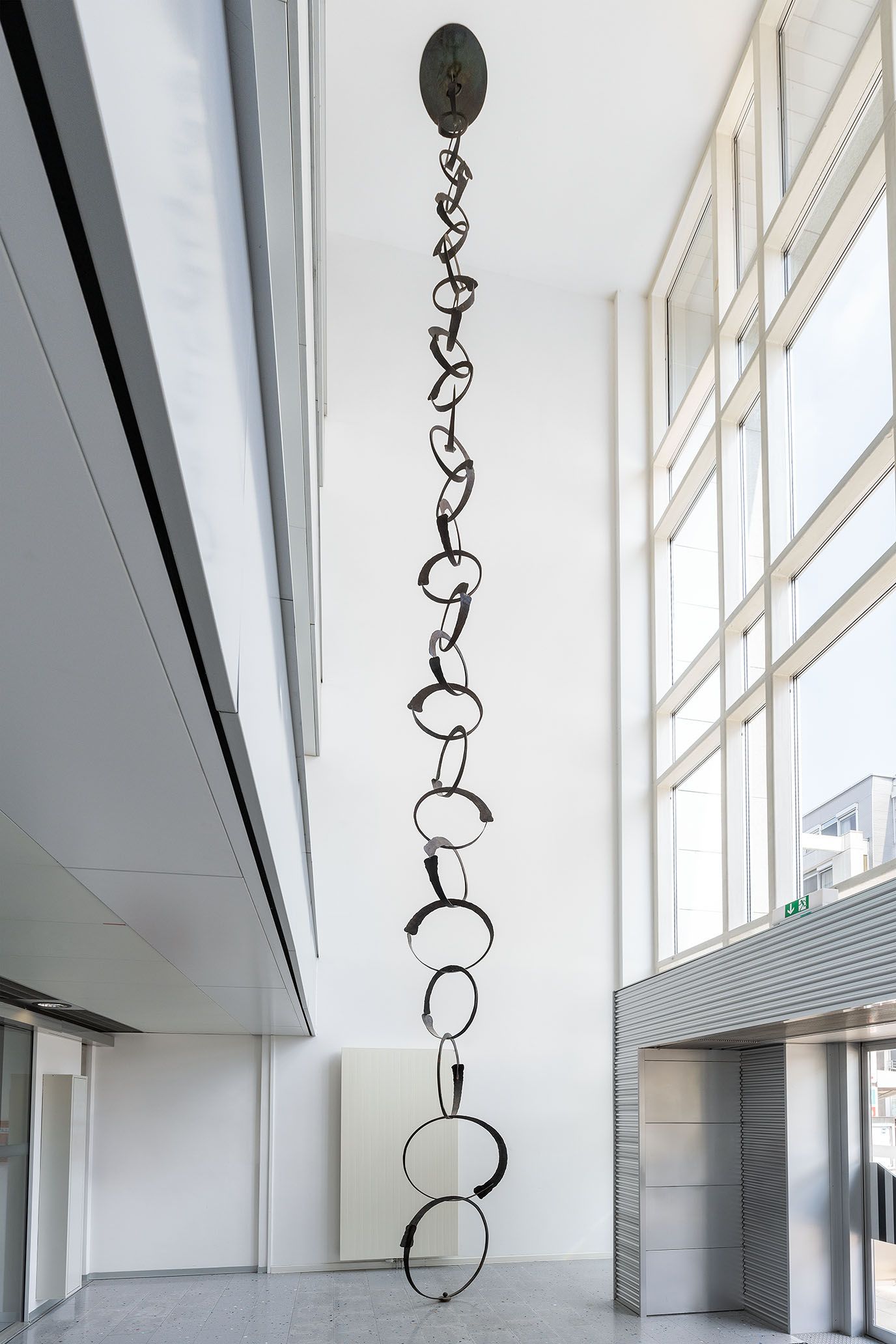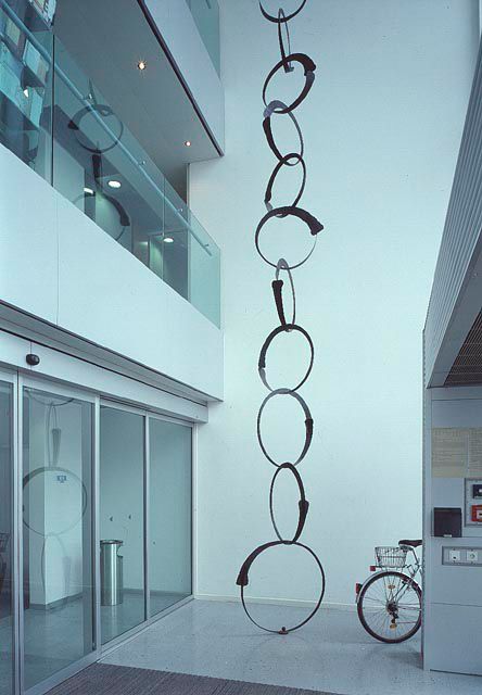 A 5m deep and 12.5m high space has been created between the glazed entrance façade and the horizontal articulation of the individual levels. Gabriele Kutschera has hung hand-worked, interlocking, circular wrought iron elements that progress from 30cm to a maximum of 100cm in diameter from the ceiling in this space.
