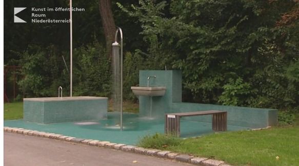 The captivating blue of the 'fountain' means that it attracts people from afar even though the view of items normally found in a domestic environment is a source of irritation. The oversized bathroom made of concrete, which cites the usual bathroom furnishings, complete with shower, bathtub and basin, is lined with blue glass mosaic stones. Water runs out of the taps and shower head – but excessively: while the basin spills over, the shower keeps running and the water in the bathtub streams straight into the overflow. The bathroom mutates into a fountain that alludes to the historical connection of springs with artesian wells and baths. Associations with spas, wellness and fountains of youth are a given, as is the ambivalence of the private sphere, intimate space, as a public space and repeatedly experienced by the public in a new context. The open-air baths is also addressed as a cultural site that becomes an extension of the community. Resting cyclists, and there are many cyclists in the area, make use of the installation, as do children – among whom it has long been favoured as a fixed component in their activities.