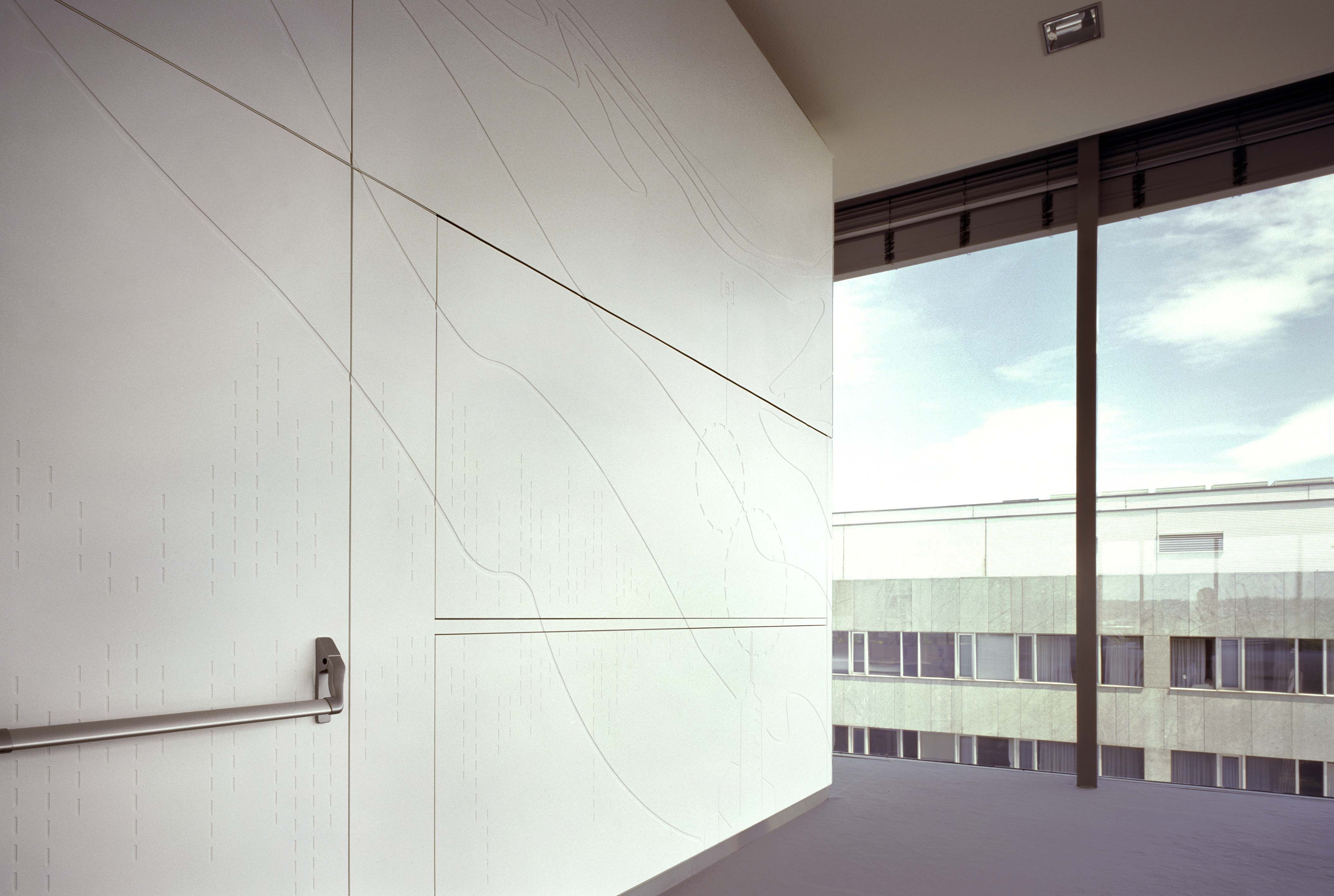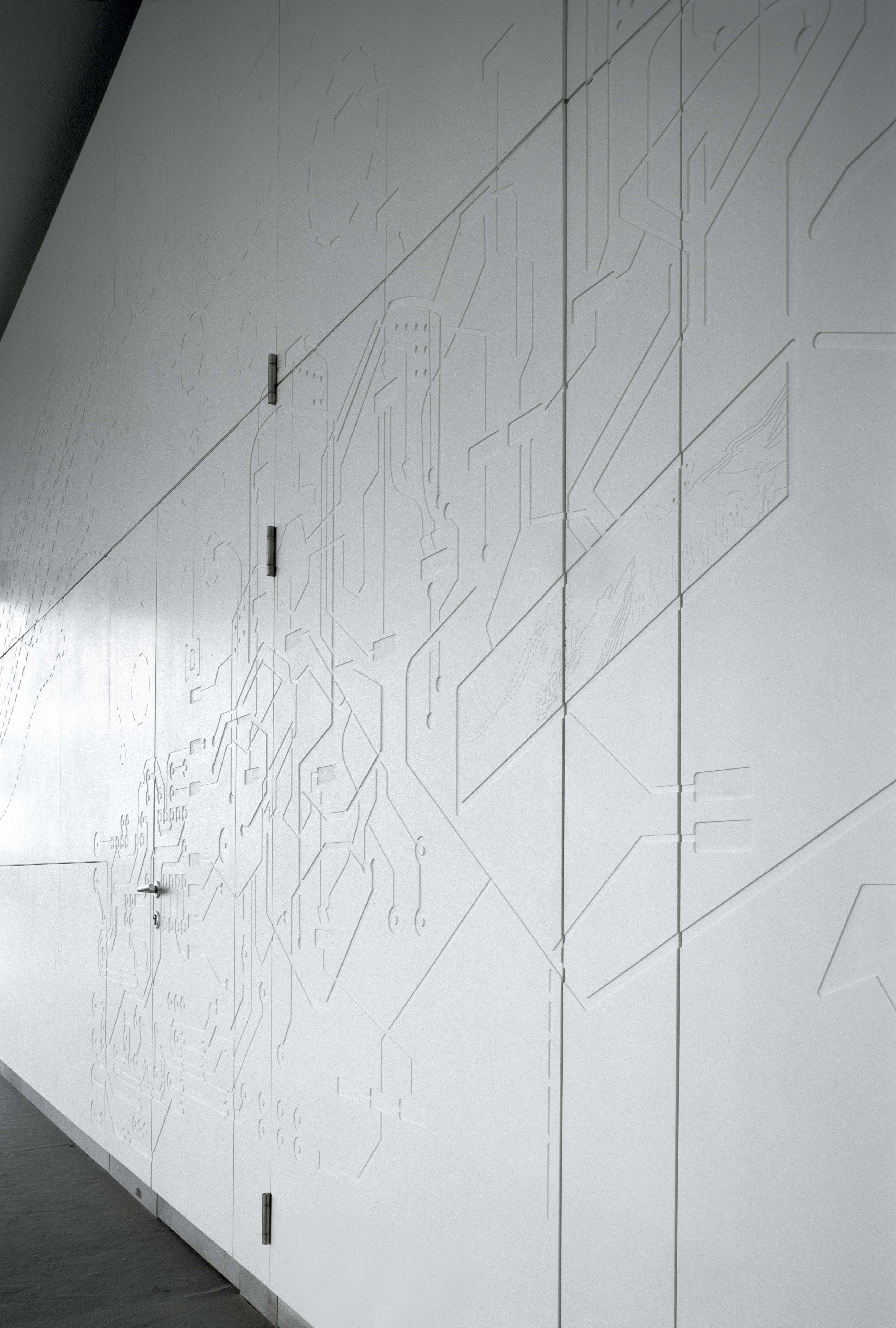 The installation Die Wechselschattenspeicher (The Changing Shadow Storage) translates drawing into three-dimensions. A drawing milled into the wall inside the forum can only be appreciated as a whole when the viewer changes position several times.