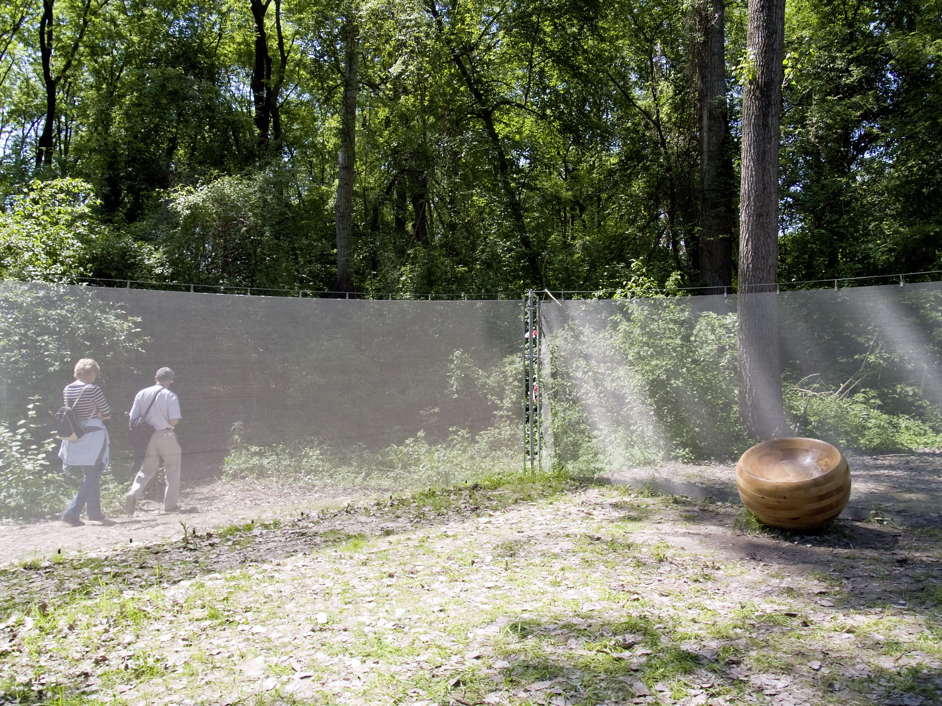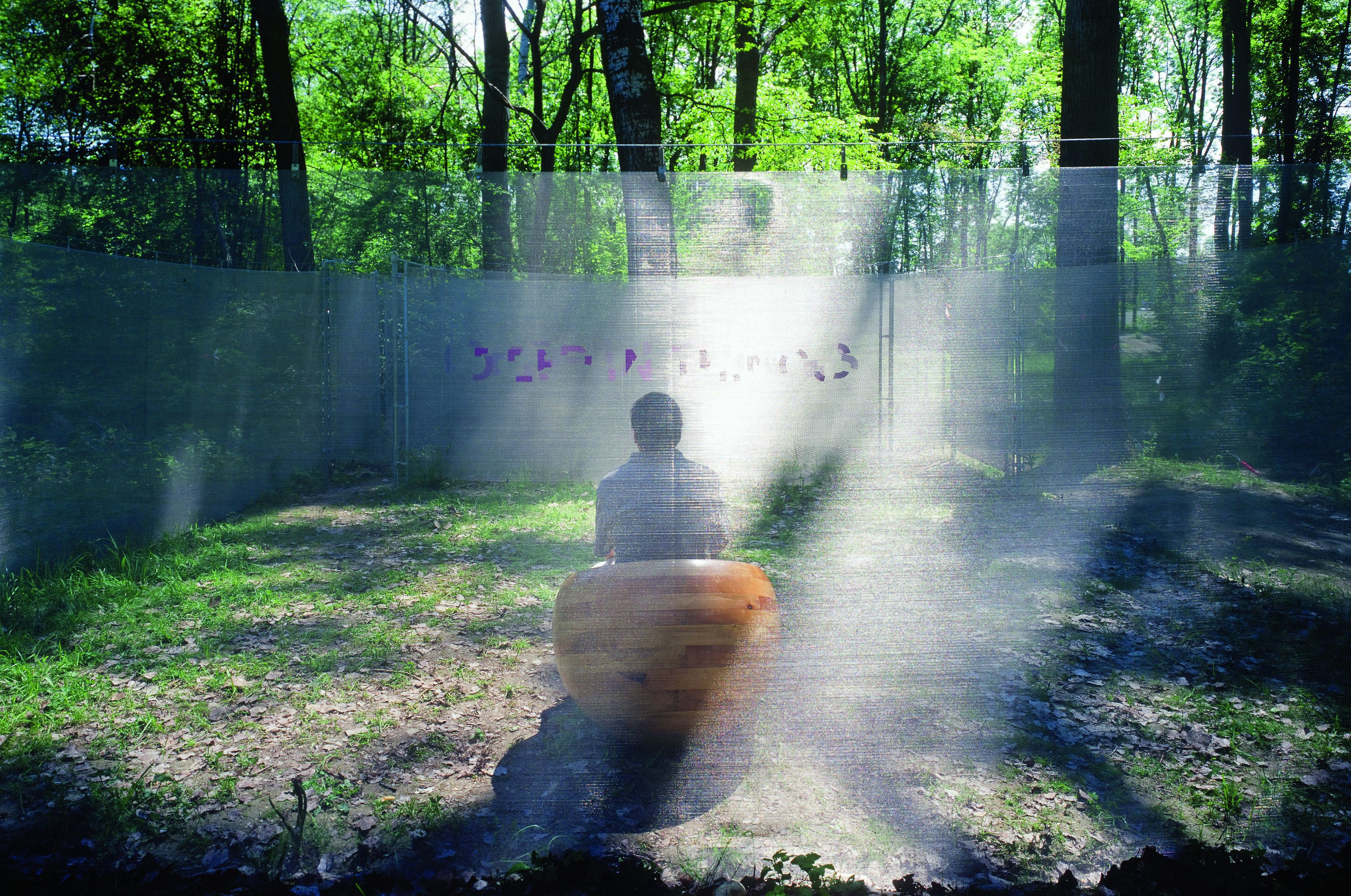 A mosquito net spans a scaffold frame of 10 x 7 x 2 metres. A narrow entrance leads into the sculpture and to a garden room through a labyrinth of nets hanging parallel. Here the words "Deep in Things" are legible, formed by the overlapping of the nets.