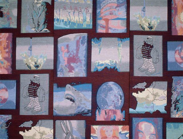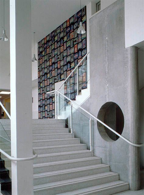 In Weikersdorf a textile wall design was requested for the new wing added to the primary school. Since Peter Kogler’s original suggestion, i.e., a curtain, was not feasible for practical reasons, a wall design extending over two floors was selected. This wall hanging interlocks strips of images taken from children’s TV program, the so-called Mini-ZiB – symbols that could be recognized by children but at the same time have become unfamiliar in this repetitive arrangement.