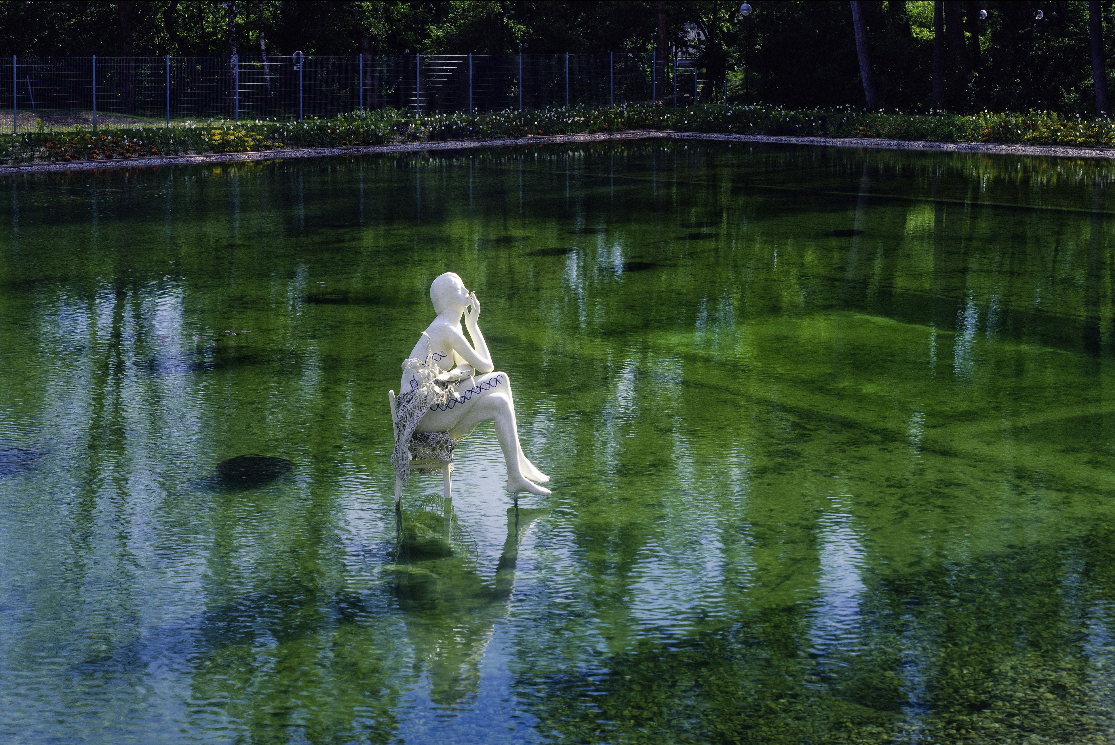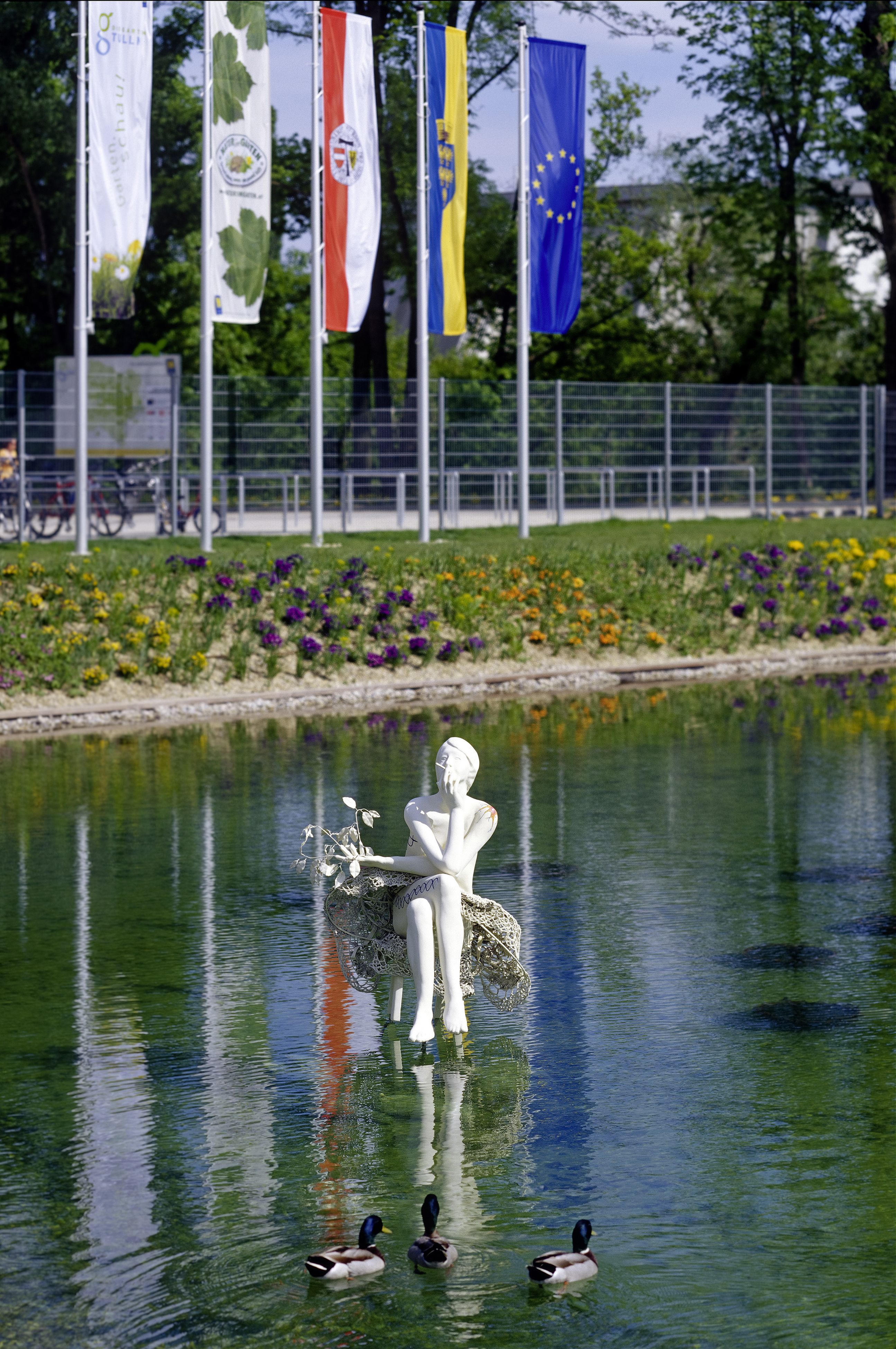 The Daphne by Ines Doujak is provocative, self-assured and sexy. Outfitted with a whole-body tattoo and a fishnet skirt, the nymph and virgin huntress exhibits rather unconventional behavior and is generally a tease. Daphne has already shaken Apollo off. She now sits upon a wooden stool in the pond behind the visitors’ center, and is just beginning to take a cigarette break when her metamorphosis into a laurel tree first becomes visible in the tips of her fingers. And in the blink of an eye, she’ll be casting out the coarsely netted cloth around her waist to capture her next prey. It is from a decidedly feminist perspective that the artist Ines Doujak, born in Klagenfurt in 1959, looks at society and politics, at their power structures and norms. With each of her works, the Documenta participant (d12) makes her own contributions to the realms of generosity, openness and tolerance. The interplay of genders, role reversals, departures from the norm and the deconstruction of laming commandments mark her work, an oeuvre of highly surprising twists and adventurous turns, an oeuvre that never settles on just one medium and thus continues to be baffling.