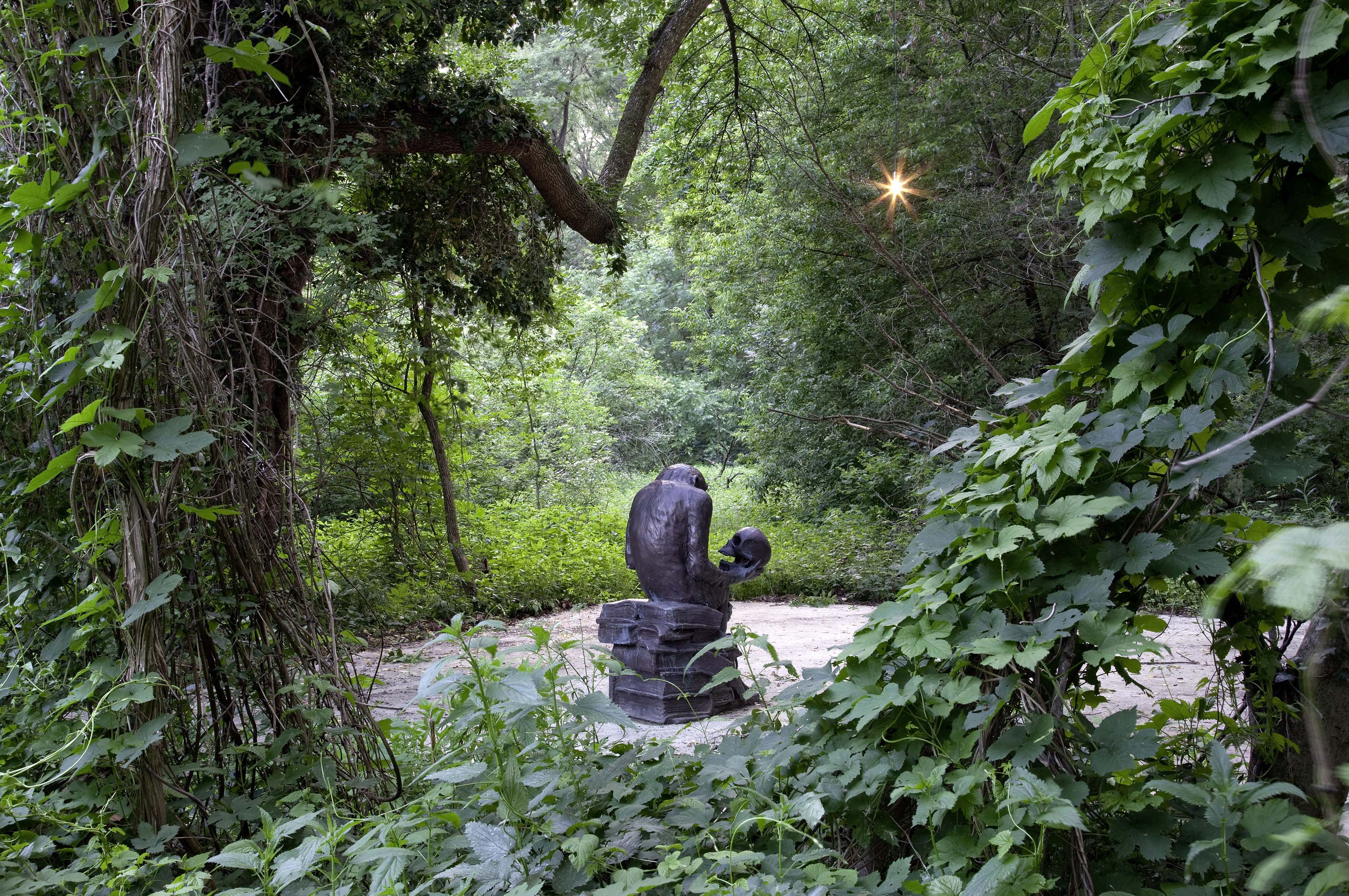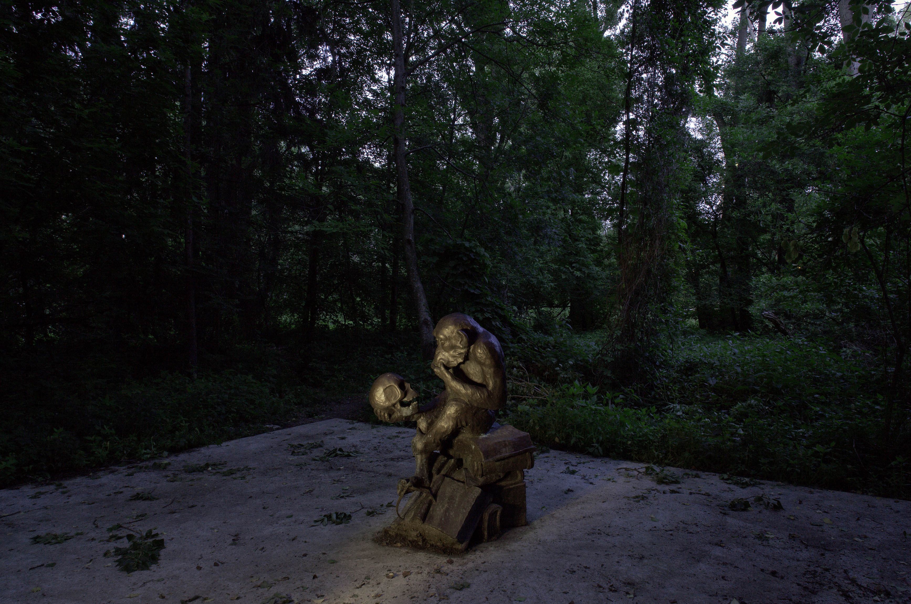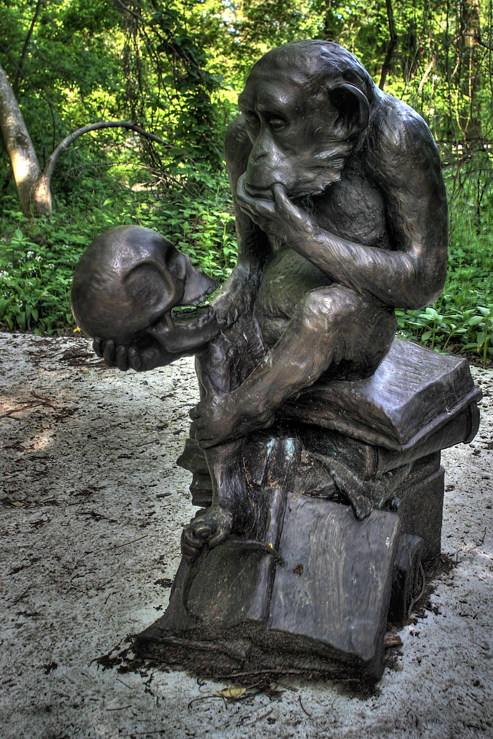A monkey is sitting on a pile of books in the Tullner Auwald and gazing at a human skull. A circle and a light bulb supplement the arrangement. The sculpture by the conceptual artist entitled Coverversion is a replica of the miniature sculpture "Affe mit Schädel" (Monkey with Skull) by the sculptor Hugo Rheinhold from 1893.