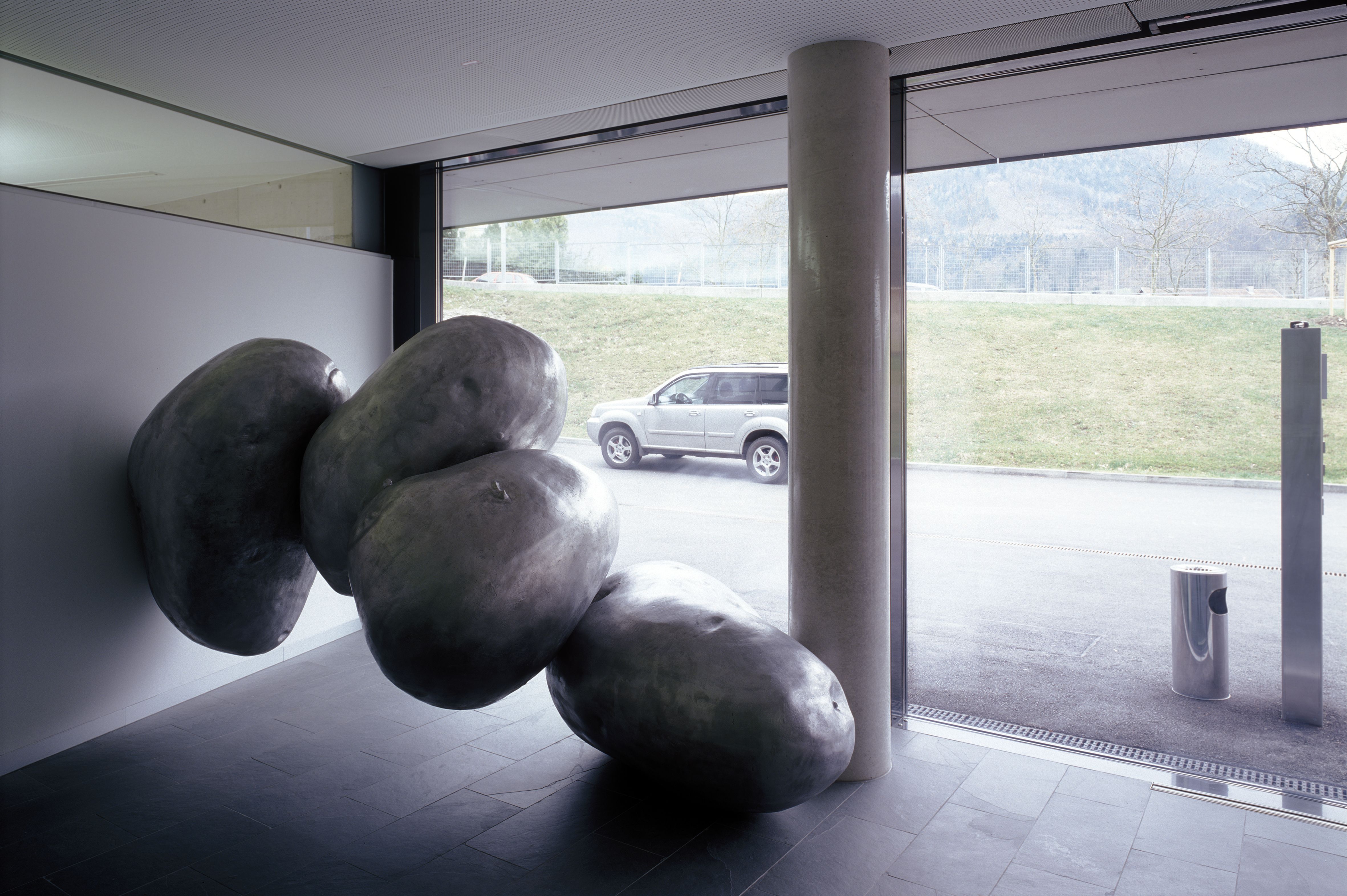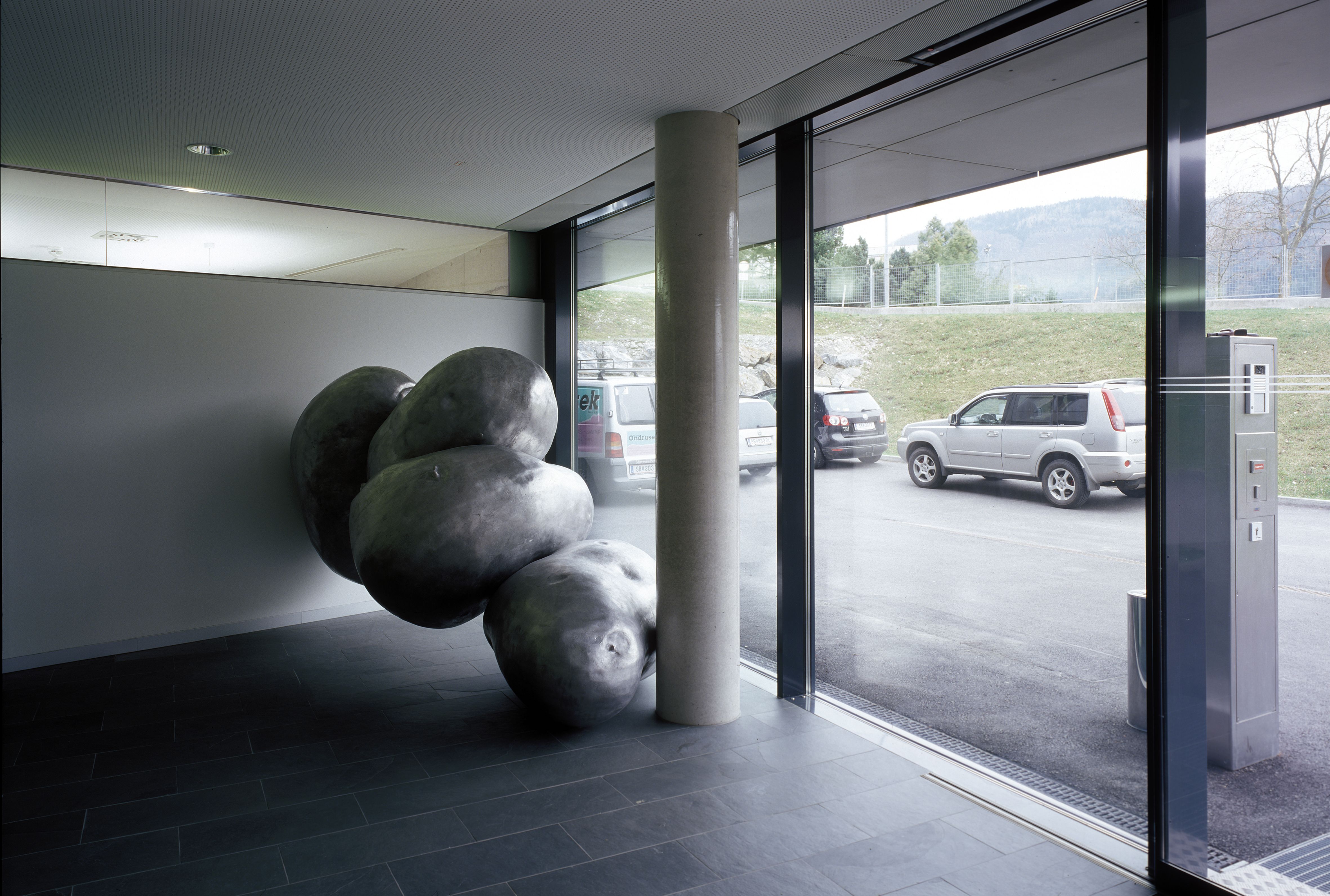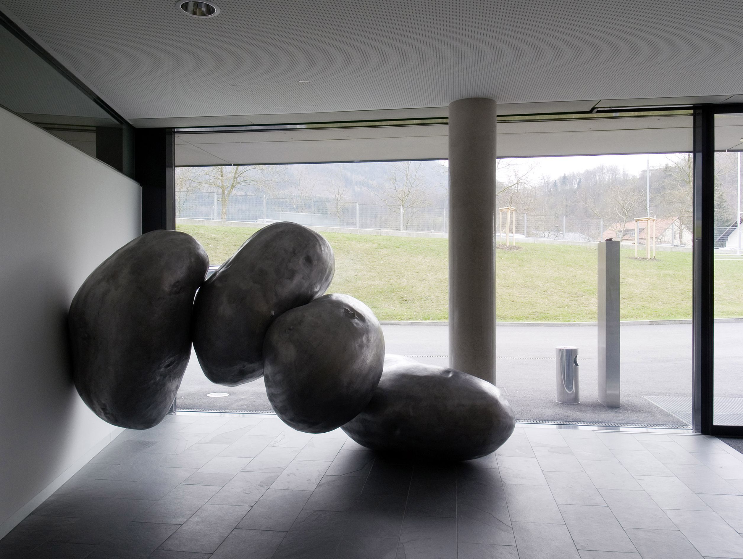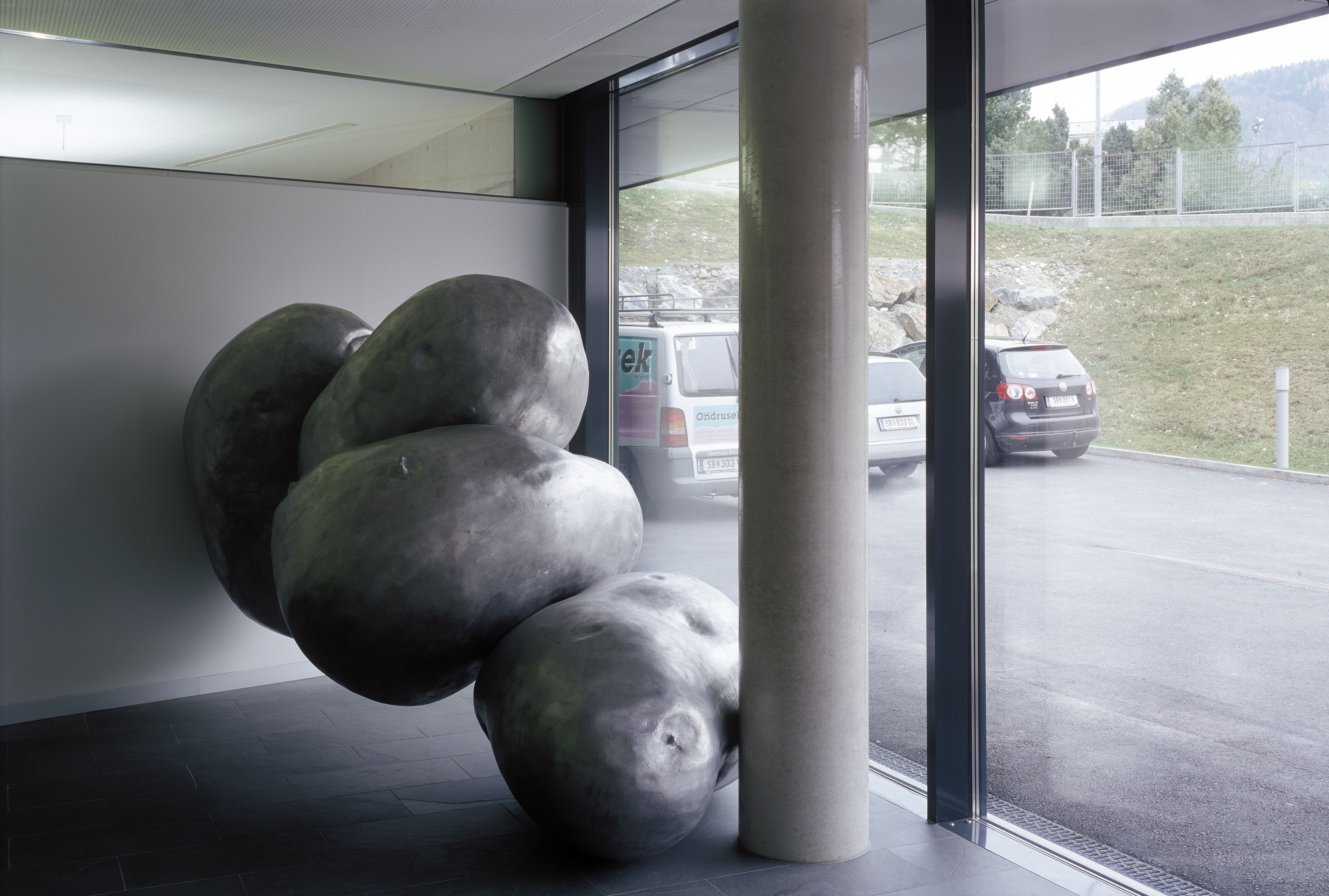 Kartoffeldruck (potato print/lit. potato pressure) is the title Hans Kupelwieser has given to the installation in the vestibule of the building. Four hollow aluminium casts in the shape of potatoes hang between the pillars and wall., the strain is diverted vertically, like a vaulted ceiling, to hold the potatoes in a spectacular hovering position.