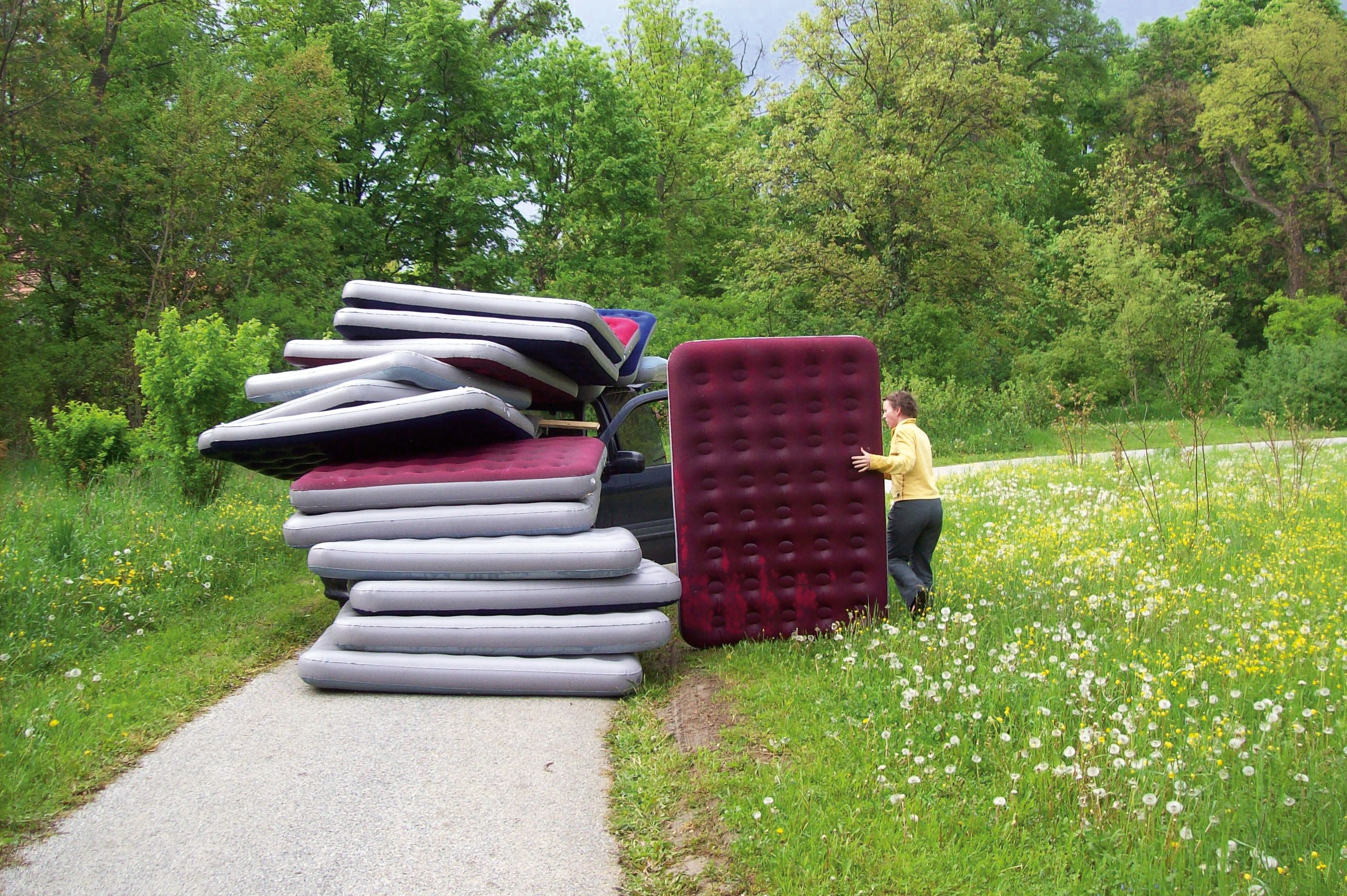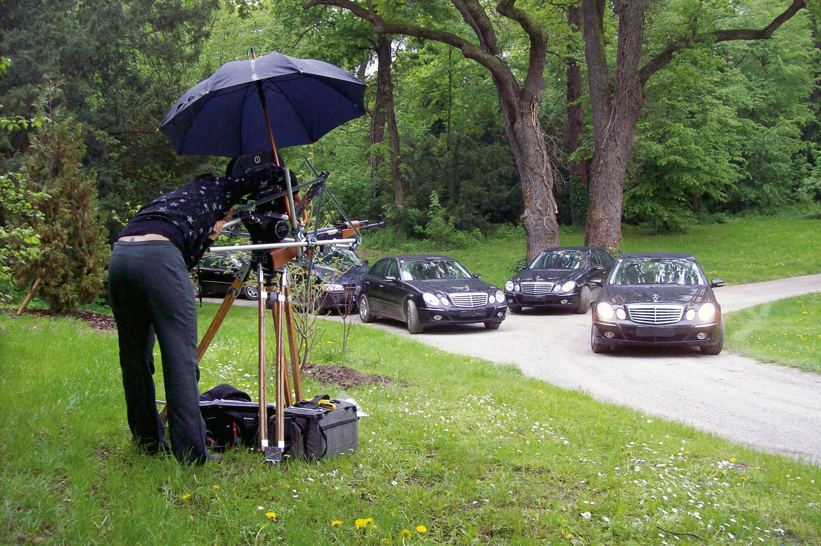 The initial idea was to play film music over the entire gounds every hour. This would make the park a film set, an artifically created countryside as a backdrop for dramatic, exciting or romantic scenes. In the end, I did actually use the park as a backdrop for a film. It begins with the reproduced closing sequence from a science fiction classic where the protagonist returns home, which proves to be unreal, a physical manifestation of his image of home. The same shots were repeated without any people, leaving just the backdrop to be seen. The actor disappears entirely, and a black car drives slowly along the park's paths — a scene that actually exists. This is retained throughout the film but with variations in all of the elements. One time the park becomes a landscape of pipes, the car is duplicated, it becomes white, alternating props emerge. The various methods of representation and entirely analogue effects are reminiscent of the most varied of films and stylistic elements. Instead of illustrating a story, the depiction itself becomes the narrative; the surface and the presentation of objects and events are more significant than the content. Beds become structures, motor parts buildings, fabric patterns become levels in double exposures.