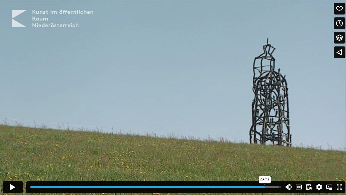 He entitled the work, which he created specially for the location, Weltwegbetrachter (World Path Observer) due to its shape and the vantage point that it offers. The seven metre tall sculpture is the product of a complex technical process, and made of flotsam from the river Ybbs shaped in wax and tree trunks cast in bronze at the Loderer foundry in Feldbach. On closer inspection of the impressive large-scale sculpture, a person, an 'observer', is to be discerned growing out of the very top of the oval, almost pear-shaped overall volume in its wood-like figure-populated convolutions — the head of which has a smaller 'observer' emerging from it. A human being as occupant and observer of the micro- and macro-world is conveyed symbolically as a creature that essentially experiences the world through sight. The title alludes to the diversity and wealth of possibilities of being in the world, of living in it and drawing from it for one's own life. From a distance the sculpture creates the impression of a large weather-beaten tree. Gunter Damisch shows, too, that for him nature (the countryside) provides a major and irreplaceable source of inspiration for his art. "For the artist, dialogue with nature remains a conditio sine qua non. The artist is a man, himself nature and part of nature in natural space." (Paul Klee).
