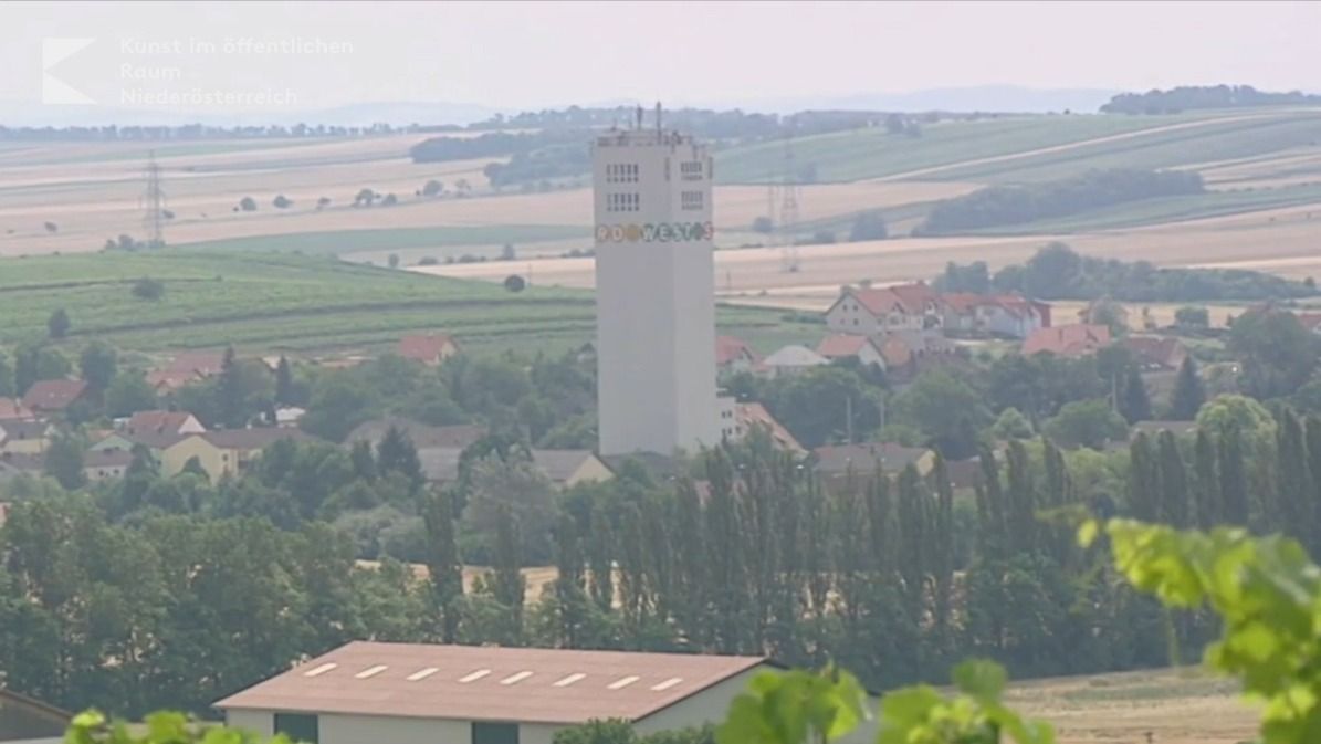 The Lagerhaus silos are the secret skyscrapers of the Austrian provinces. No other type of building dominates the Austrian flatlands like the many vast grain silos in the communities of Lower Austria. Even before villages come into sight these concrete giants can be seen reaching into the sky. The Viennese artist Christian Hutzinger avails himself of just such a silo — employing it as a signpost and, at a second glance, for orientation. Vast circles with a diameter of three metres each entwine the upper end of the silo concerned. The surfaces are filled with colour and adorned with apparently random combinations of letters on the narrow sides, STS and TNO, while the two wider sides carry the letters RDWE and ÜDOS at a great height. What is happening here? One has to peer around the corner of the masonry: cars follow the curves of the roads, approaching the silo from different directions. The four colours finally provide the decisive clue: the names of the four points of the compass are painted over the corners — confusion and orientation. The simple intervention on the surface of the building allows the silo to be understood in the context of its setting. Instead of an ugly point in the village it is transformed into a compass sized XXL. A pointed motif at a height of 58 metres.