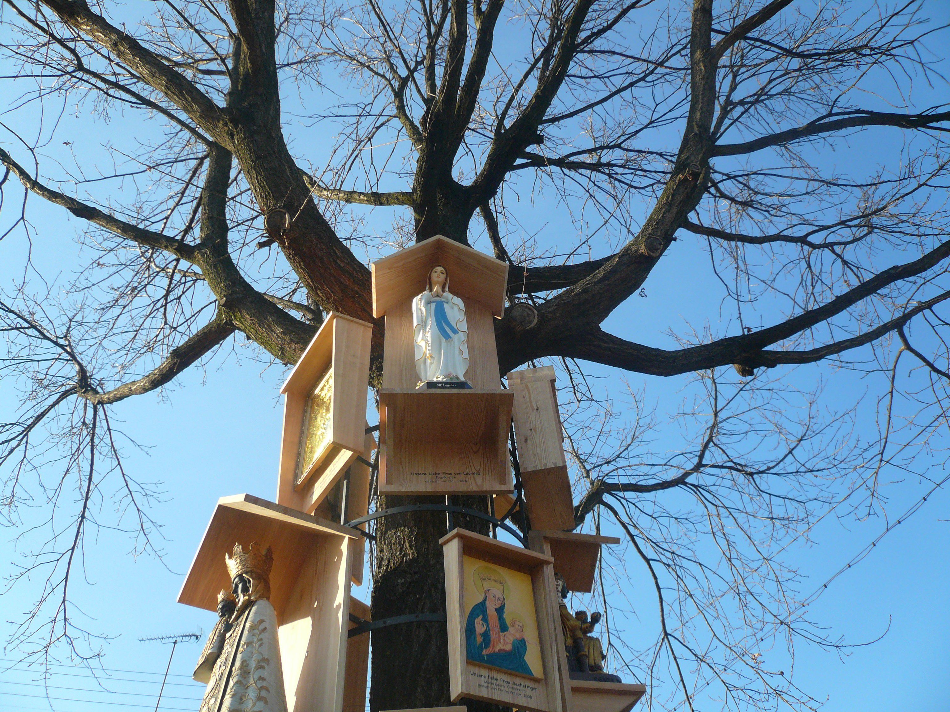 Quoting the rural tradition of Bilderbäume (trees adorned with numerous images of The Virgin Mary) the artist duo purchased replicas of statues accredited with miraculous powers in various places of pilgrimage with shrines dedicated to The Virgin Mary, and grouped them around a tree. The statues and images are protected by little cases and canopies of larchwood and marked with the name and place of origin of the replica concerned.