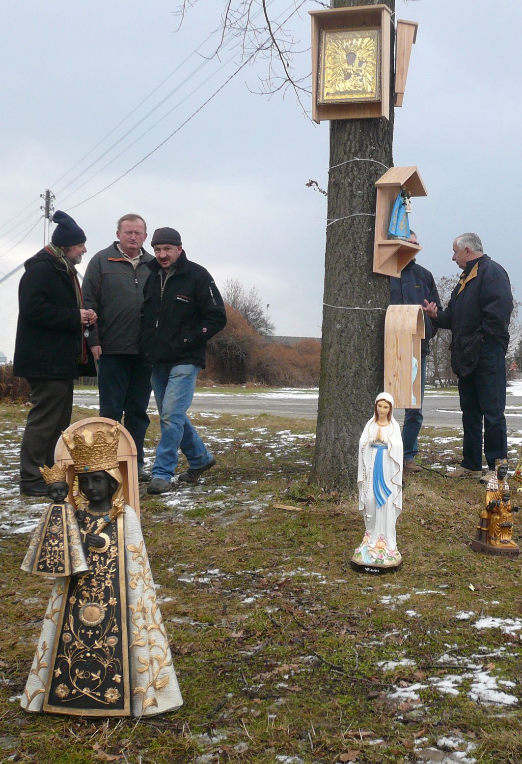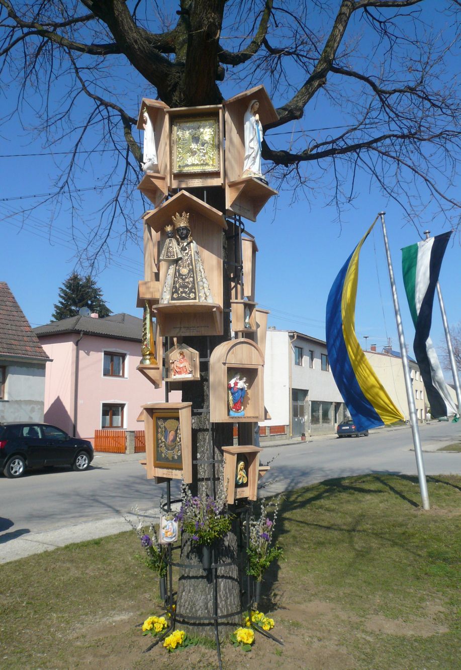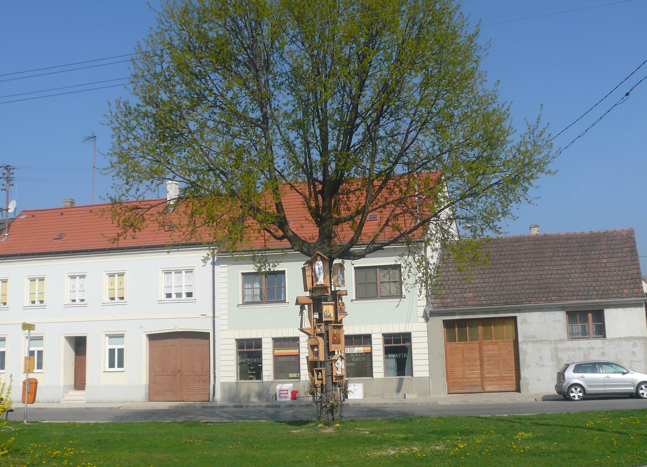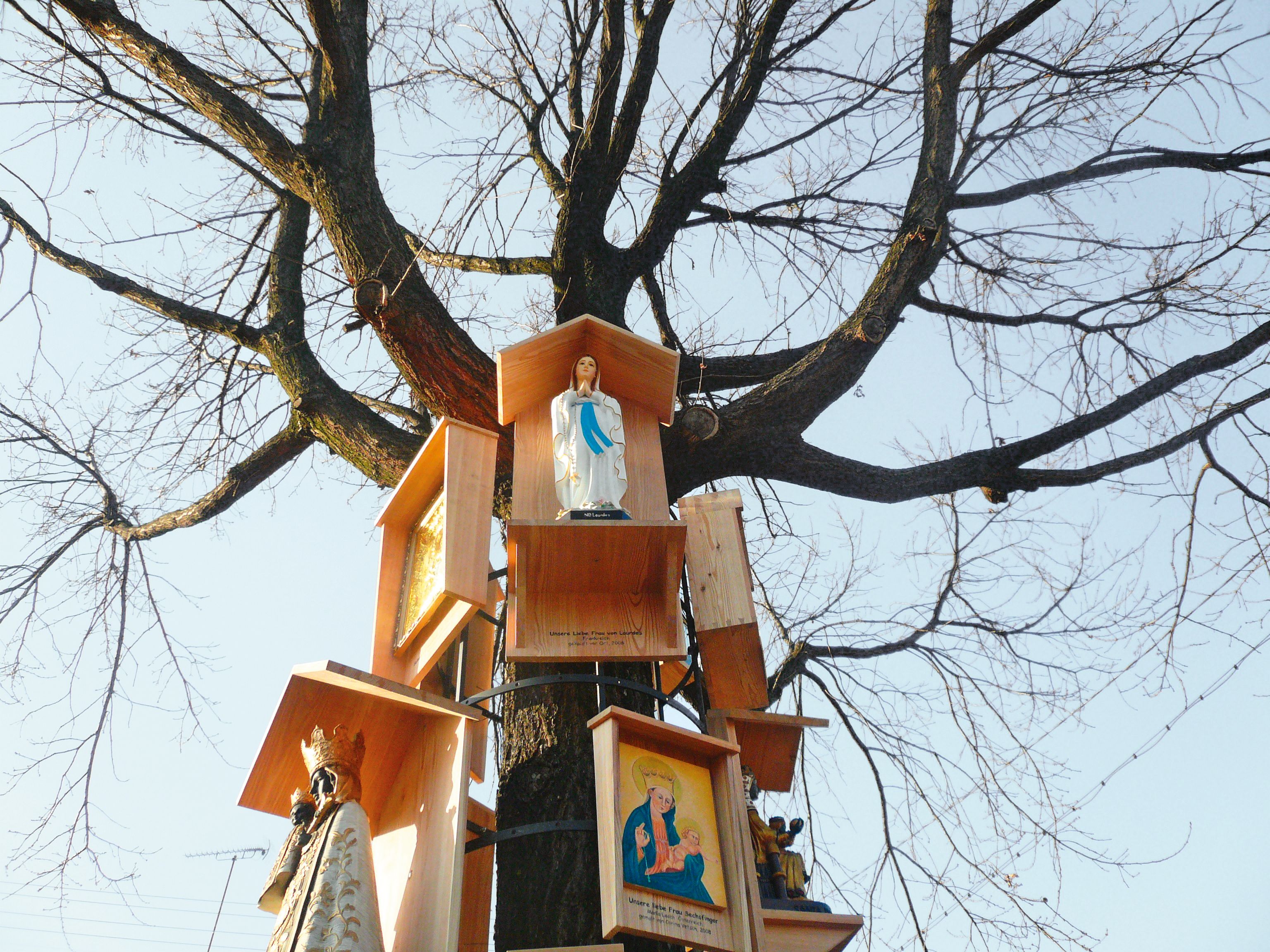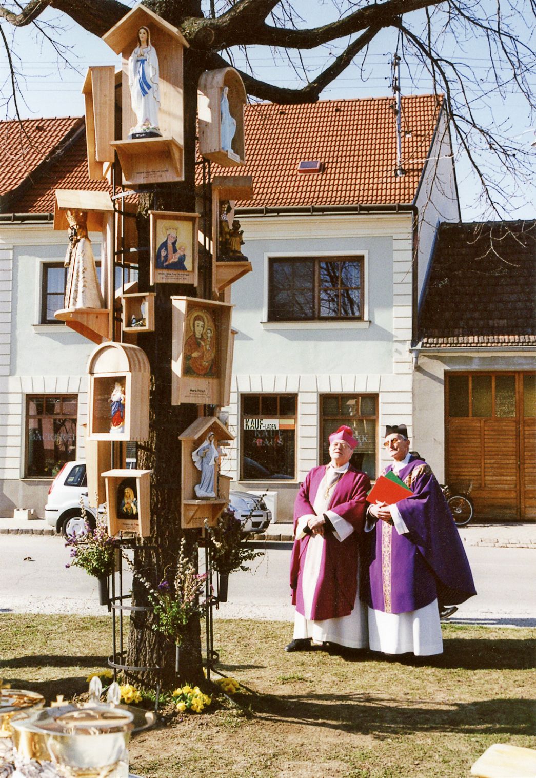 Herrnbaumgarten wanted a statue of the Virgin Mary for a site in a green clearing with a beautiful oak tree in the middle of the community. We purchased replica images and effigies of the Virgin Mary in various places of pilgrimage and grouped them around the tree, citing the rural tradition of bedecking trees with images. The statues and images are protected in cases and with small roofs of larch, and adorned with the name and origin of each replica. Among other locations, we visited Lourdes (France), Montserrat (Spain), Częstochowa (Poland), Altötting (Germany), but also Medjugorje (Bosnia-Herzegovina) and Mali Lošinj (Croatia), i.e. both sites of pilgrimage officially recognised by the Catholic Church as well as unofficial ones. A pilgrimage was also made on foot to Mariazell. The process was comprehensively documented in photographs, film and writing. A book, videos, photographs, stories and paintings were also produced along with the permanent installation.