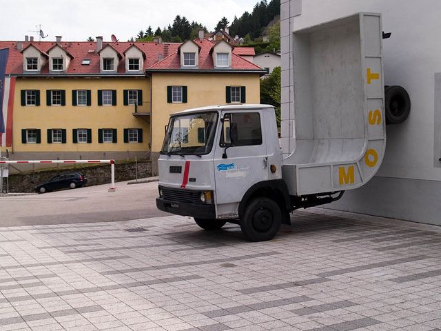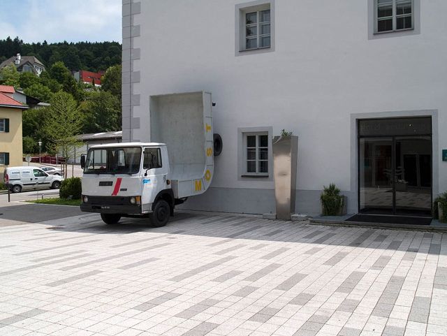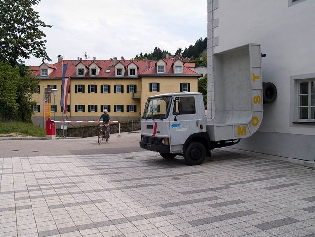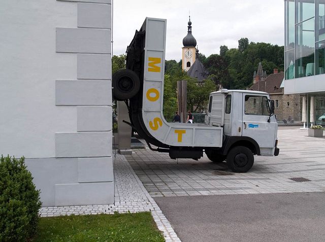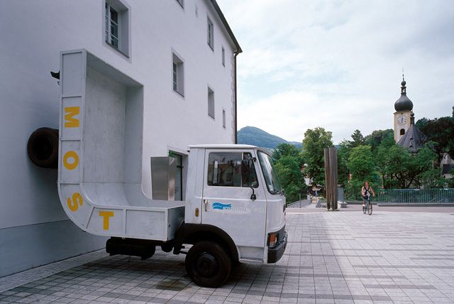 In the 1990s he developed entirely new sculptural forms that lead strongly into the realm of the object. Everyday items, such as cars, frequently lead him to new sculptural lines of thought. Lastwagen or Most (Lorry; Cider) are the banal titles for an object completed for Waidhofen an der Ybbs as part of the Landesausstellung 2007. The irritation of our perception of the everyday is one of the key intentions. Here the heavy goods vehicle (frequently used to transport cider) is bent at a right angle with the trailer pointing upwards. The ironic approach to prefabricated items plays as significant a role as the subversion of physical phenomena, such as gravity. So too, the defunctionalisation of mass-manufactured objects like cars (Fat Car being the title of another work in this context) is a further aspect of the reflection on the object, space and time. The objects look like they plot against standard forms of use of items. Erwin Wurm succeeds in raising the boundaries between the everyday and art, and gaining new perspectives on both in a critical but humorous manner.