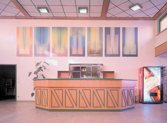The surface on the west wall is structured by seven single paintings that I created in my studio using oil and tempera. The paintings have been mounted on boards and integrated into the wall. Each painting measures 160 x 85 cm so that with a spacing of 12 cm between each painting the whole installation is more than six meters wide.