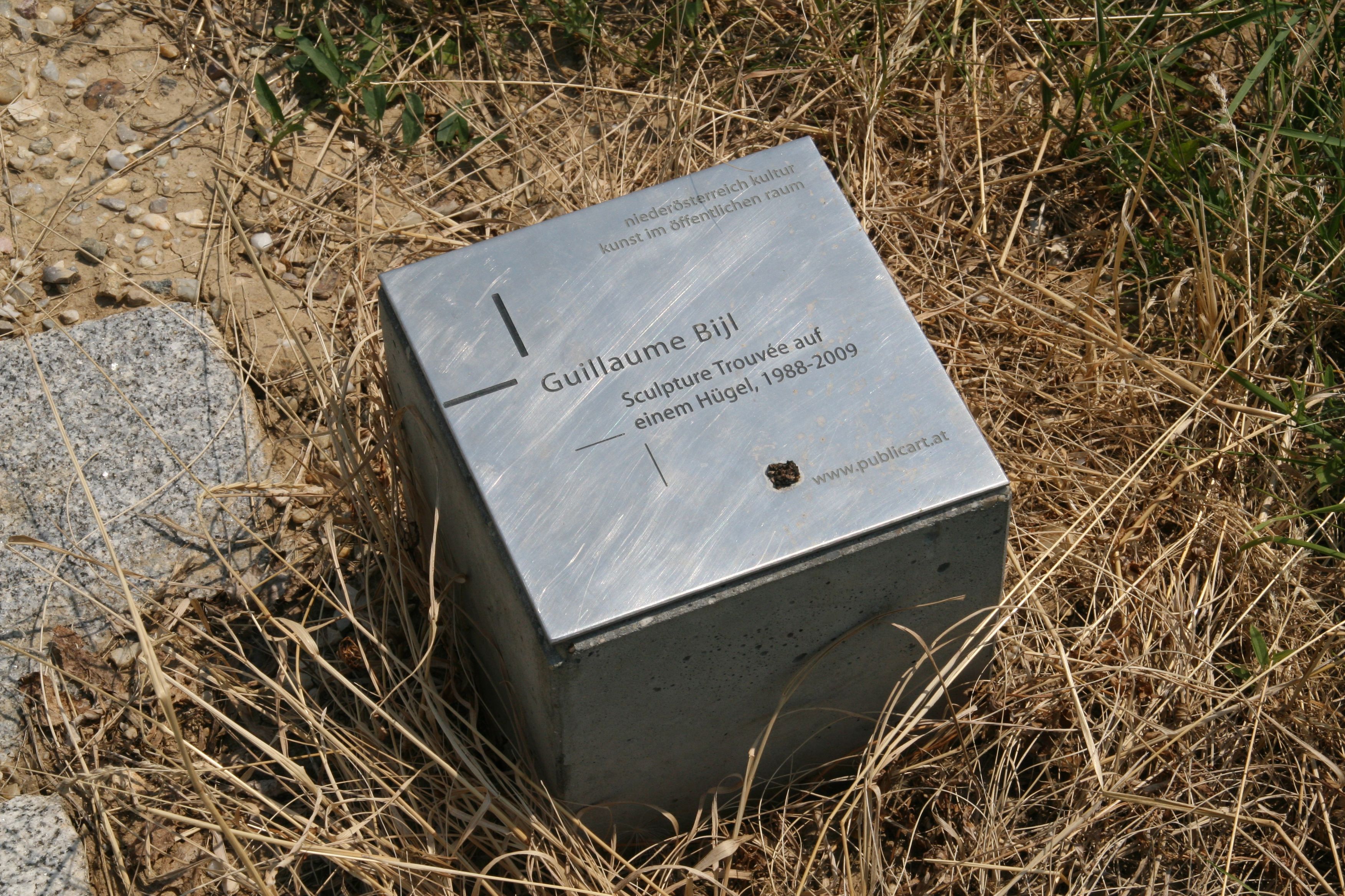 At a suitable distance from the Ladendorf Meditation Walkway there is a work by the Belgian artist Guillaume Bijl, who attracts attention with his astonishing transformative scenarios. The pseudo-historical spaces he developed in the 1990s engage ironically with cultural tourism. When Bijl, for instance, reproduces the room where a composer died, a supermarket or an antiques shop on a scale of 1:1 at a museum the viewer is placed in the unfamiliar situation of having to adopt an archaeological view of the present by the alienating experience of having reality duplicated at an unusual location. The presumed past of the present alienates it as a still life and makes it look like a different, surreal reality. Referencing the terminology of Surrealism, Bijl calls his ensembles 'Compositions trouvées'. The timber hut to be seen on the edge of a field in the Wine Belt is a special kind of Objet trouvé that can also be scrutinised through a telescope. The Sculpture trouvée, on a Hill had been planned back in 1988 for the exhibition Das gläserne U-Boot (The Glass Submarine) at the Tabakfabrik Stein. The work has found an ideal location in Ladendorf at long last. Bijl's artistic process combines the Readymade (a prefabricated garden shed from a D.I.Y. store) with a Tableau vivant (people will sit in the sun in front of the door), and classical sculpture with participatory and performative methods. That the viewer with the telescope can not only observe the apparently insignificant shed but also the Buschberg military radar station is an additional subtle joke by this ironic and witty artist.