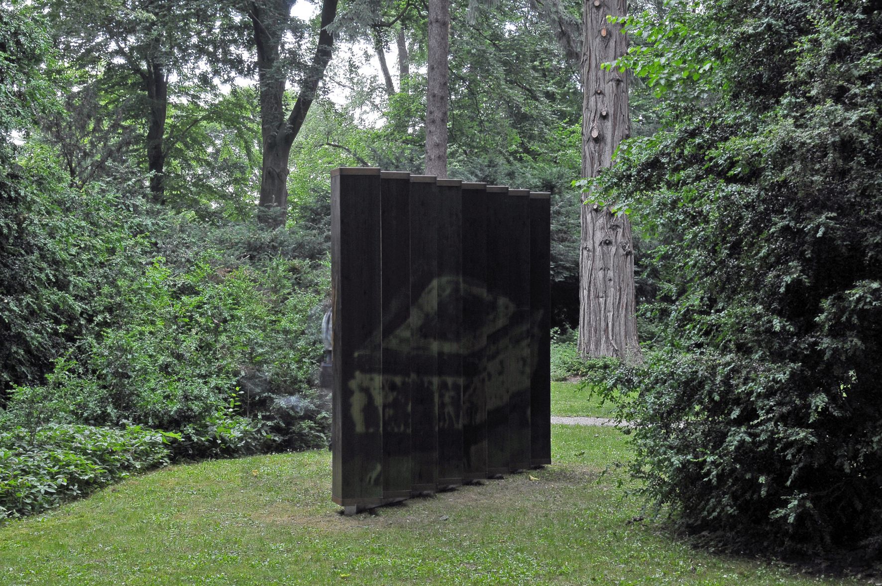 The sculpture titled Beyond the Horizon was created by the sculptor Gor Chahal for the park of Melk Abbey, and is situated in a clearing between bushes. The sculpture bears the same title as the nine-part temporary photographic installation by the artist in the abbey's church. In both locations different things are shown as if they were lying behind an imaginary horizon to suggest a reality beyond empirical experience to the viewer, as a metaphor. The artist achieves this by using a special lens on the camera that reverses the perspective view in a manner familiar from medieval depictions. For the sculpture in the park Gor Chahal photographed four key objects from the abbey's museum using this lens: a 15th century travel breviary, an 11th century portable altar, the chalice from which, according to legend, St. Benedict should have drunk poisoned wine, and a hand as a metaphor for the indication of direction and love. The photographs were dyed with four key colours from the abbey museum spaces, cut into strips and then each pressed onto wooden posts set at an angle.