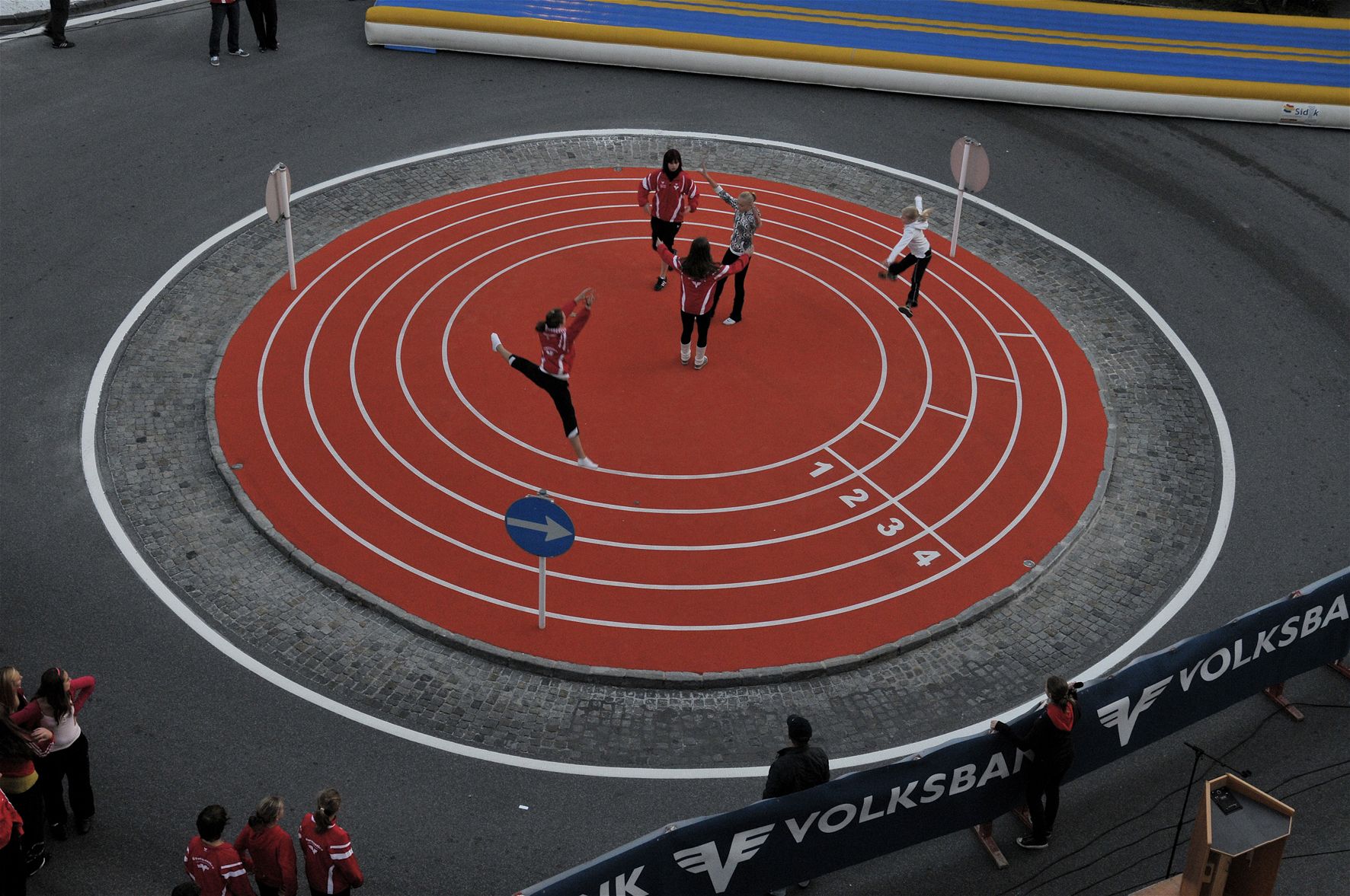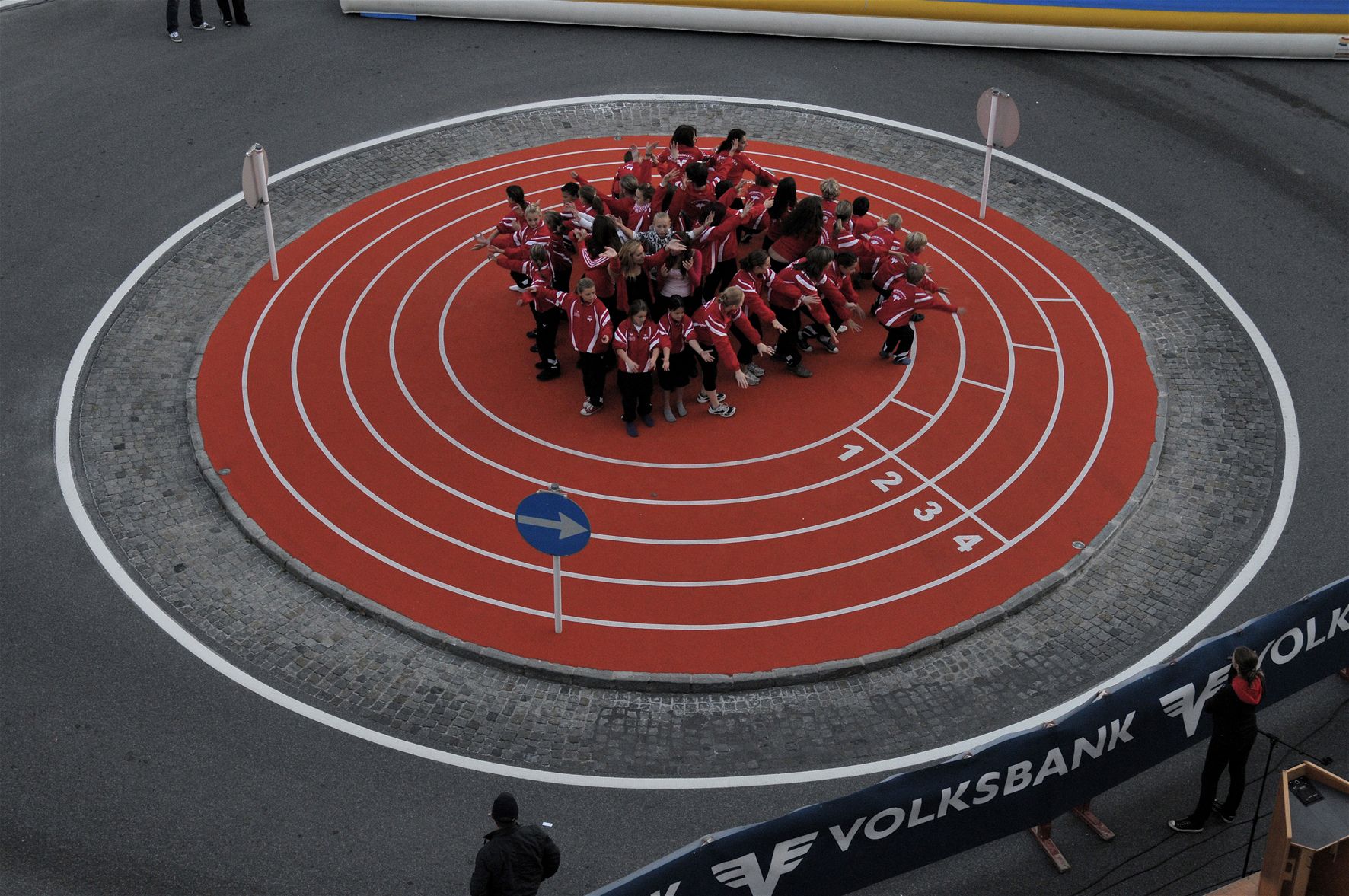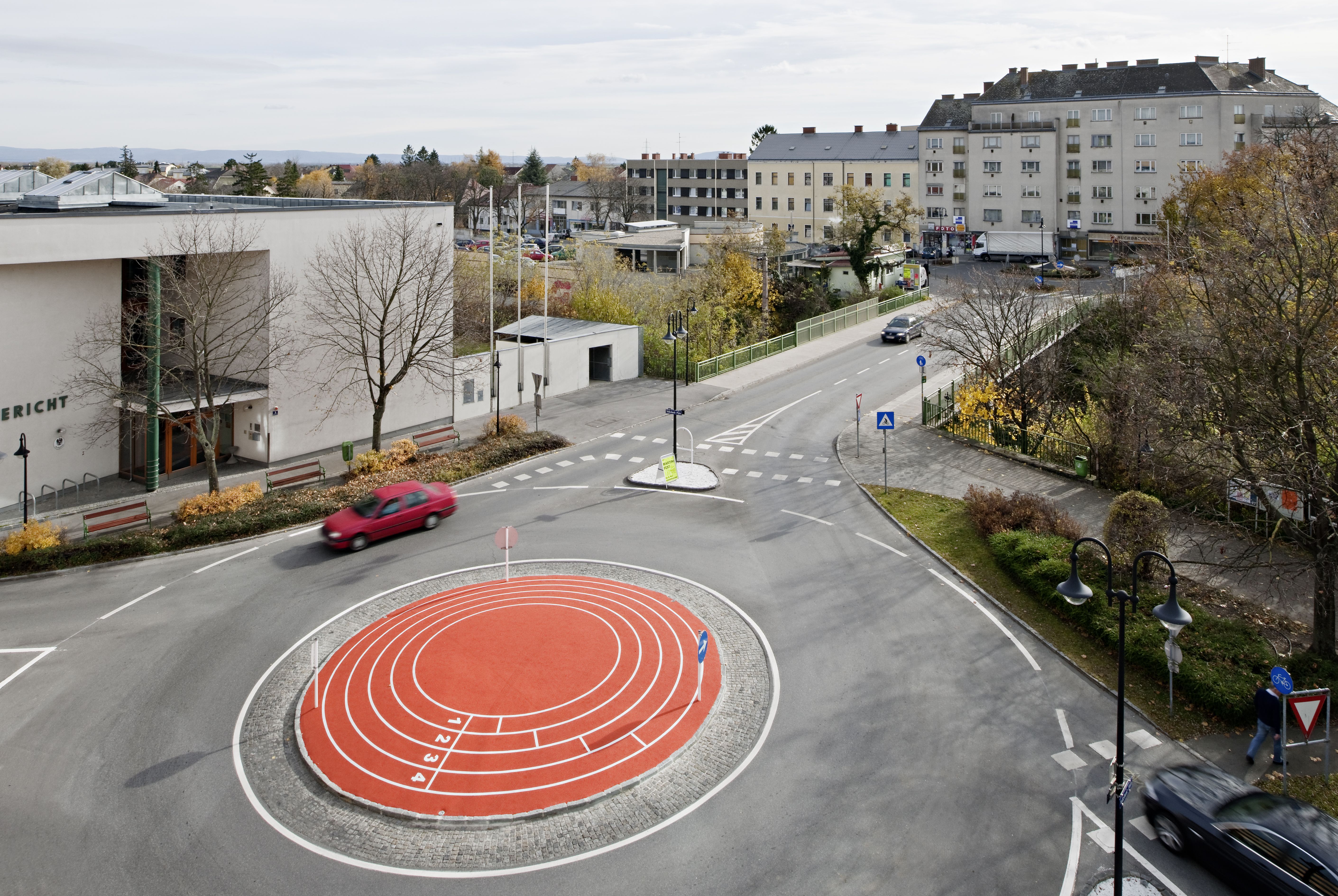 Four racetracks complete with start and finish lines have been laid out on the Volksbank-Platz roundabout in the orange plastic surfacing usually used for sports fields. The work is not only titled Roundabout, it is literally what it does when continually stretching circular lines are continued from the tracks in the middle of the roundabout in the lines of the road markings. With this, Ulrike Lienbacher provides the square with an integrative element while deliberately avoiding the usual separation of a dead space in the middle from the surrounding flow of traffic. A dome that undergoes a difference in height of 70cm from the highest point in the middle to road level is defined in the centre as a sculptural volume, one that provided a stage that was well received by the local athletics society for a public display at the opening. In addition, one could however also understand it as a platform for Lienbacher's own works. Her drawings, photographs and objects engage with generally applicable experiences related to sports, physical achievement or disciplining. Hula-hoops, athletes and youthful gymnasts find a surface for Lienbacher's projected constructions for the body in the oversized disc, which is itself just such a construction.