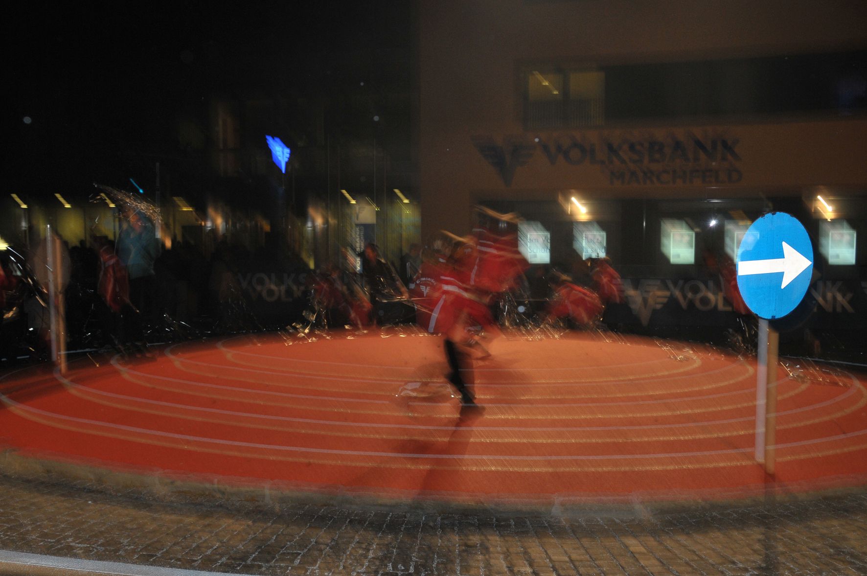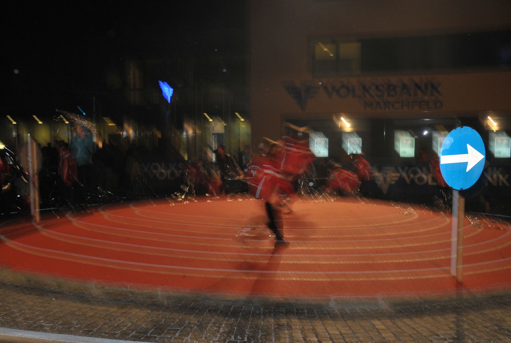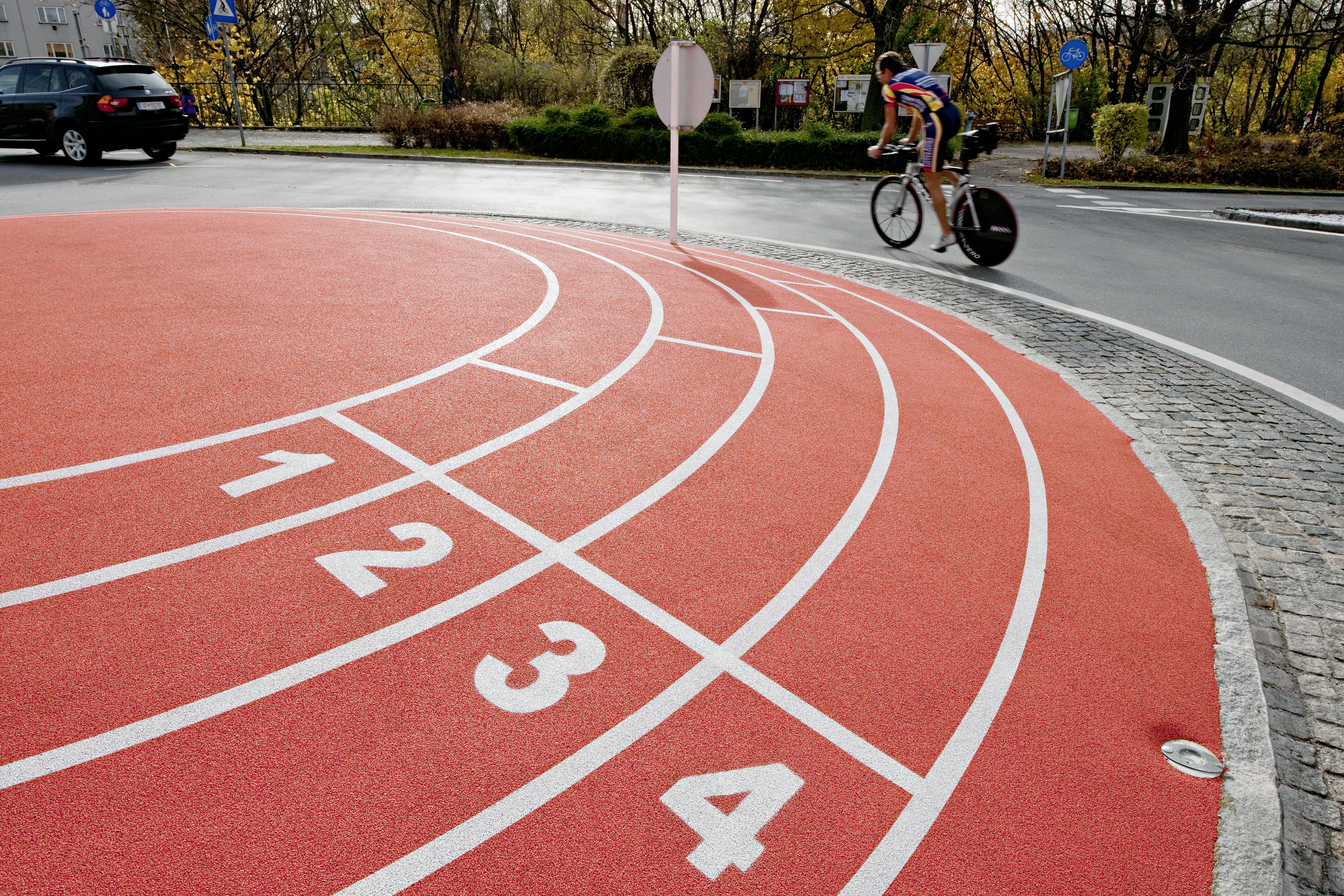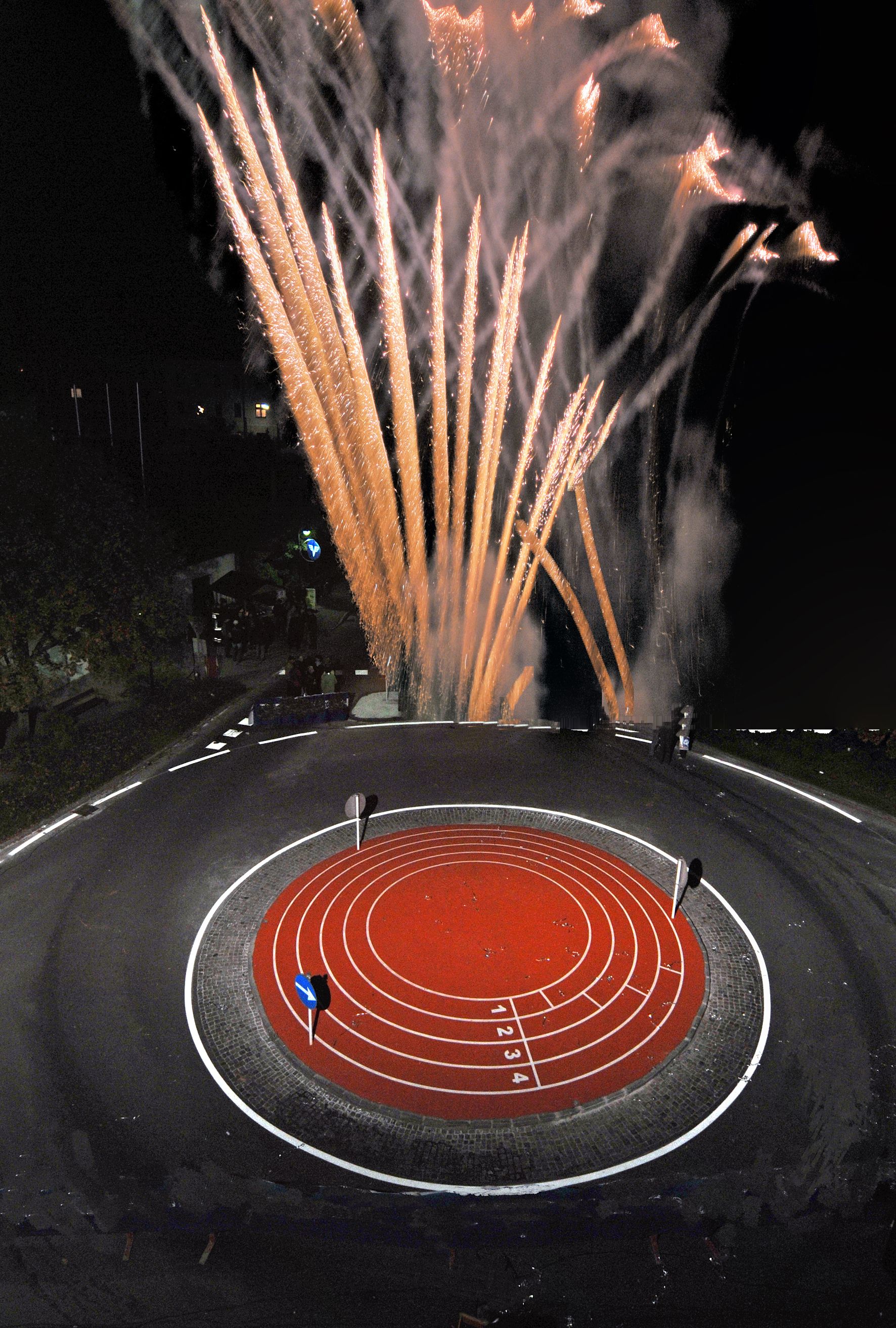 Four racetracks complete with start and finish lines have been laid out on the Volksbank-Platz roundabout in the orange plastic surfacing usually used for sports fields. The work is not only titled Roundabout, it is literally what it does when continually stretching circular lines are continued from the tracks in the middle of the roundabout in the lines of the road markings. With this, Ulrike Lienbacher provides the square with an integrative element while deliberately avoiding the usual separation of a dead space in the middle from the surrounding flow of traffic. A dome that undergoes a difference in height of 70cm from the highest point in the middle to road level is defined in the centre as a sculptural volume, one that provided a stage that was well received by the local athletics society for a public display at the opening. In addition, one could however also understand it as a platform for Lienbacher's own works. Her drawings, photographs and objects engage with generally applicable experiences related to sports, physical achievement or disciplining. Hula-hoops, athletes and youthful gymnasts find a surface for Lienbacher's projected constructions for the body in the oversized disc, which is itself just such a construction.