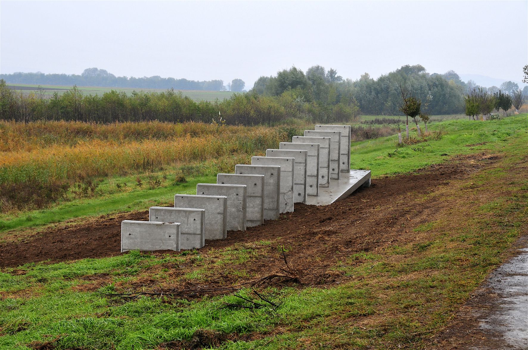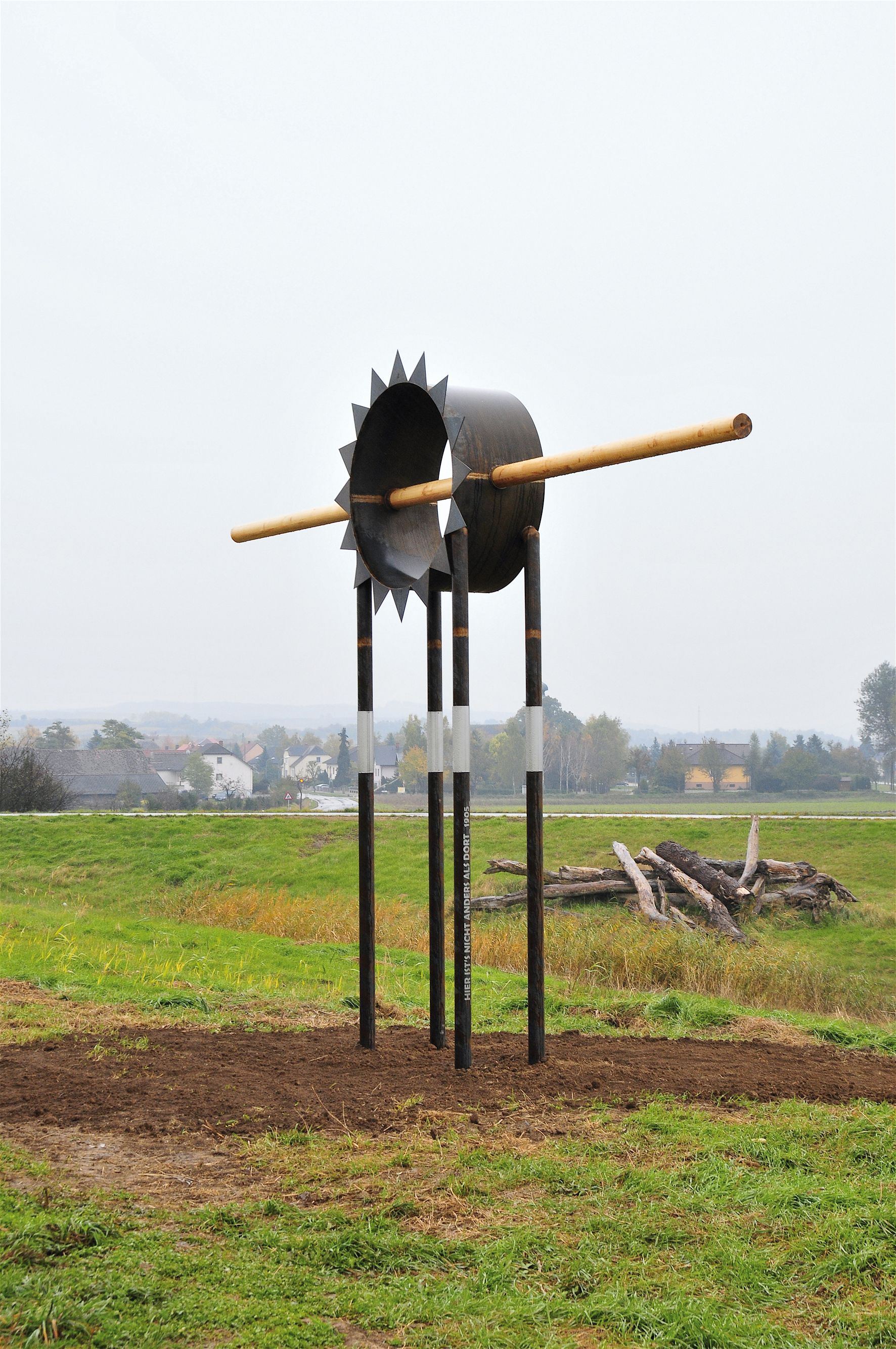 Denkmal für die Wassermühlen (Memorial for the Water Mills) references both the history of the Schmidatal valley as well as its current use as a recreation area. The elements of the memorial set along a path — the gearing, the cog wheel canopy and lamp — reassemble the vanished water mills of the Schmidatal as mosaic pieces.