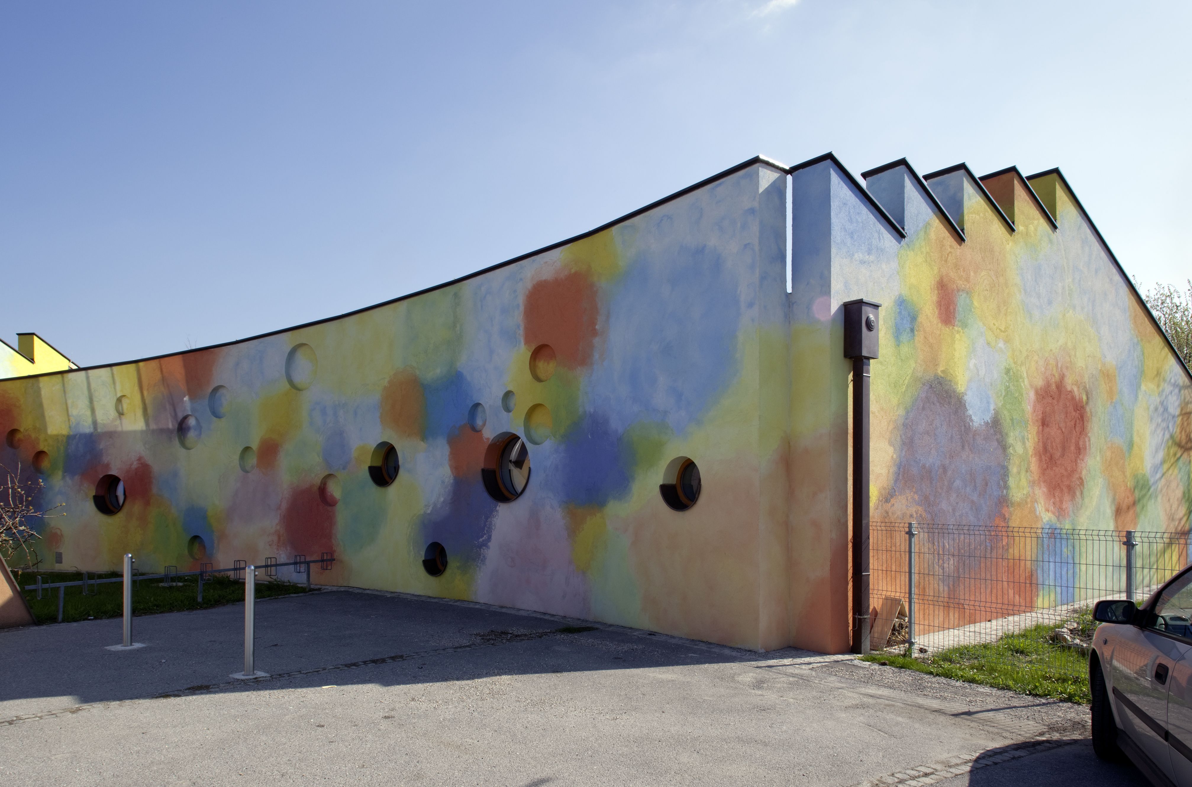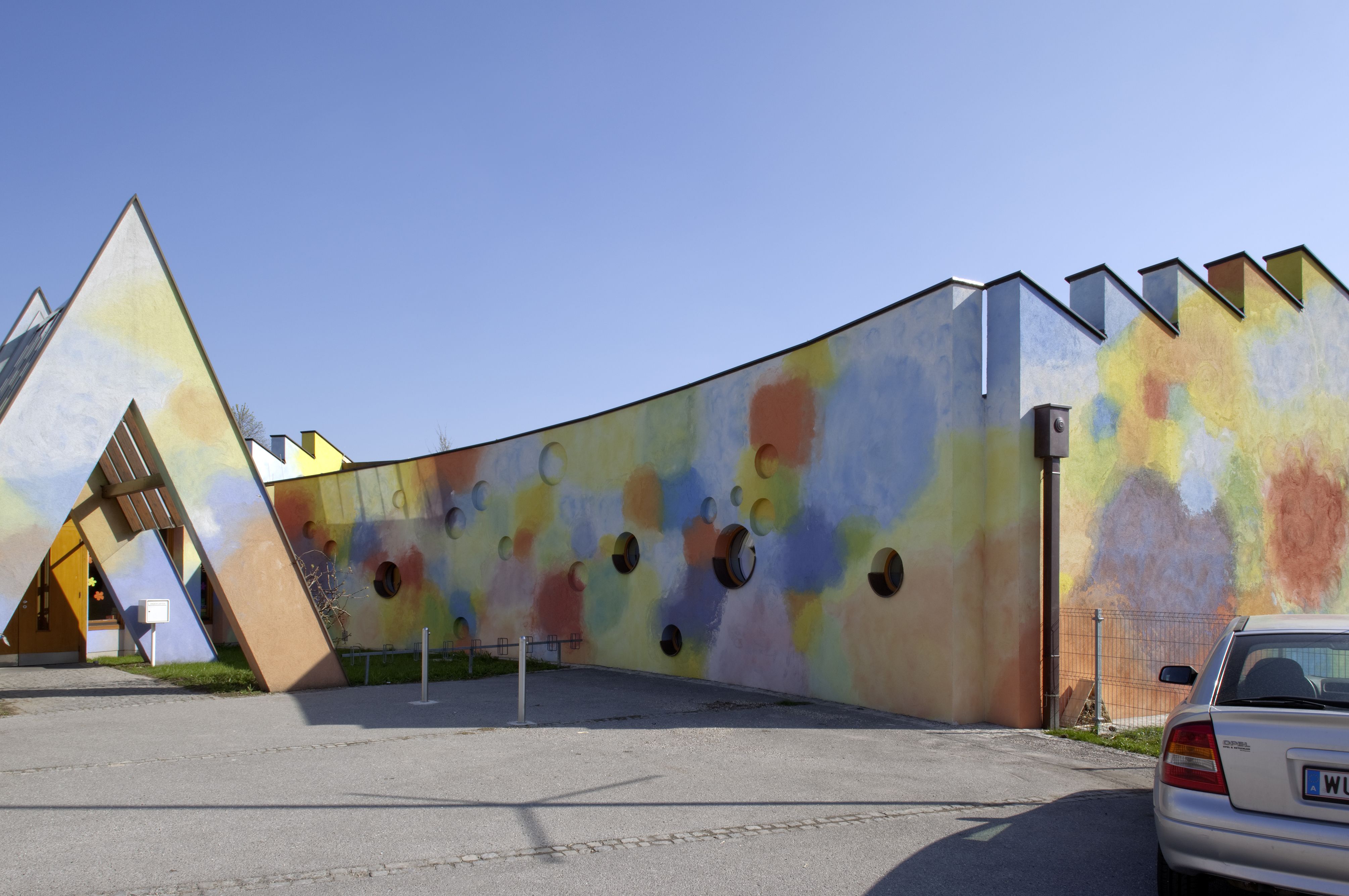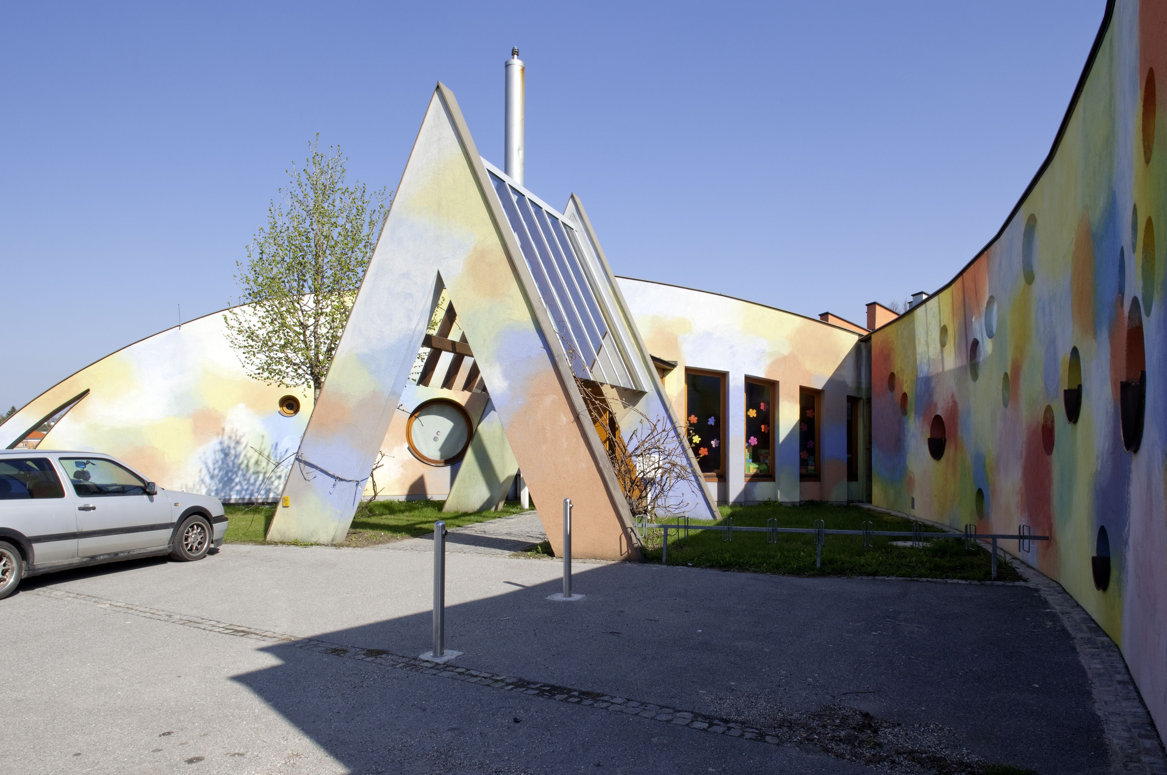 The kindergarten was built in 1993 according to designs by the artist duo K.U.SCH. In 2008 they also conceived the extension of the building and the floor plan developed in collaboration with the architect Ernst Mrazek was extended. The sculptural volume was created in-line with their artistic agenda of transgressing medial boundaries and integrating the classical artistic disciplines.