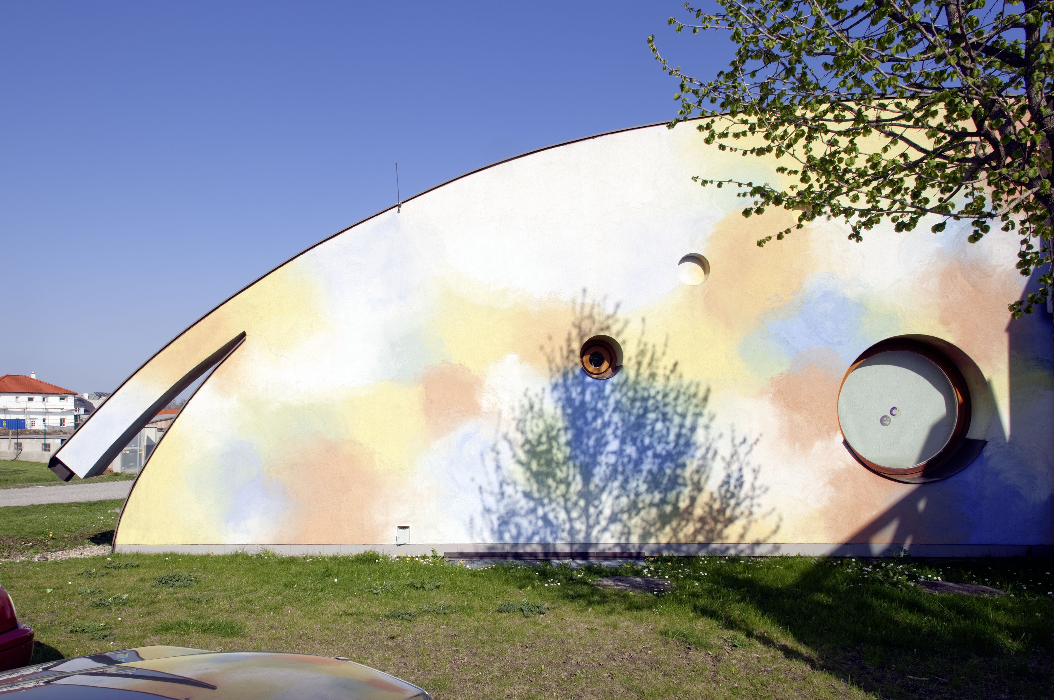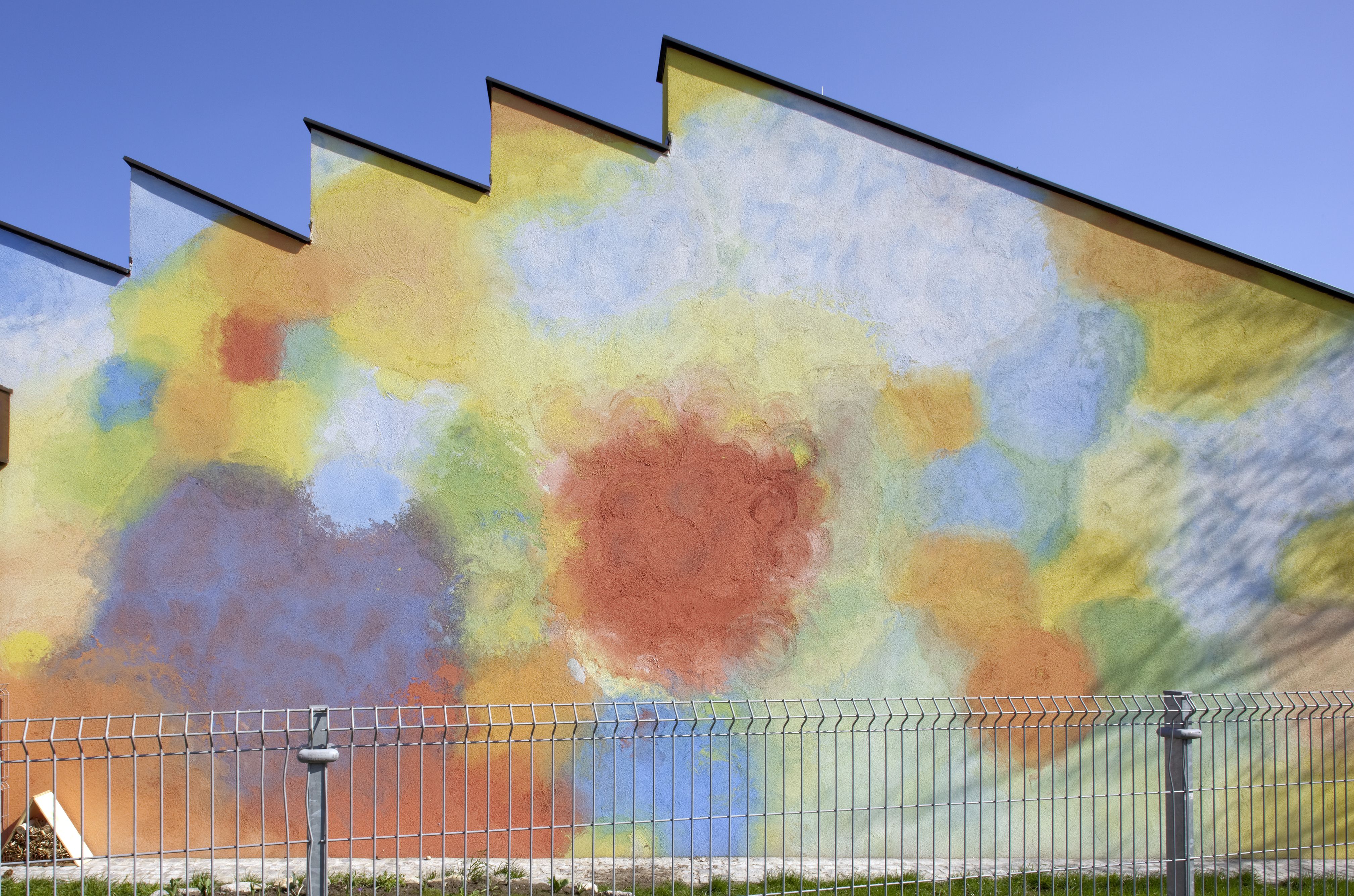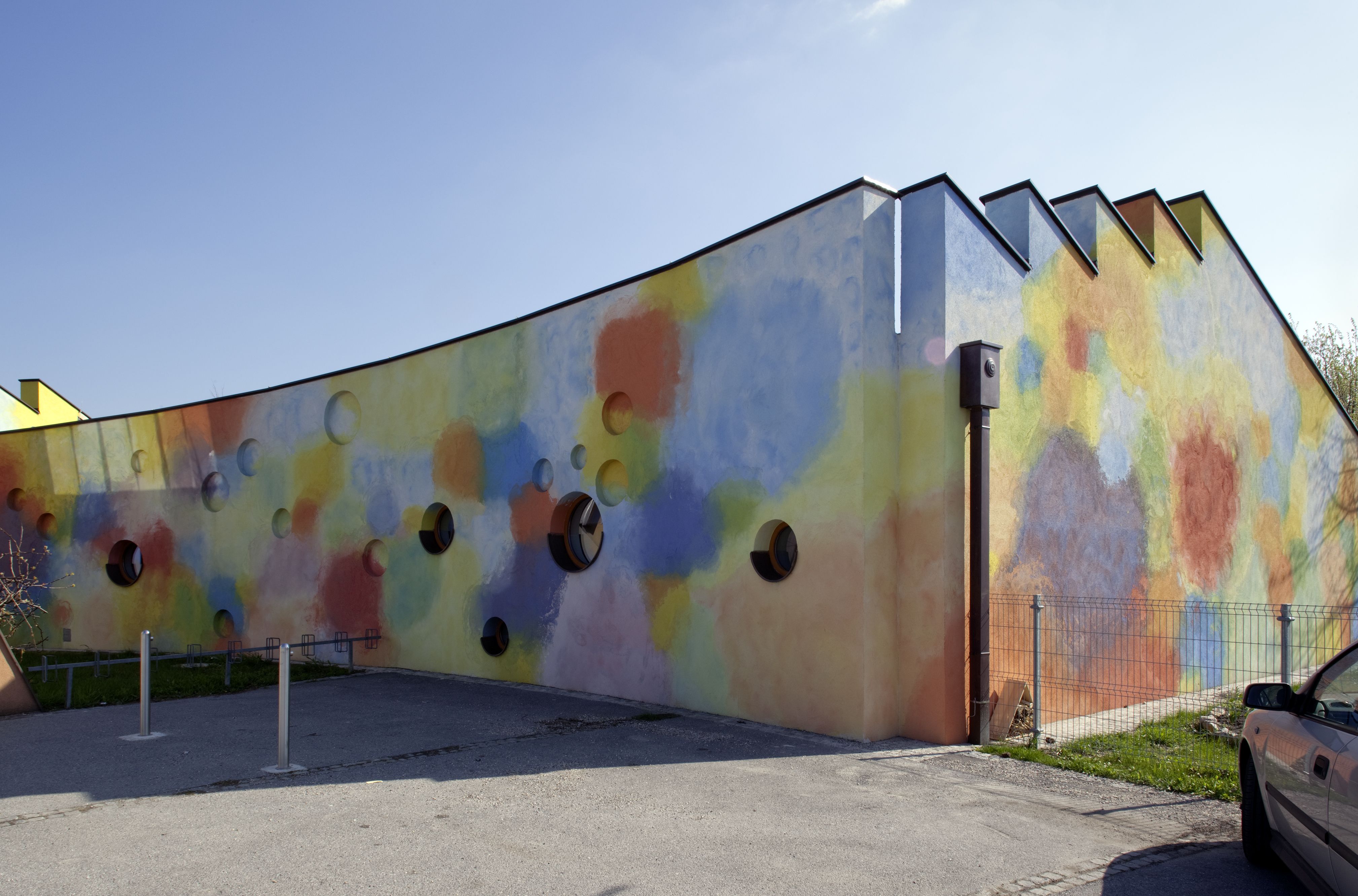 The kindergarten was built in 1993 according to designs by the artist duo K.U.SCH. In 2008 they also conceived the extension of the building and the floor plan developed in collaboration with the architect Ernst Mrazek was extended. The sculptural volume was created in-line with their artistic agenda of transgressing medial boundaries and integrating the classical artistic disciplines.