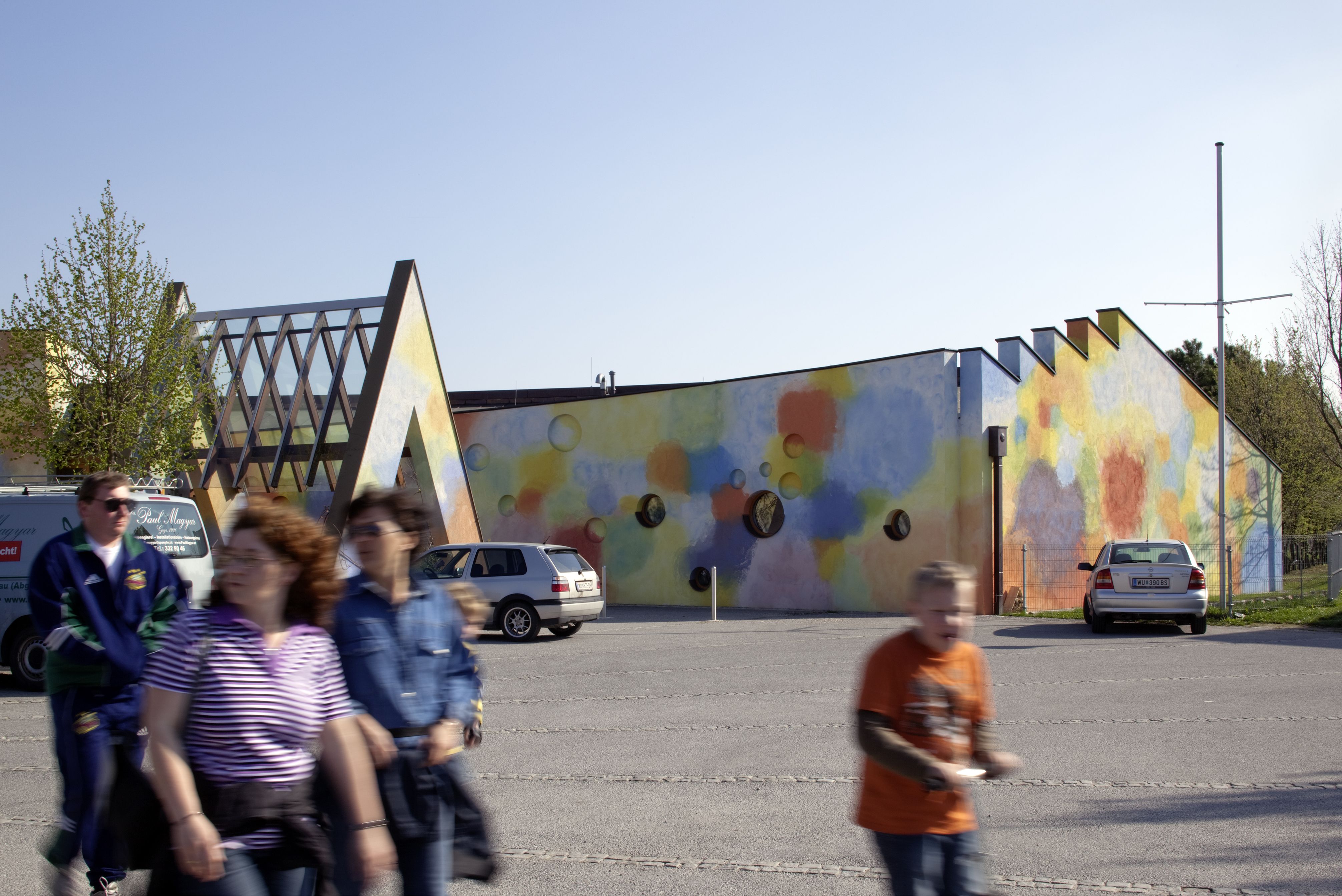The building complex housing the primary school and kindergarten in Gerasdorf-Kapellerfeld had to be extended for a second time. The artist group K.U.SCH. had designed the forecourt in 1989. In 1995 an extension had also been built according to a concept by K.U.SCH., and a new extension had become necessary once again in 2008. The first extension had already developed in a dialogue with the existing substance by the architect Ernst Mrazek. This time, too, K.U.SCH. have adopted basic elements, and evoke memories of the shapes and colouring of the old Anker building-block boxes with their project. Geometric shapes, like the circle, semicircle, triangle and square, along with the colours rust red, light ochre and a soft light grey define the object. The angle of the roof is adopted and continued for the positioning of the band of windows in the new building. Arches are quoted, turned around and placed in an ironic tension with the older elements of the building. Nothing is mere design; the entire volume is always taken into consideration and its exterior appearance made to harmonise with its functionality. Window openings are stamped into the façade as required — like a building set for kids. The design of the extension is strongly reminiscent of the early work phase of K.U.SCH., which was characterised by undercurrents of geometric abstraction. So too, similarly, respect for the architectural theories of Adolf Loos can also be felt. Formal reduction, symbolic validity and a clear colour scheme leave a great deal of leeway for the children's imagination.