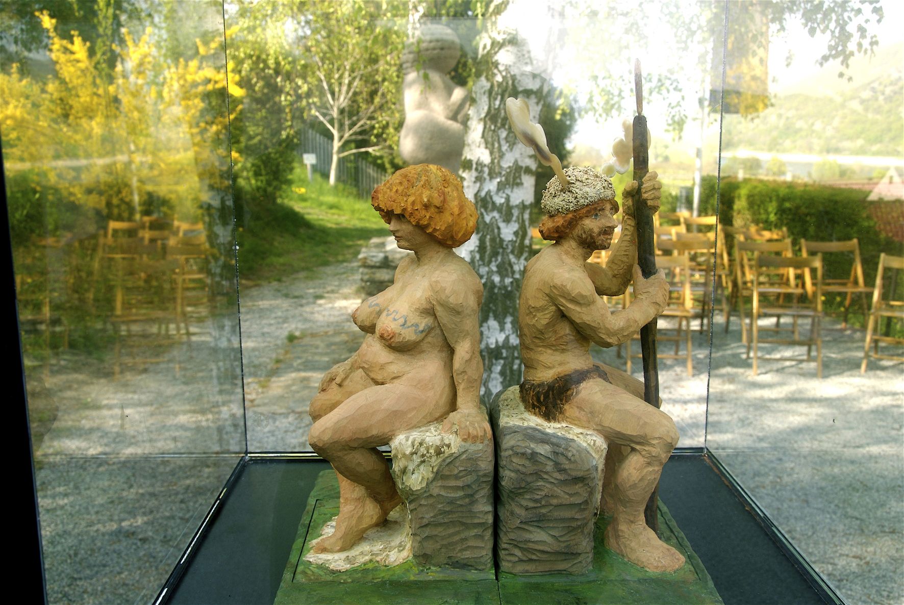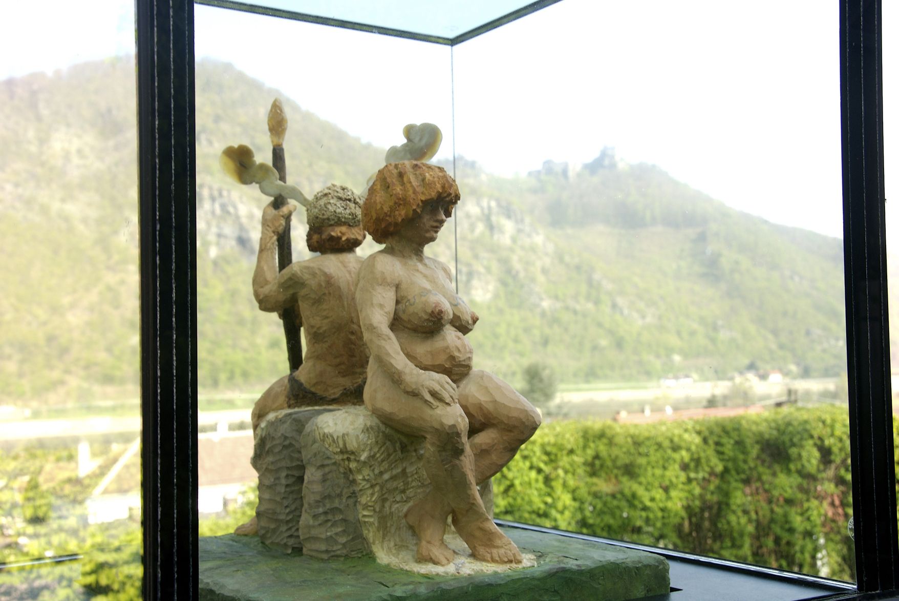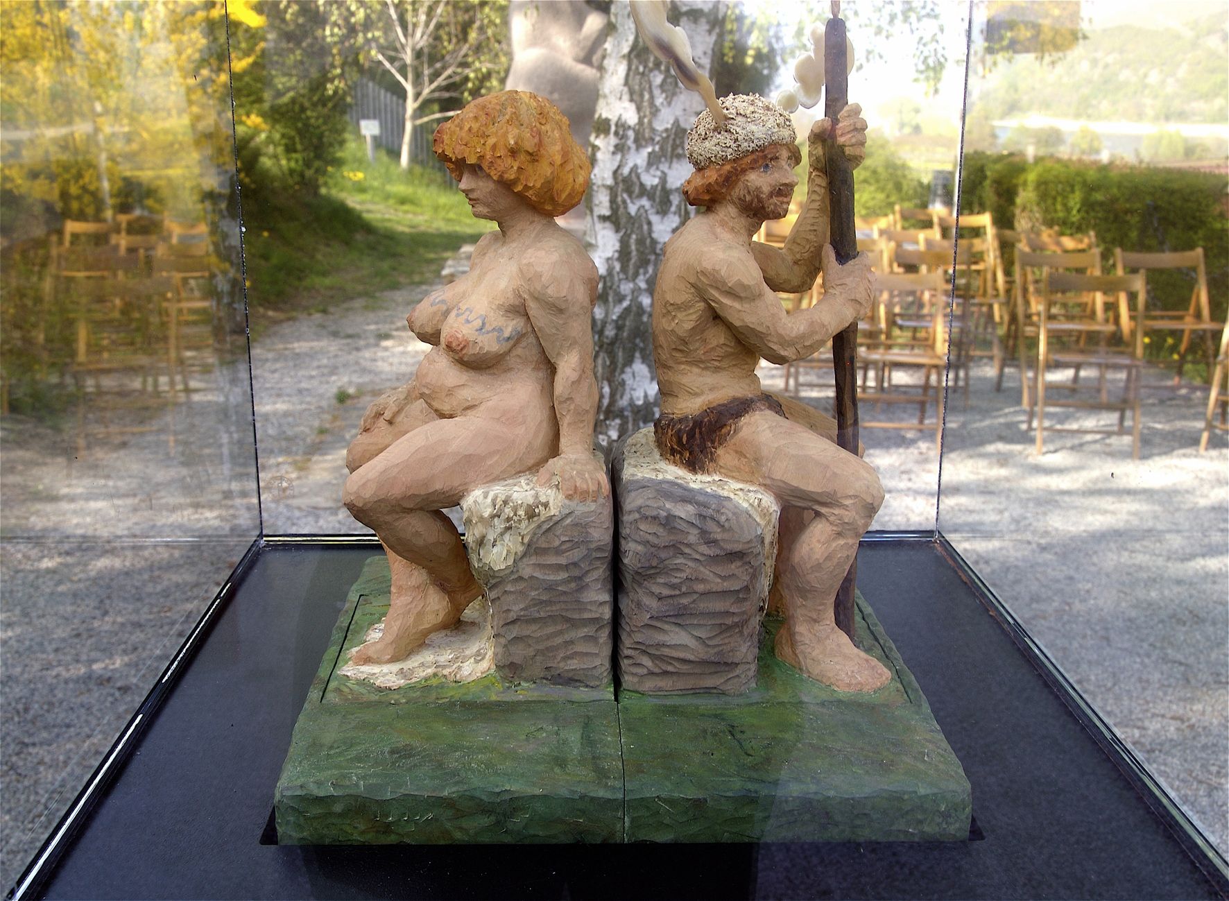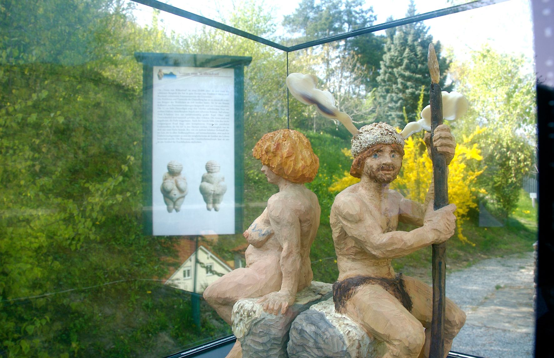 One thing that the figure is certainly not is a 'Venus', which stems from an entirely different geographical region and a different culture's mythology. Whatever the truth here maybe, by placing a partner at the female figure's side, Karin Frank has presented an interesting hypothesis on Palaeolithic Stone Age gender relations, and so aimed in a social direction. Her 'Adonis' has all of the attributes of an athletic hunter with his horn-tipped spear and apotropaic helmet. Her new 'Venus' has been given muscular arms in place of stunted insect-like little arms, and her legs have feet, and in contrast to the faceless original she has an alert gaze, which characterises her as a potentially proactive woman, as a subject instead of an object.