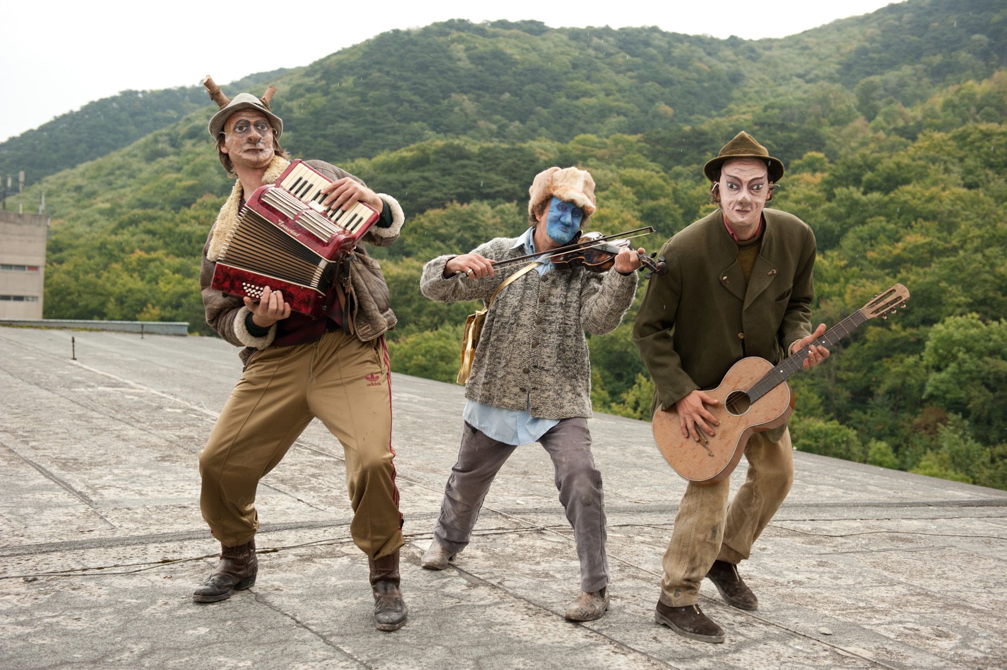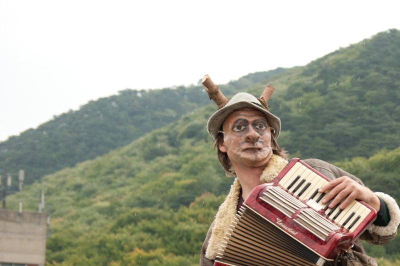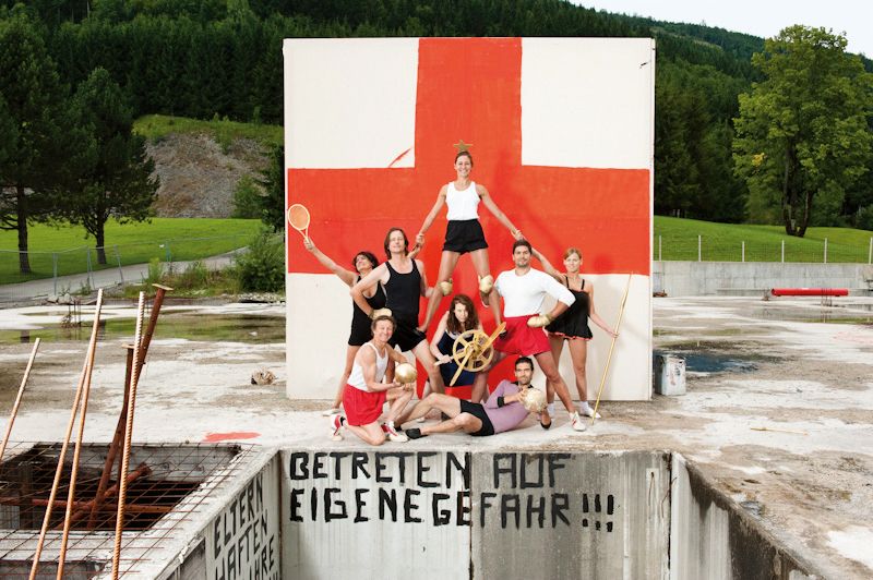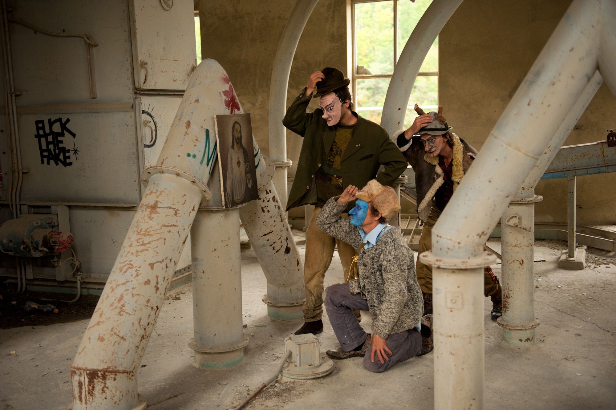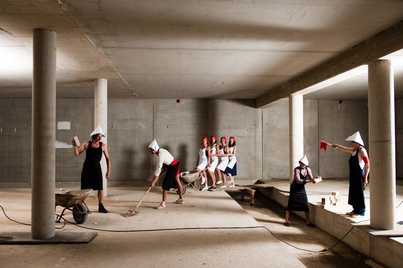 101 years after the publication of the Futurist Manifesto the aim was to have a look at the social changes of the 20th century that are tied to technological changes, and to develop a counter-model to the former fascination with acceleration and the power of machines. From the instruments to the decoration, everything was created on location applying Petlura's well-known mania for the re-use of found material. Daily performances by the group, who emerged and then disappeared during the course of the festival, announced the event, which was finally held on and in a car park that had remained a skeleton in the centre of town for years. In three acts, the audience was led via an organ concert in the church to the venue, which the Industrieorchester turned into a body of sound. Tableaux Vivants received the audience in the basement of the building, and moved into speech theatre that parodied the hysteria of the consumer society. Finally, with a dance performance that evoked cleaning rituals, the route led back outdoors — "back to nature".