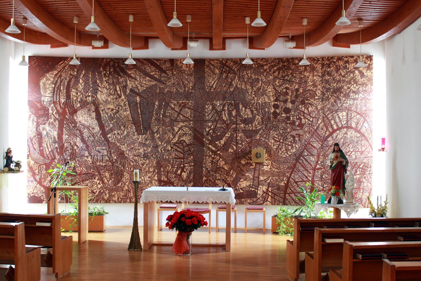 The altar painting relates the story of salvation. The onlooker can interpret this story while meditating on the basis of the “formless” abstract structure. Let there be light, life emerges, creation becomes visible… The redeeming cross in the center connects the Old and New Testaments. The onlooker can grasp the story of salvation in a creative way in this picture mural. With his fantasy he sees the act of creation, images from the Old and New Testament. Through this meditative interpretation and viewing, the onlooker is led to God.