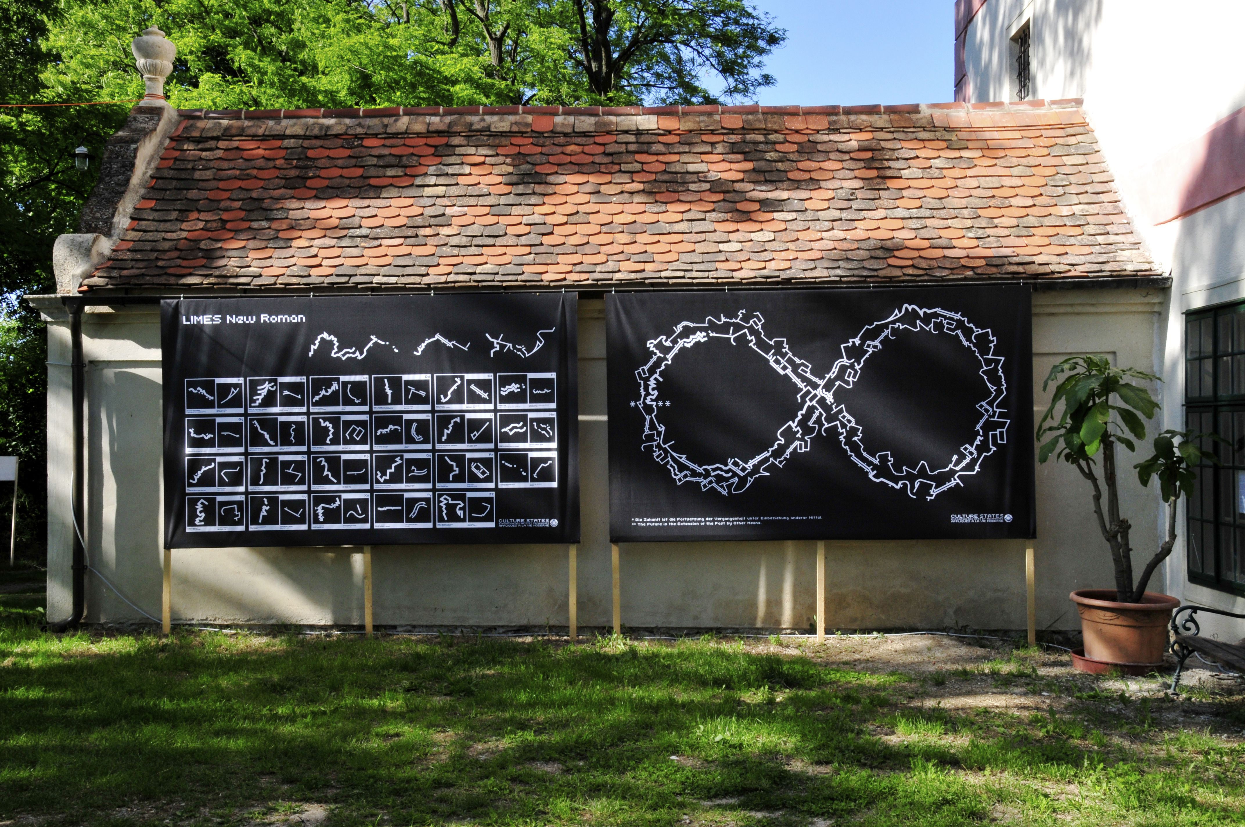 A syntax of the border unfolds in the two billboards LIMES New Roman and Die Zukunft ist die Fortsetzung der Vergangenheit unter Einbeziehung anderer Mittel (The Future is a Continuation of the Past by Other Means), 2009, by the Paris based artist duo Société Réaliste (Jean-Baptiste Naudy and Ferenc Grof). The artists used a self-invented alphabet for the quotation, the cryptographic LIMES New Roman, in which they used the lines of borders for the letters. The idea is based on the Utopiensium Alphabetum by the former law student Thomas More, and forms a referential system for the many historical and current borders that is both literal and metaphorical — from the limes of the Roman Empire via the iron curtain and the Berlin Wall to the barriers in Belfast, Macao etc. The encrypted quotation in the analemmatic form is a reference to the frequently used sentence ascribed to the military theorist Carl von Clausewitz: "War is a continuation of political relations by other means".