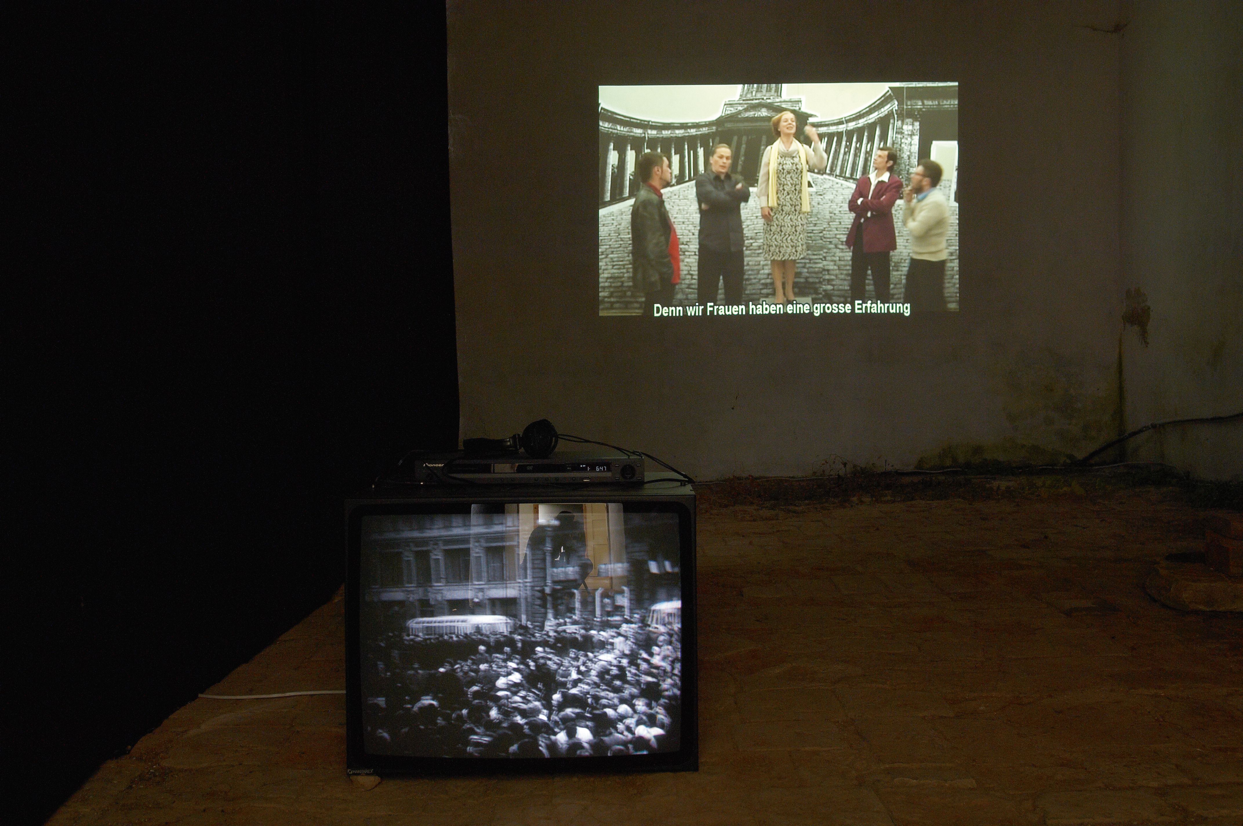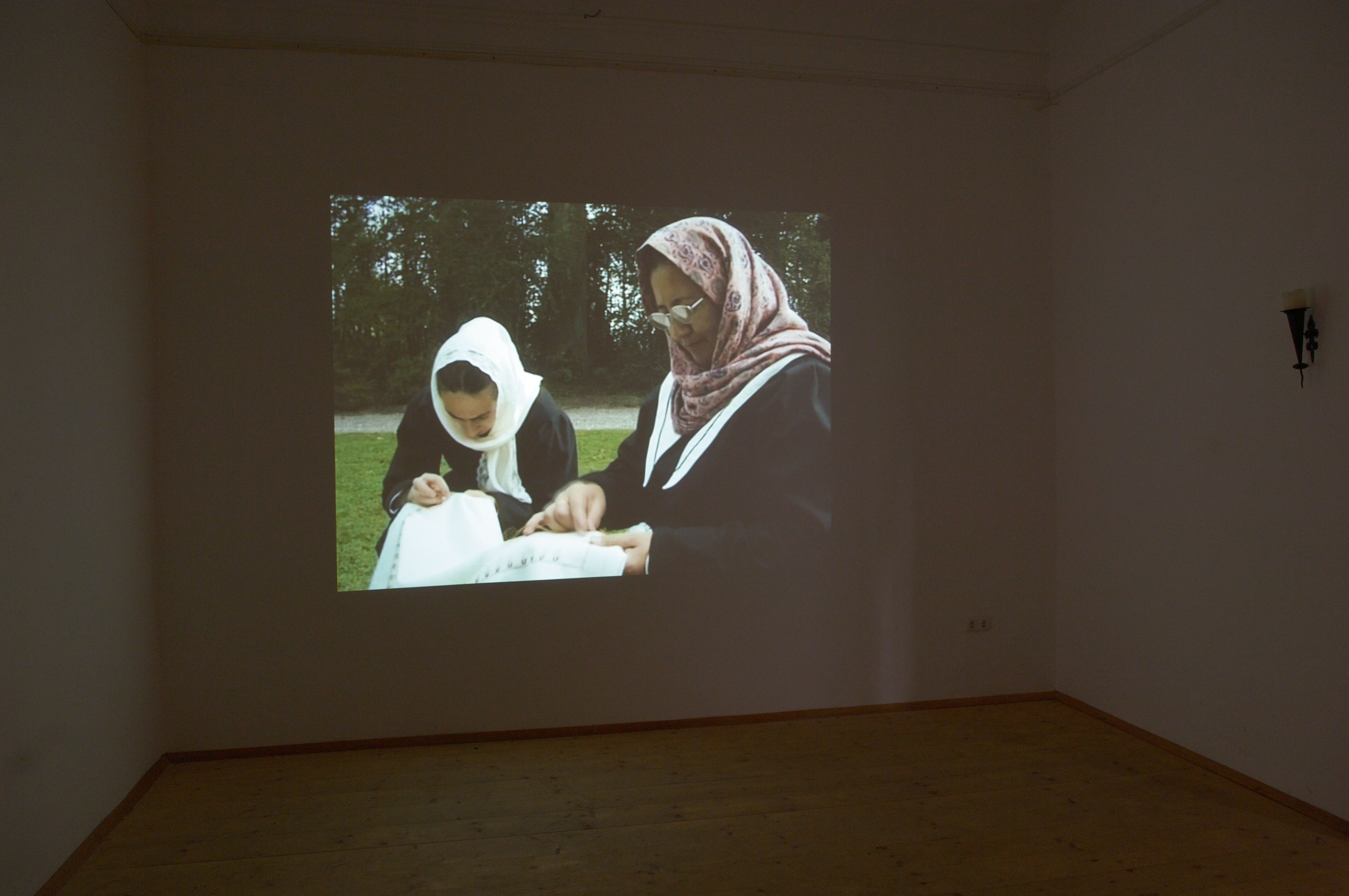 Isa Rosenberger and the Sarajevo born artist Maja Bajevic address the war in Yugoslavia in their works, showing the traumas and wounds of generations. The three-part Women at Work cycle is a complex attempt to approach and engage with the Yugoslavian War for Maja Bajevic featuring refugee Bosnian women. The locations are the scaffolding erected for the rebuilding of the National Gallery in Sarajevo (Under Construction, 1999), Château Voltaire in France (The Observers, 2000) and a Hamam in Istanbul (Washing Up, 2001). The women's handwork is transferred to different places and new contexts — washing ideological slogans from Tito in the Hamam until the clothing disintegrates. A group image results that is inspired by Frans Hals, and can also be read as an allusion to the failure of the Dutch security forces as UN observers in Srebrenica in July 1995. Isa Rosenberger shows her research on the traumatised population in Sarajevo in the 30-minute video Sarajevo Guided Tours (2002). A prologue shows TV excerpts from The Sarejevo Tunnel by Edis Kolar from the time of the besieging of Sarajevo in May 1992, before eight people that Rosenberger had met during a prolonged stay in Sarajevo in 2001 introduce eight places in the city. A different kind of guided tour is designed on the basis of their accounts that shows how life in the city is still marked by the images of siege and destruction. The individual sequences succeed one another like a tour of the city where Rosenberger pursues the question of how places are generated between city, history and individual viewpoints.