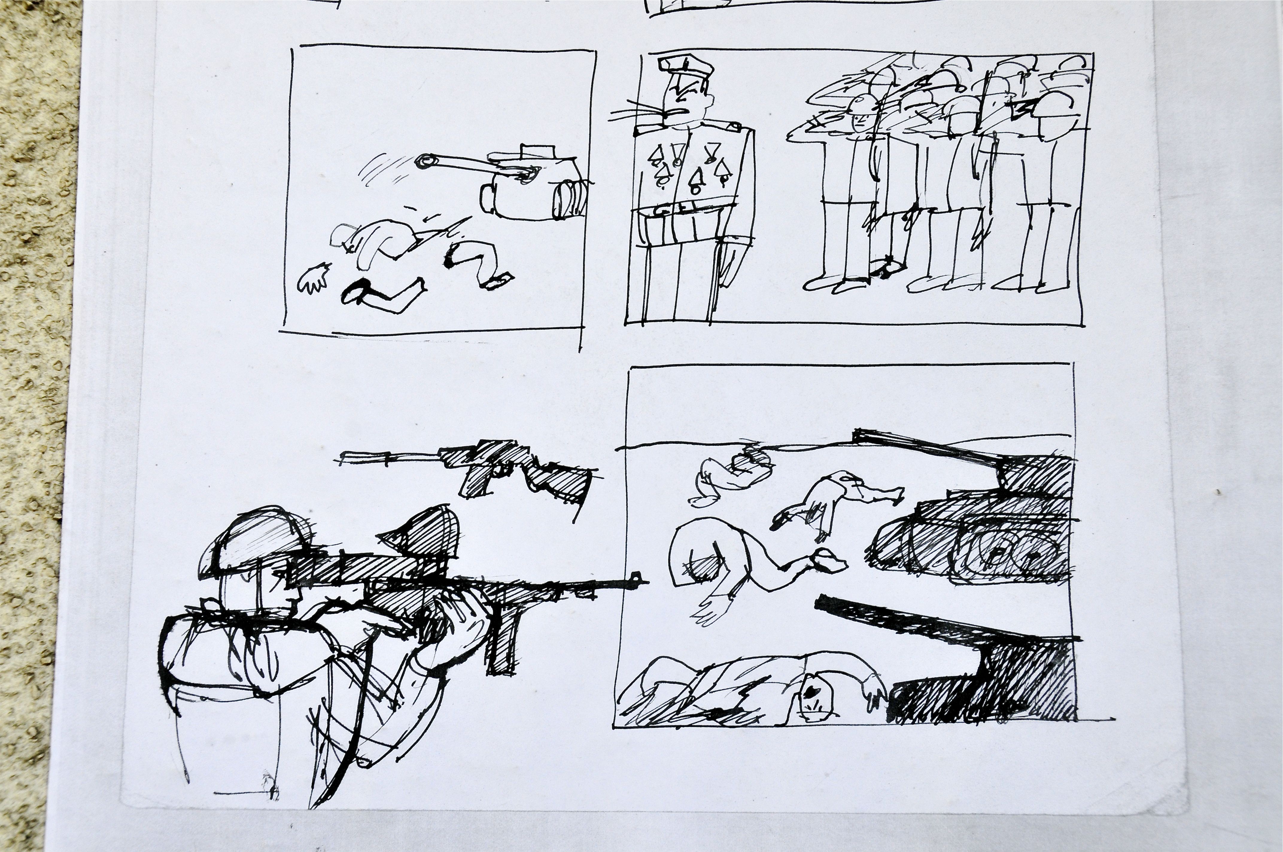 Christa Biedermann satirises the arms industry and military service in her comic-like mural drawing Antimilitarismus-Comix (1979/80) from the perspective of the Austrian feminist peace movement of the 1970s. As an activist in a feminist-orientated peace movement, Frauen für den Frieden (Women for Peace), Christa Biedermann addressed the public in the 1970s with various projects. In her pen and ink drawings, which are designed like comic strips, she addresses the arms race and the Cold War.