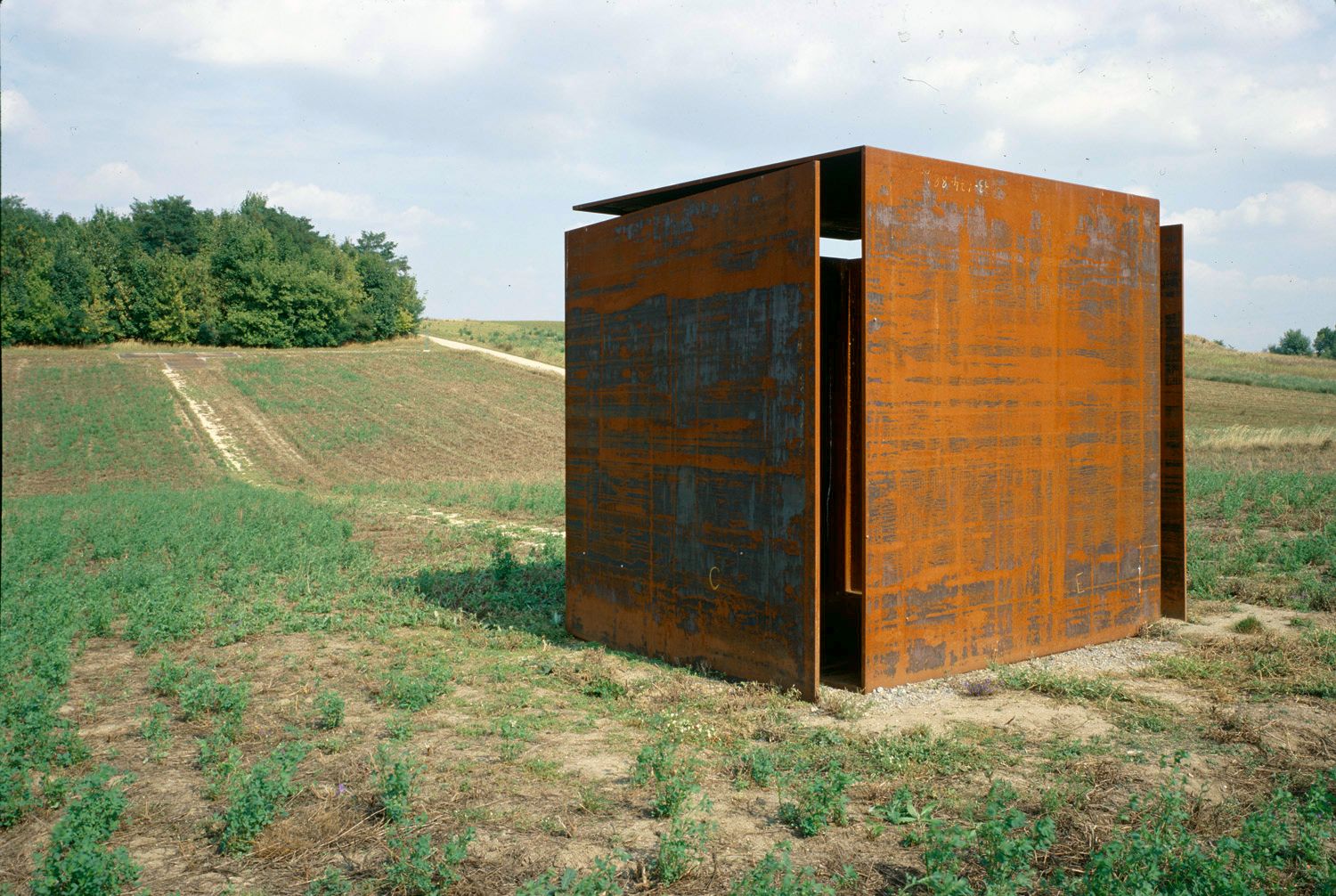 The little story of the Wind-Cube House and the cube-cover, a short sequence of scenes, was translated into the language of sculpture. The work's final form and installation were determined by the wind and by the specific conditions of the terrain so that, in the end, the mathematical calculation of the steel-plate work finds itself confronted with the landscape: "An object, one which is exactly defined in terms of space, rolls down a hill. The movement starts at the one end of the field; it ends on the other side of the hill, and the cube stops, and remains in its position," is how Eva Afuhs describes the development. Speaking of the "snapshot of a moment, capturing the intersection of two movements," she states, "the place of stopping, which is determined by me, is connected in space with the surface of the field. By 'rolling' the cube-cover folds up." The cover still forms an open cube, the action is finished. Theoretically it could be folded out again so that our little outdoor story never ends. Against the work's static nature (and heaviness), the elemental force of the wind ensures a mental mobility which in turn connects it to the location and to the landscape.