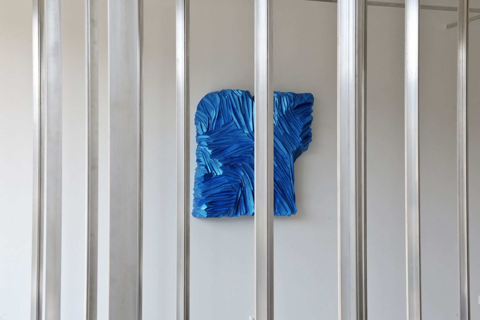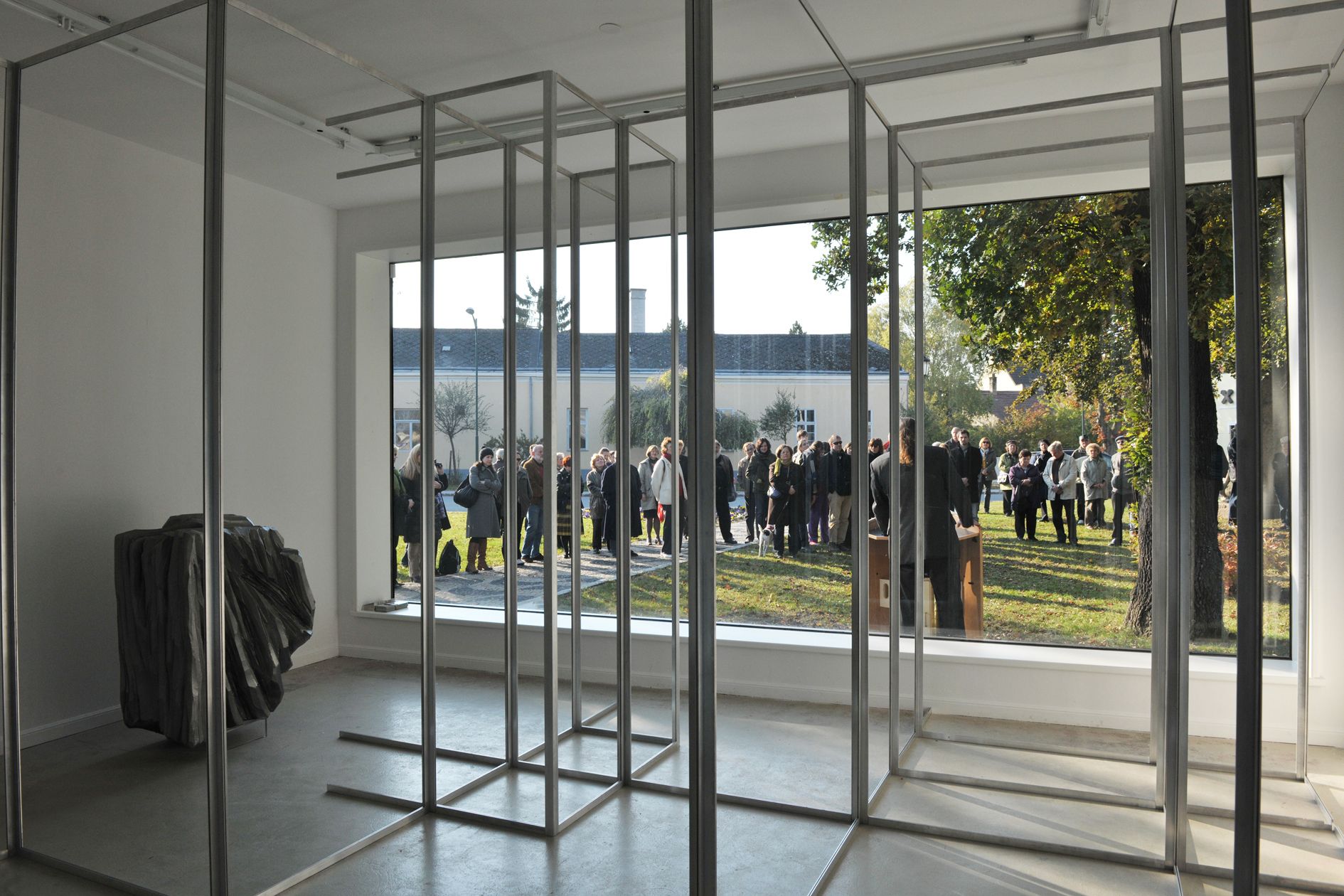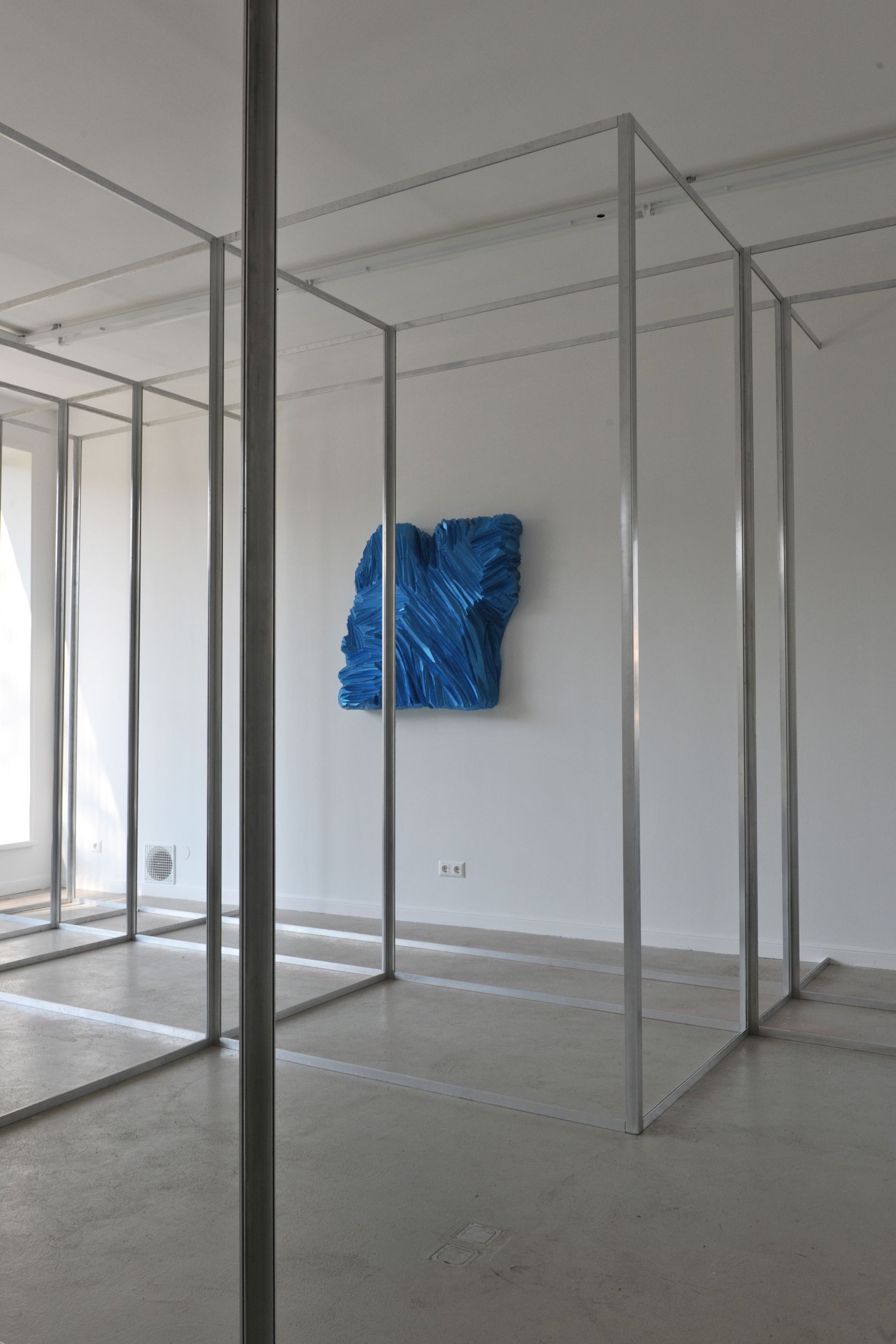 Having been invited by Michael Kienzer to exhibit at the Kunstraum Weikendorf the artists Gisela Stiegler and Markus Wilfling felt a challenge to refill the 'cleared' square created by their host. This highly exposed artificially created space in the village defines itself for the two colleagues through the removal of the original contents. Reduction, as is so often the case in Michael Kienzer's works, is an essential facet of the artwork Kunstraum Weikendorf. Furthermore, this newly created location is itself a continually changing installation as a result of its being occupied by different artistic positions. In the exhibition DAS DOUBLE UND SEIN THEATER (The double and his theatre) Gisela Stiegler and Markus Wilfling relate their notions of sculpture to one another. Markus Wilfling reduces the entirety of the space into units spatially by inserting aluminium profiling as a contoured grid of frames that subdivide the interior of the art space into segments — like a hall of mirrors. The contours generated geometric views. Markus Wilfling's starting point in developing his sculptures is the idea of creating a setting for the 'emptiness' intrinsic to architecture. The 'frames' provide outlines or continually create further spaces, not only by defining walls but also by evoking a feeling of visual separation. The resulting composite elements are filled with functional contents, like open-plan offices. If one eliminates the contents, a skeletal structure remains. In the Kunstraum Weikendorf, this concept, which runs counter to classical notions of sculpture, serves to generate new spatial situations and new axes along which to view the settings created for the sculptures by Gisela Stiegler. Using carving as a technique, she creates a tactile material quality and a surface structure that contrasts starkly with Markus Wilfling's geometric arrangements. She forms opulent baroque masses out of polystyrene, simulating weight with the coat of paint. In combination with the particular intense colouring of the artificial glossiness of the paints, the traditional activity of carving develops a charged relationship. The use of polystyrene as a raw material allowed Gisela Stiegler to seemingly extend the static limitations of her sculptural forms ad infinitum, combined with the freedom to generate voluminous protrusions.