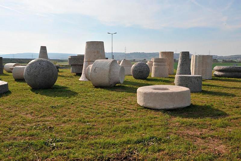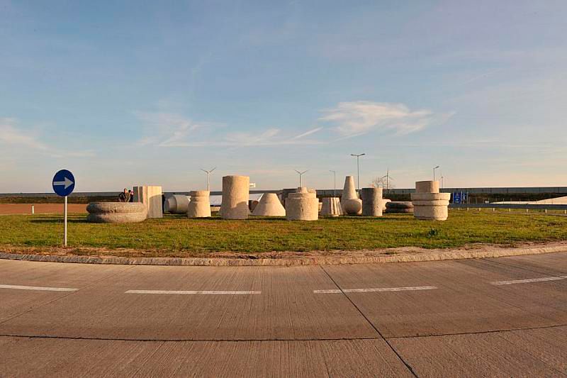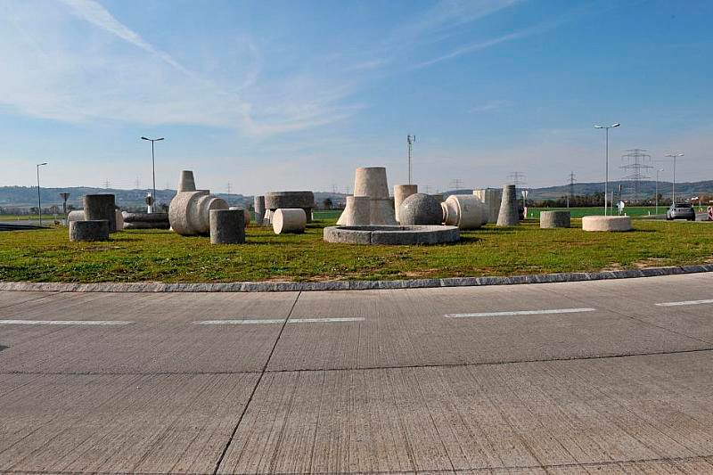 This is the first of three large roundabouts to be completed in the region known as “10 vor Wien” (an area of 10 municipalities near Vienna). Tarek Zaki has assembled a monumental ensemble of sculptures relating the circle. The project has the title O. At first glance, the work looks like an oversized Roman excavation site, but on closer inspection, we realize that the objects appear to be from different periods. Not only do we see parts of ancient columns, but also blown-up versions of small plastic objects have been added to this monument.
