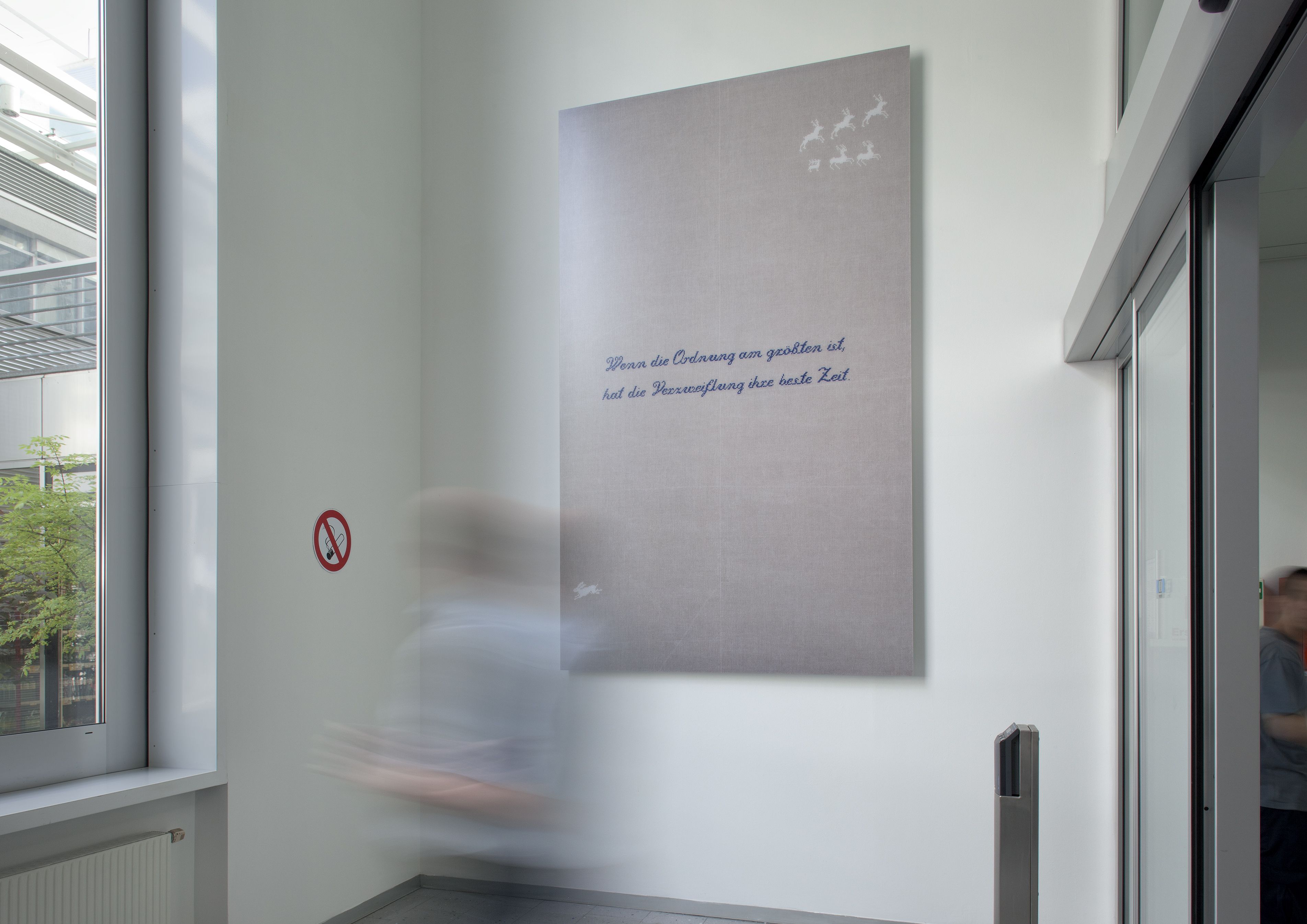 The mixed-media work that Marlene and Lina Streeruwitz conceived and actualized for the entrance area of Haus 4 of the Lower Austrian government complex (photography: Christian Wachter) affects the viewer as being as subdued in its aesthetic reduction of color and form as it is assertive of strong presence by virtue of its mere size and of the verbal statement that it bears. On a monochrome surface of 1.8 m x 3 m, a sentence is crystallized in the middle, in the upper right and lower left corners wild animals are seen fleeing towards the edges of the picture. The discrepancy between withdrawal and projection, fading and emerging, space and surface, concentration and disparity, creates both tension and irritation, which pervade the work in all its structures, catching the eye and making the viewer/reader pause, puzzled, as if she or he has just fallen out of the prevailing continuum.
