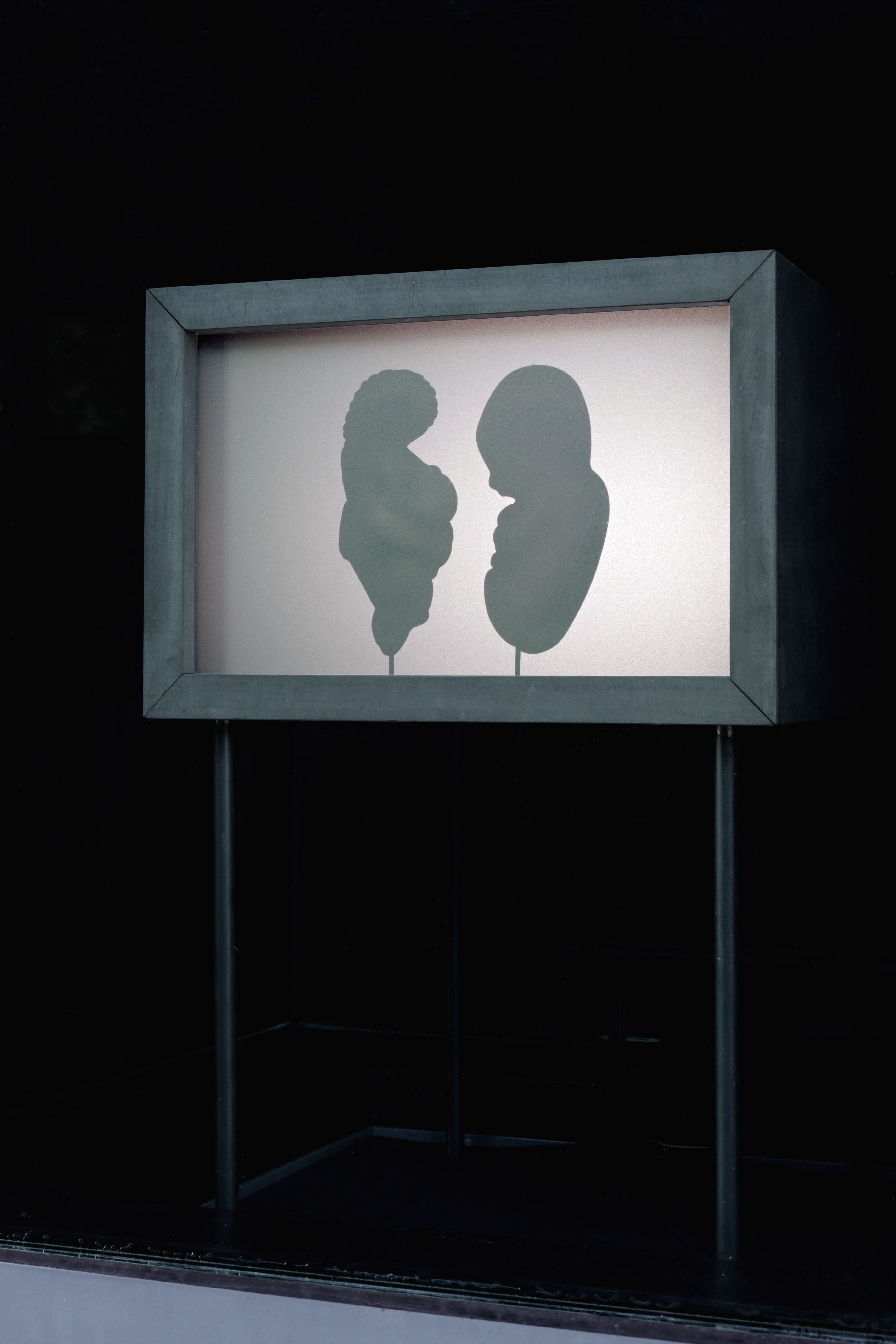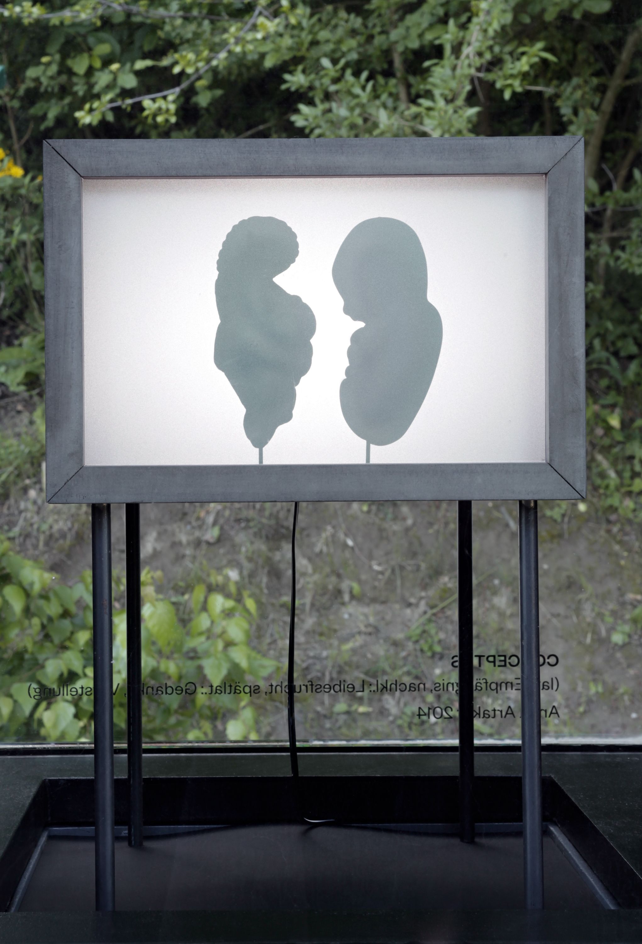 The Venus of Willendorf is roughly 25,000 years old. It was excavated in 1908, during the era of industrialization when modernization meant connecting different regions by rail. During the excavation work, a railway laborer discovered a small figure that made him marvel: a naked woman with curly hair or some kind of head gear, with thin arms and supple breasts. The realistic portrayal of the figure indicates that it was modelled after a real person. This small object left behind by our ancestors dates back to a time that is beyond our imagination – a time when the landscape in this region consisted primarily of steppe, and people traveled on paths by foot. Although it was possible to determine the figurine’s age by examining layers of earth, we can only speculate about its significance and purpose. Many theories have sprung up over the years. For example, simply referring to the 25,000-year-old figurine as "Venus" reminds us of the much younger Venus of antiquity – the Roman goddess of love, erotic desire and beauty – and suggests the idea that the two Venuses are "sisters". According to other interpretations, the figurine was a kind of talisman – for example, for a twin sibling that had passed away. It is this ambiguity – this difficulty to establish an exact context – that Anna Artaker addresses in her work CONCEPTUS. She juxtaposes the Venus replica, which is eleven centimeters long, with a model of a four-month-old fetus on the scale of 1:1. Anna Artaker explained that "this model is also used in medical training. Like Venus, it represents the reproduction of the human species or the survival of the human race over centuries – from the Venus of Willendorf to the medical model of the fetus." Artaker placed these two figures in a shadow puppet theater peep box, where a spotlight makes the figures visible as shadows. From the other side of the box, we can see the actual arranged figures. This is an entirely new reference in this exhibition series, in which the objective is to explore new approaches to the artefact of the Venus of Willendorf.