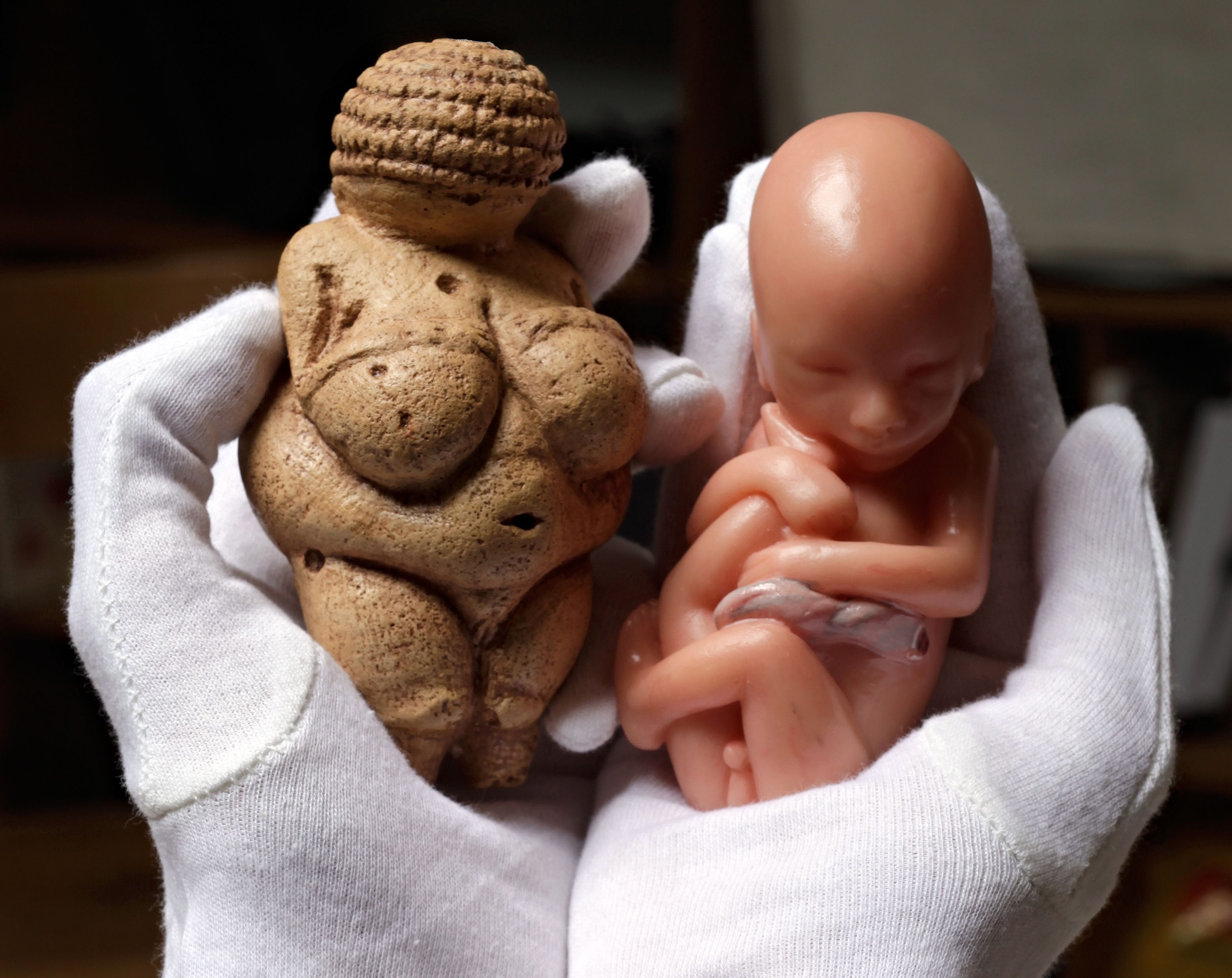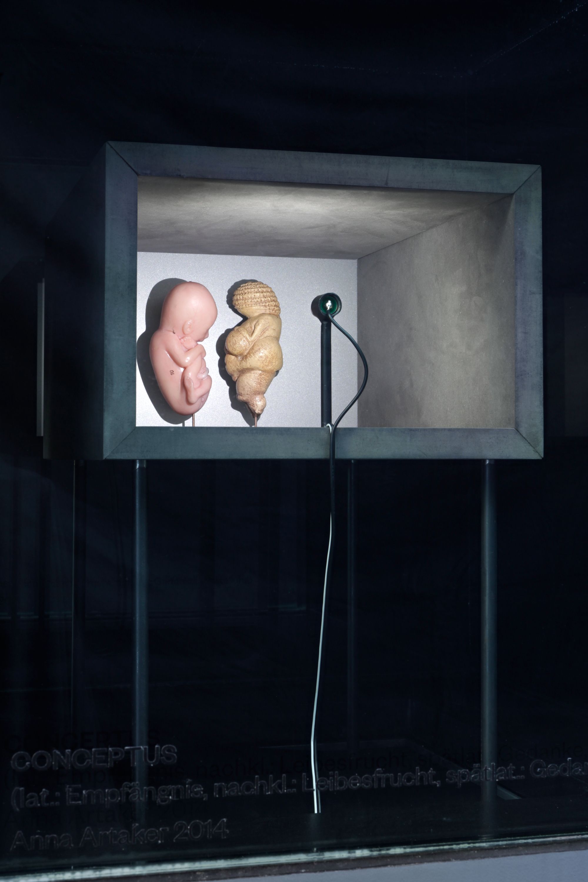 We can only speculate about the Venus of Willendorf's significance and purpose. It is this ambiguity – this difficulty to establish an exact context – that Anna Artaker addresses in her work CONCEPTUS. She juxtaposes the Venus replica, which is eleven centimeters long, with a model of a four-month-old fetus on the scale of 1:1.