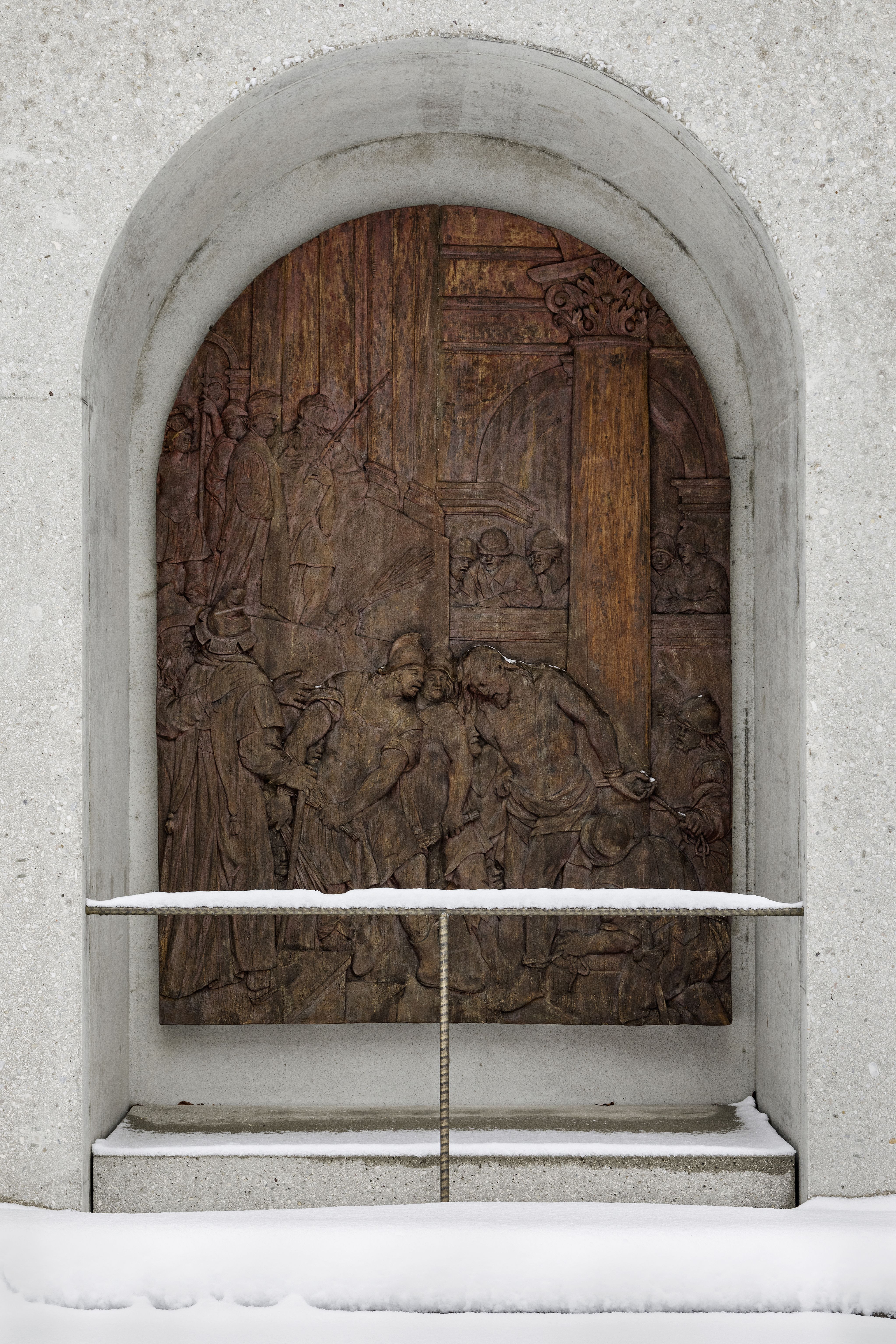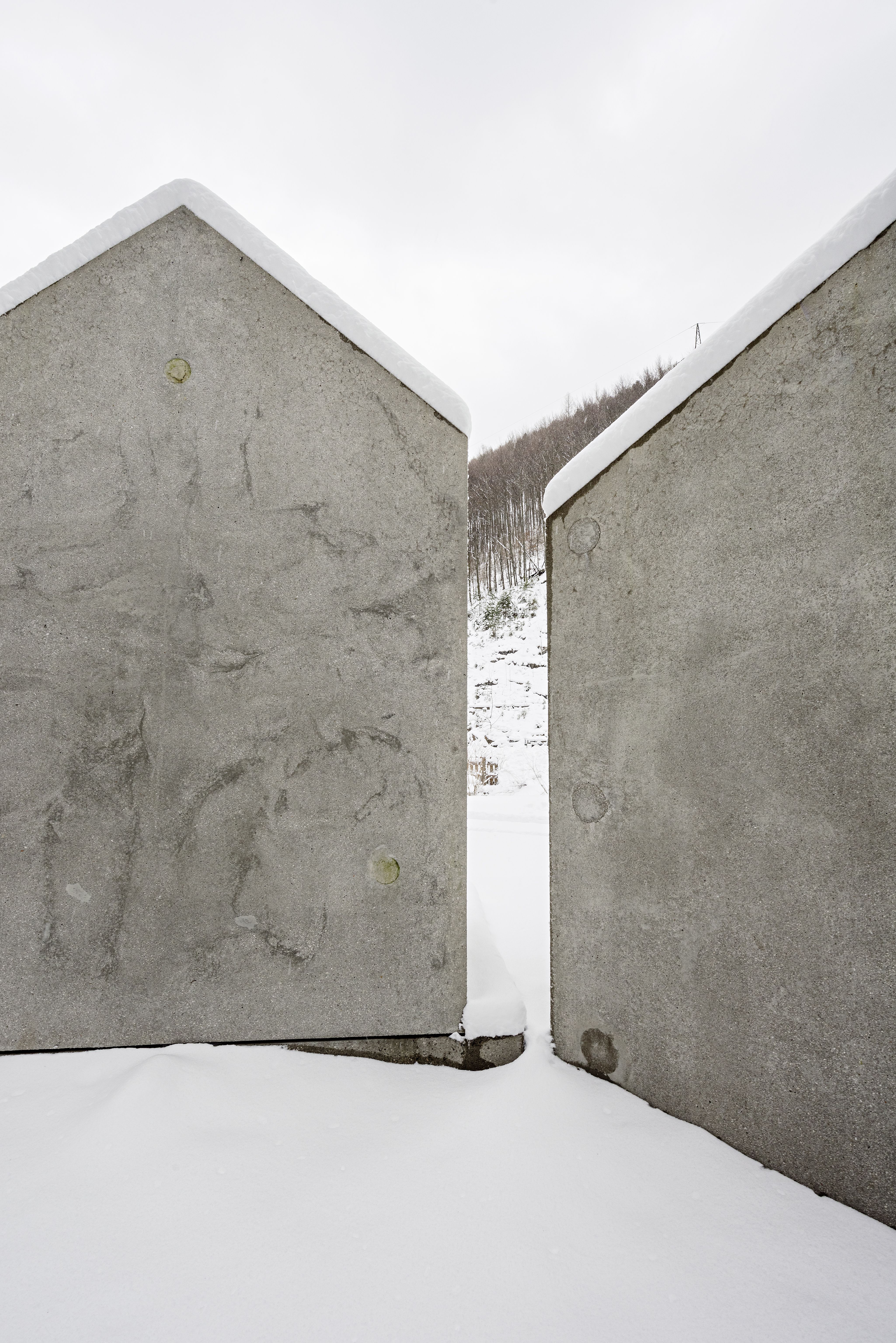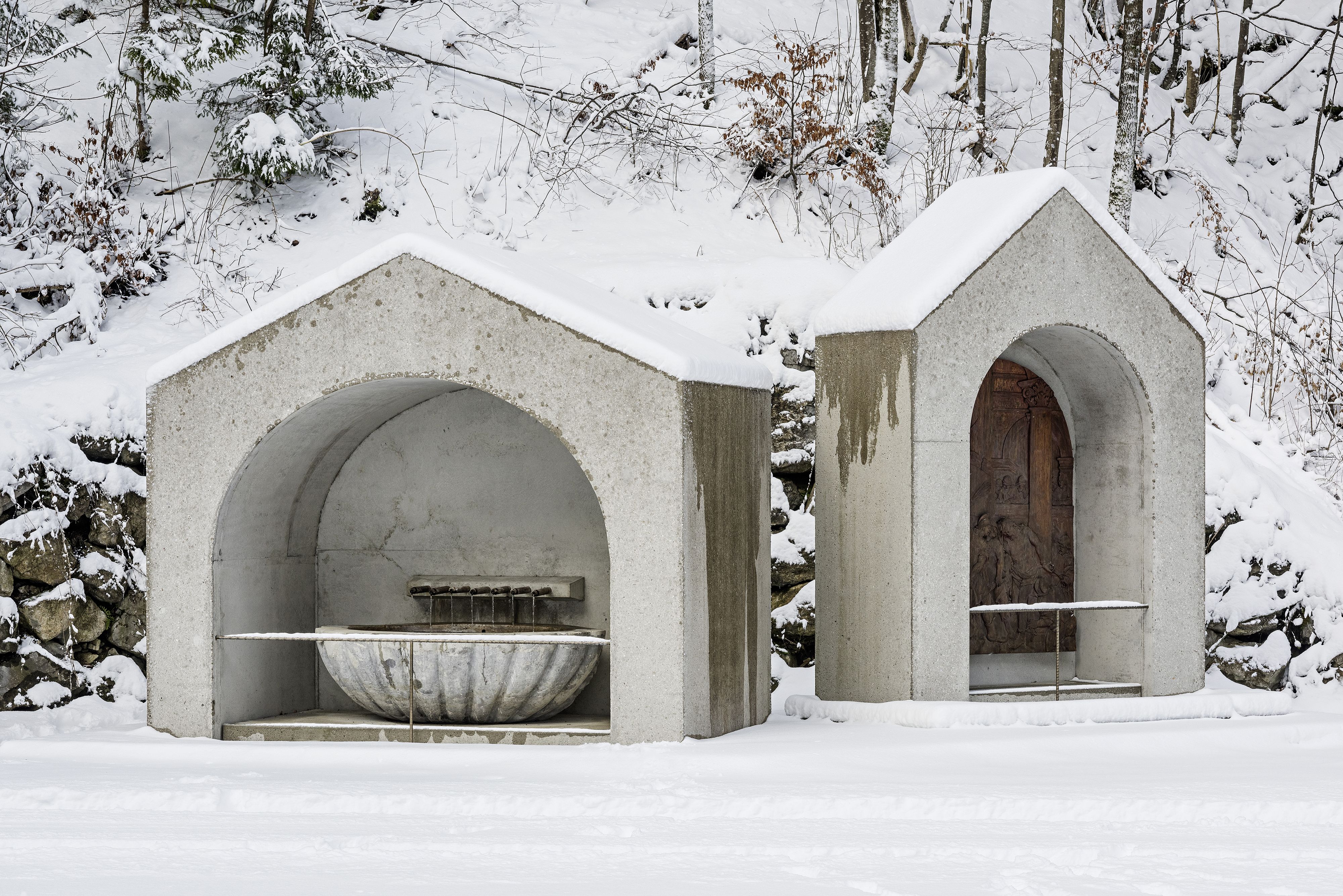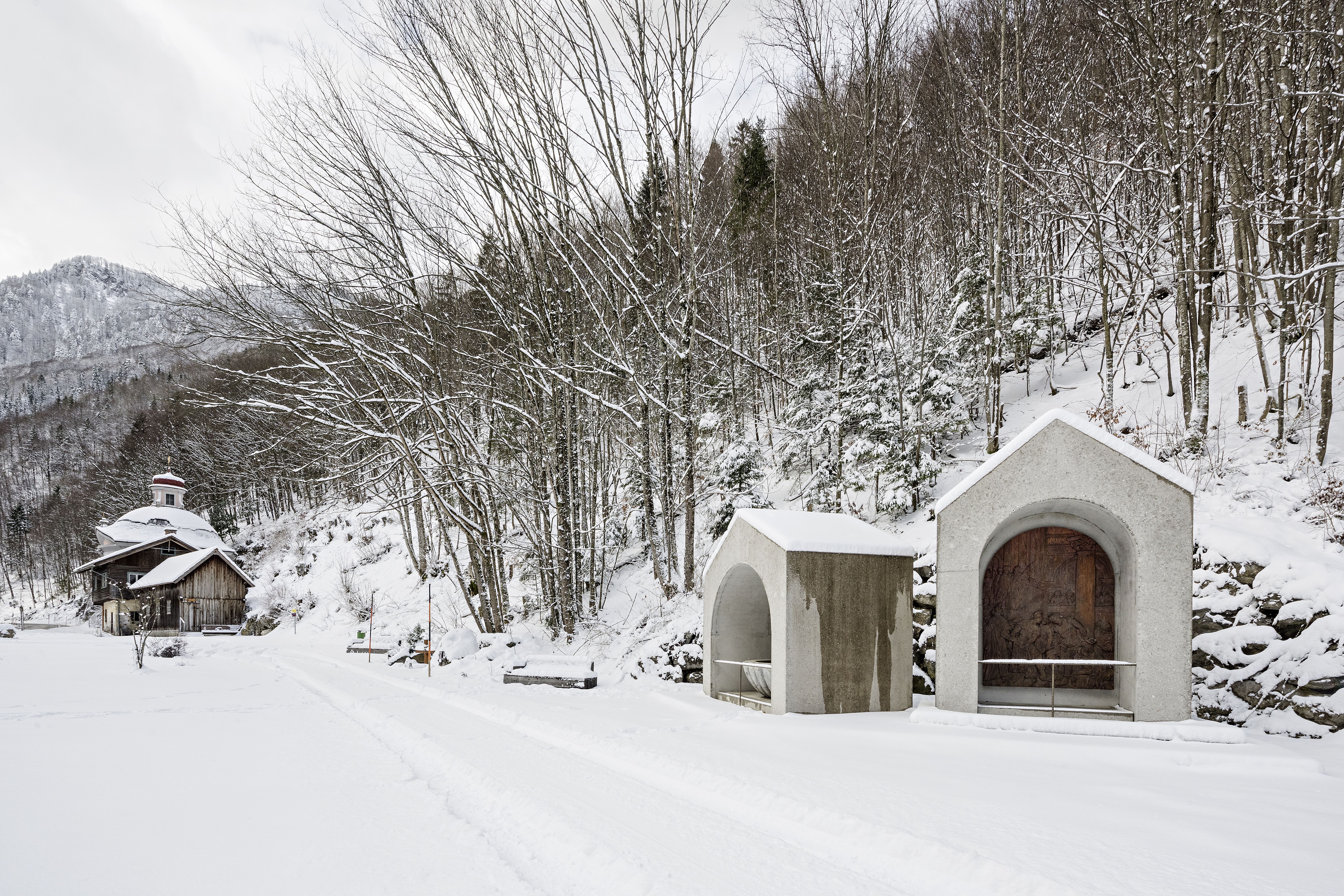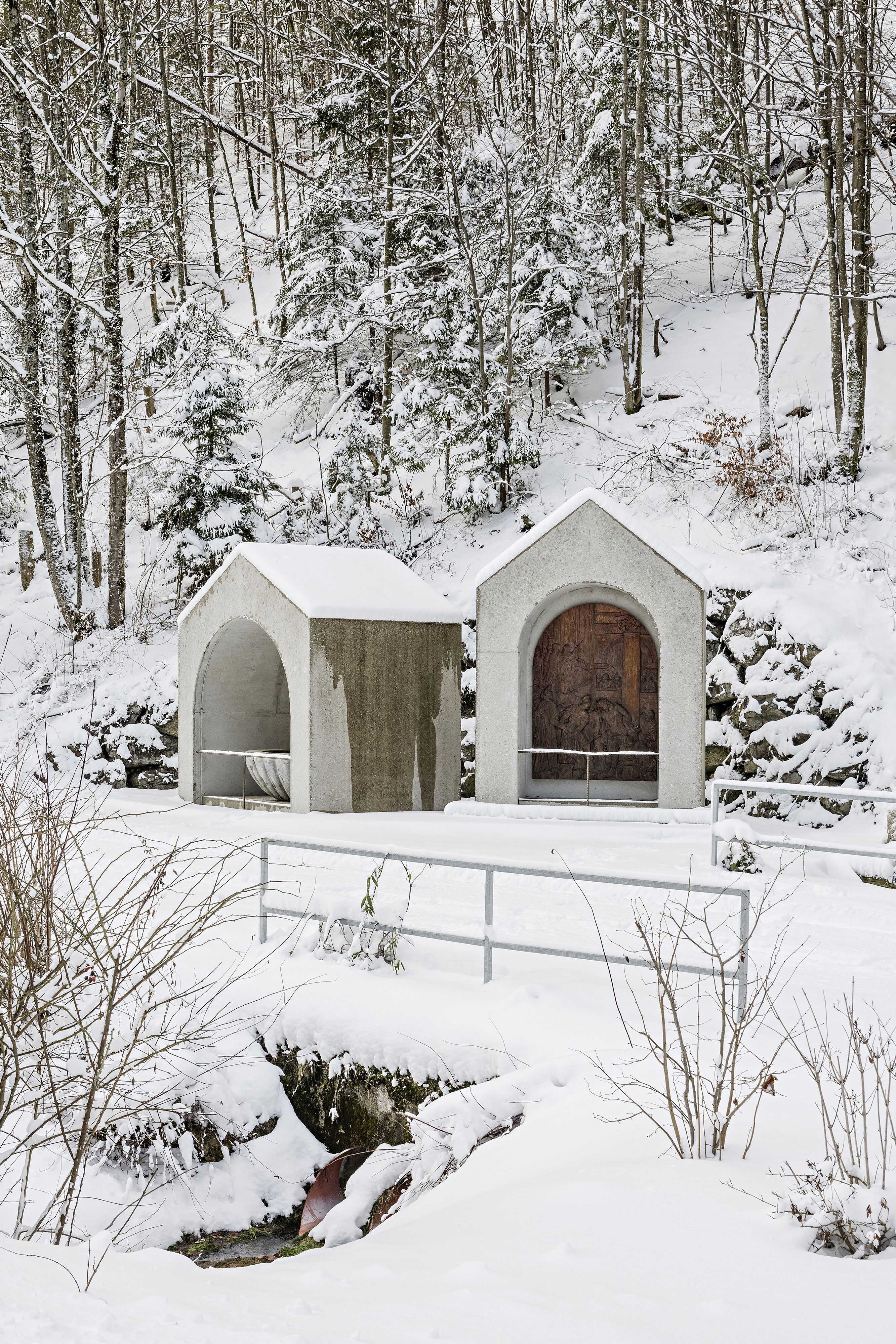 The water basin and the relief were thus separated again and placed in two independent houses made of prefabricated, sand-blasted concrete elements on a joint base made of exposed aggregate concrete. For the woodcut relief, which was originally part of a rosary path, they chose the architecture of a chapel shrine; for the water basin, a gabled chapel. Despite the fact that both structures form a clear unit in their materiality and fundamentally reduced shape, they nonetheless clearly reflect the Baroque hierarchy between sacral and utilitarian buildings. This can be seen in the different angles of the gables and the staggered height of the historic ensemble, the individual buildings of which were built in different angles to each other in a loose arrangement. The new buildings each face the Via Sacra at an angle, while also pointing slightly away from each other. The artefacts can thus be seen by the hikers already from a great distance: The wood relief is easily sighted from the mountain, and the water basin from the valley. Because it is a sacral element, the wayside shrine with the relief is narrower and taller than the spring house and is somewhat elevated with an additional base.