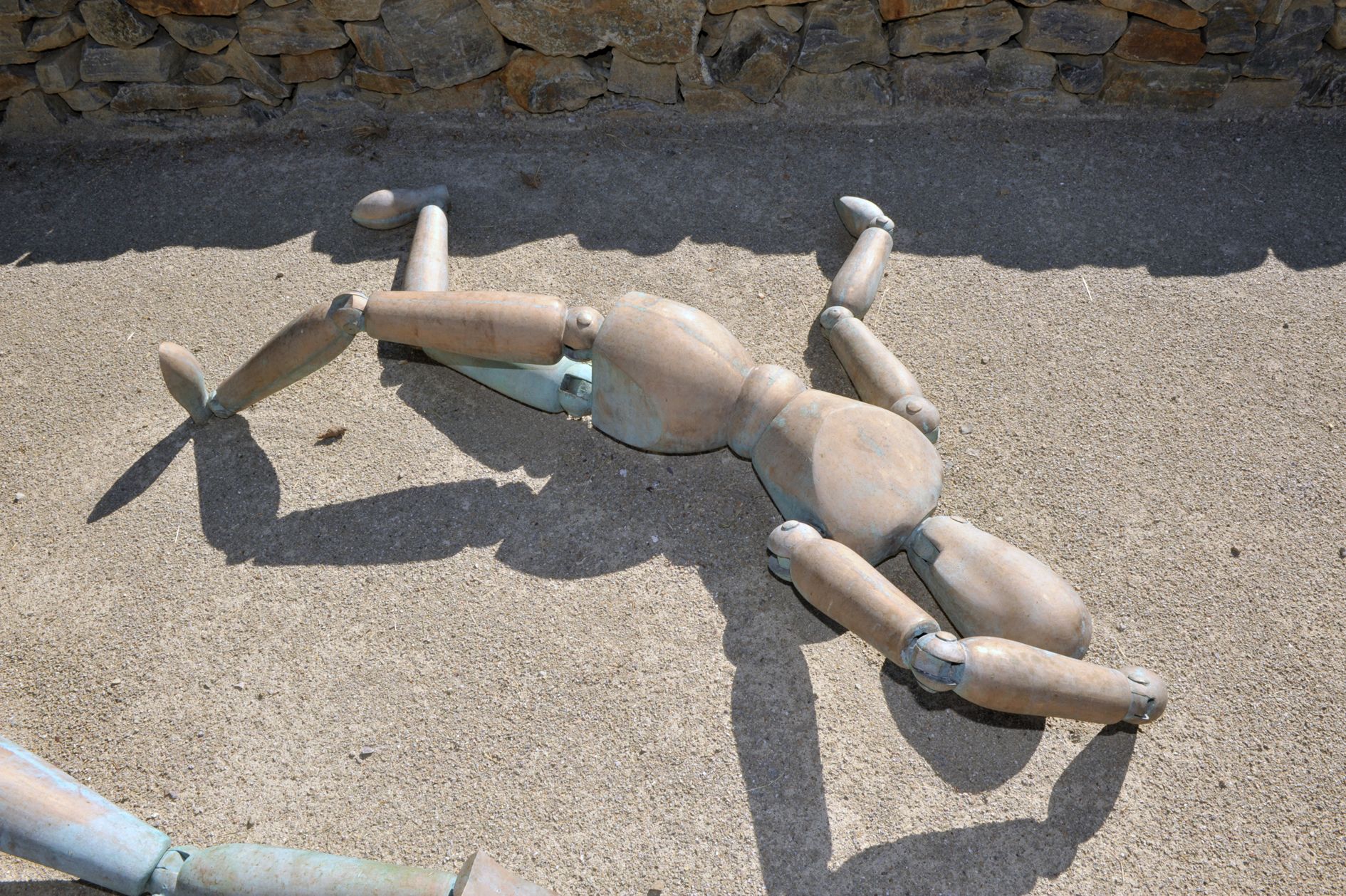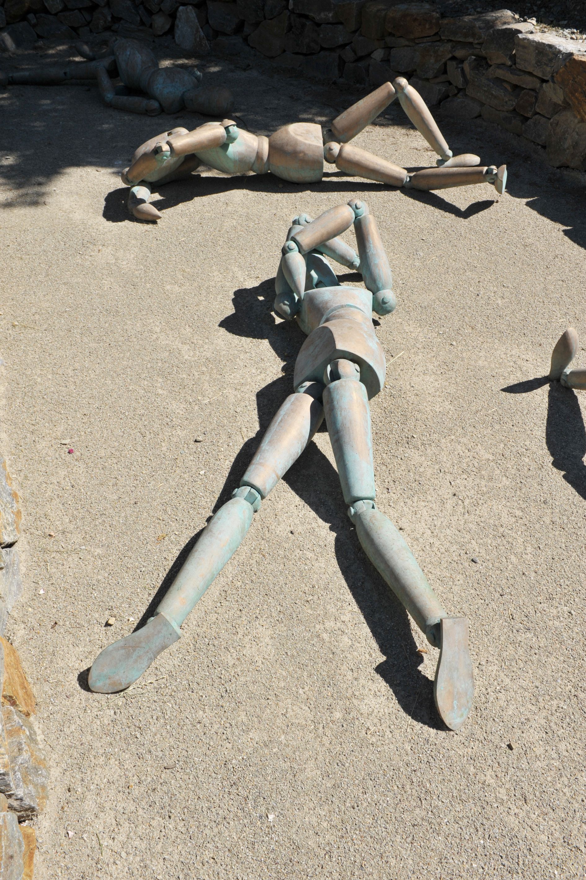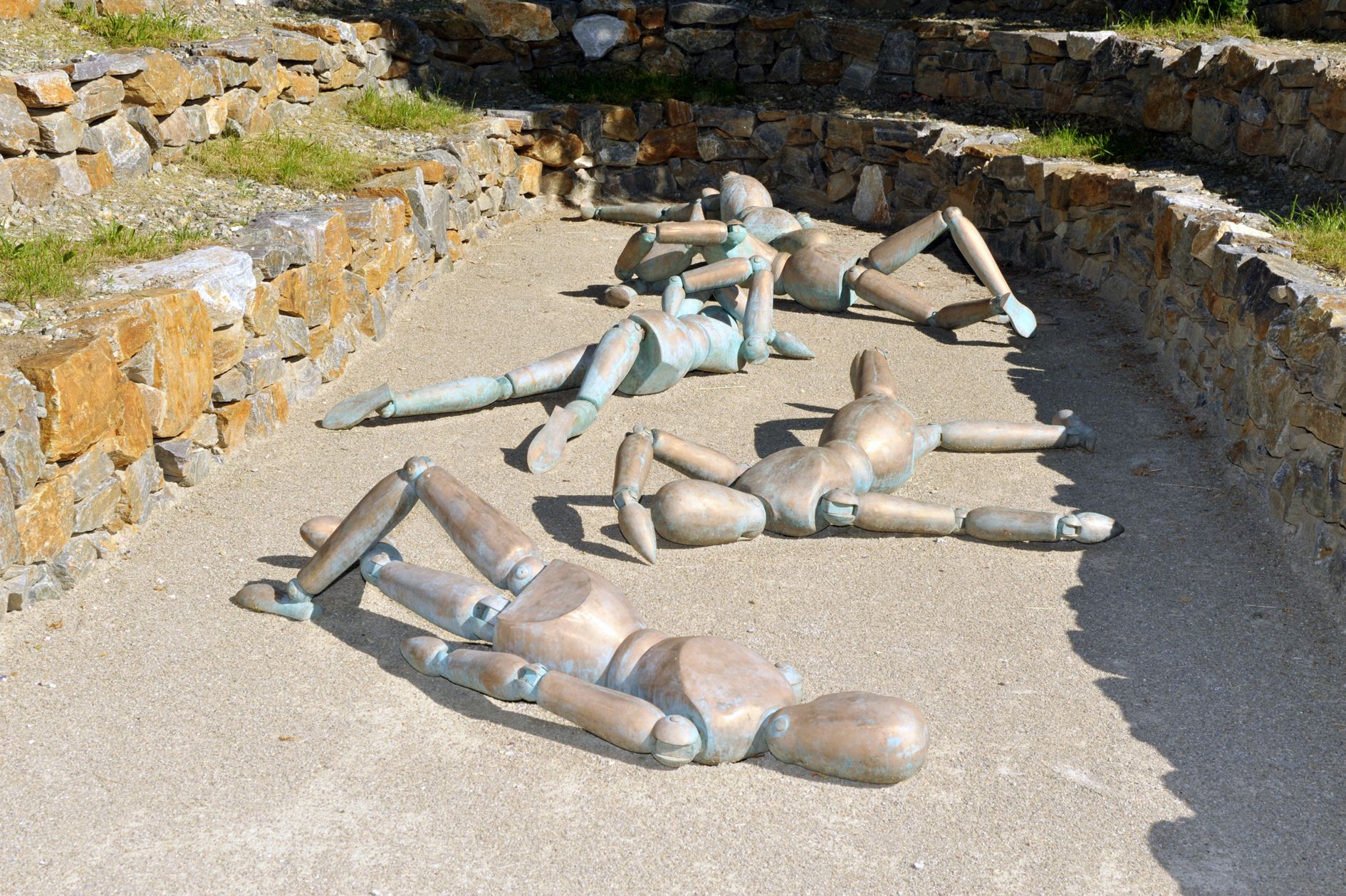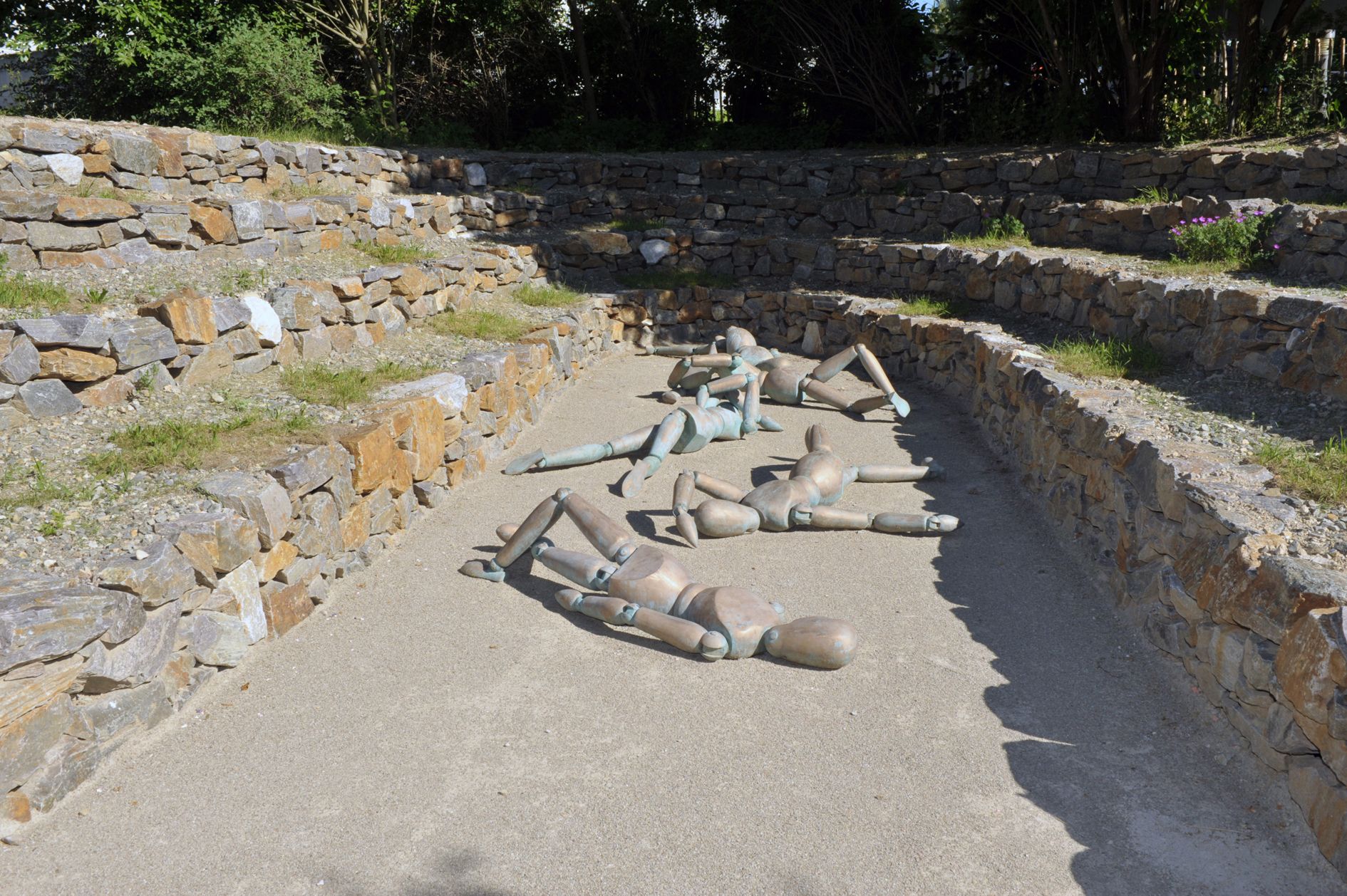 First, Daniel Spoerri listened to what people had to say about the situation, then he did some research before developing fitting solution. For this, he drew on the idea behind his bronze sculpture group "Massengrab der Klone" (Mass Grave of Clones), which he had installed in the Il Giardino Park in southern Tuscany in 2000 as a reminder of the horrors of tyranny, murder, and persecution. Spoerri’s model for the figures in this sculpture was a life-sized mannequin that was cast in bronze in Italy. Because the figures, or “clones,” have no faces, they can only be distinguished through their poses – lying with their bodies turned, or their arms over their heads, as if to protect themselves. For the new memorial in Hadersdorf, Spoerri decided to produce a second version of the "Mass Grave of Clones." He created five bronze figures that were first shown at the exhibition space next to the main square then were offered to the community as a gift for the memorial site at the cemetery.