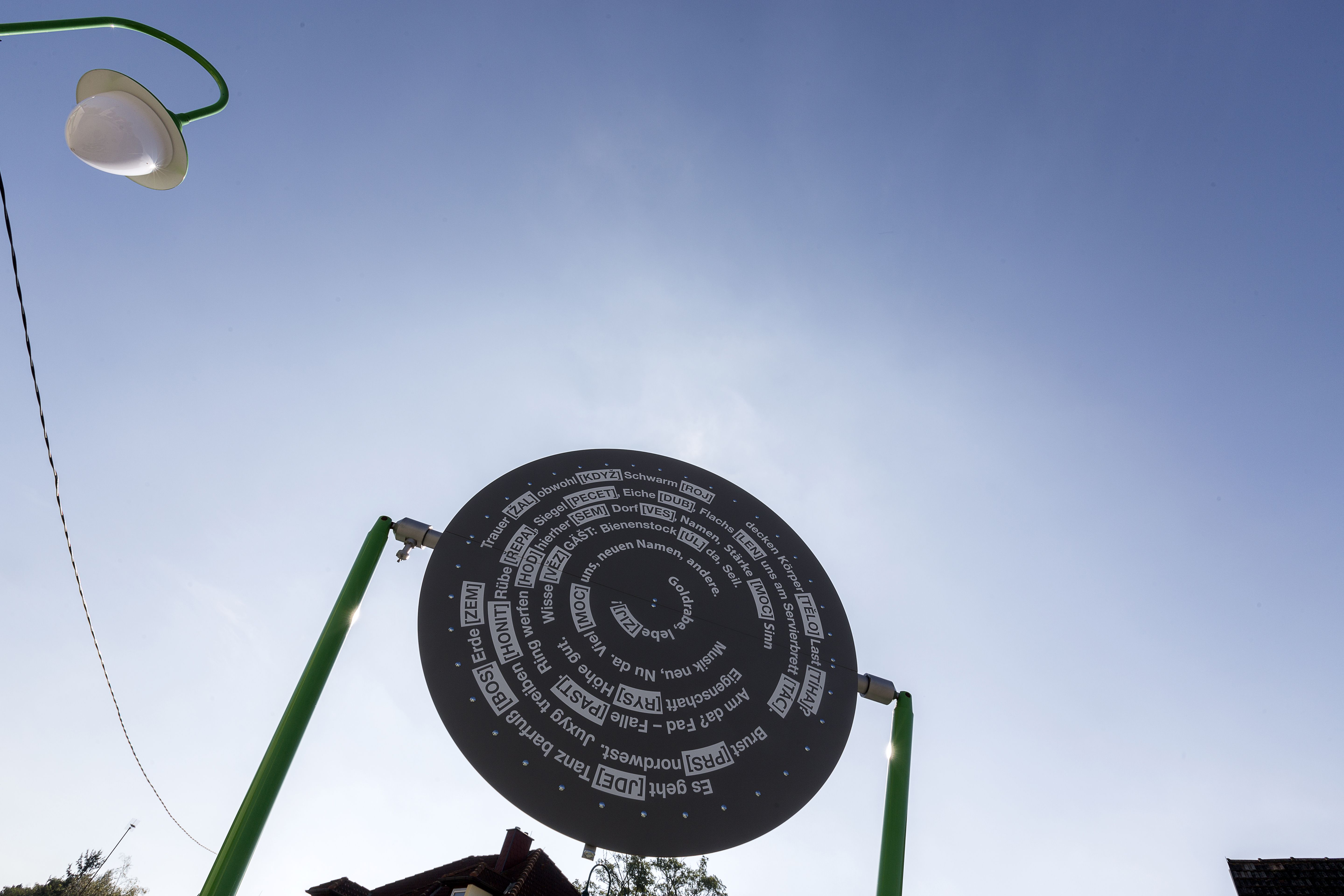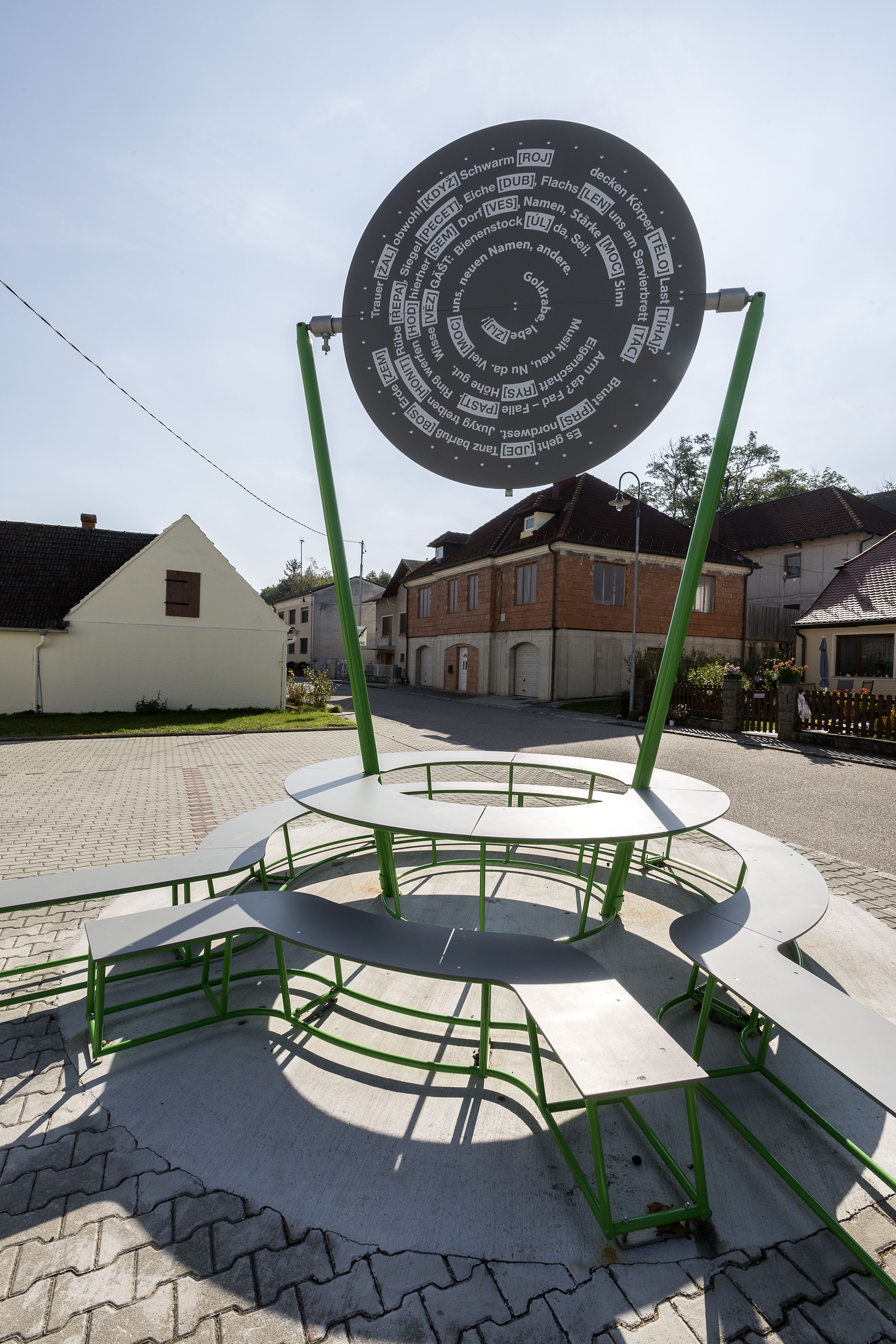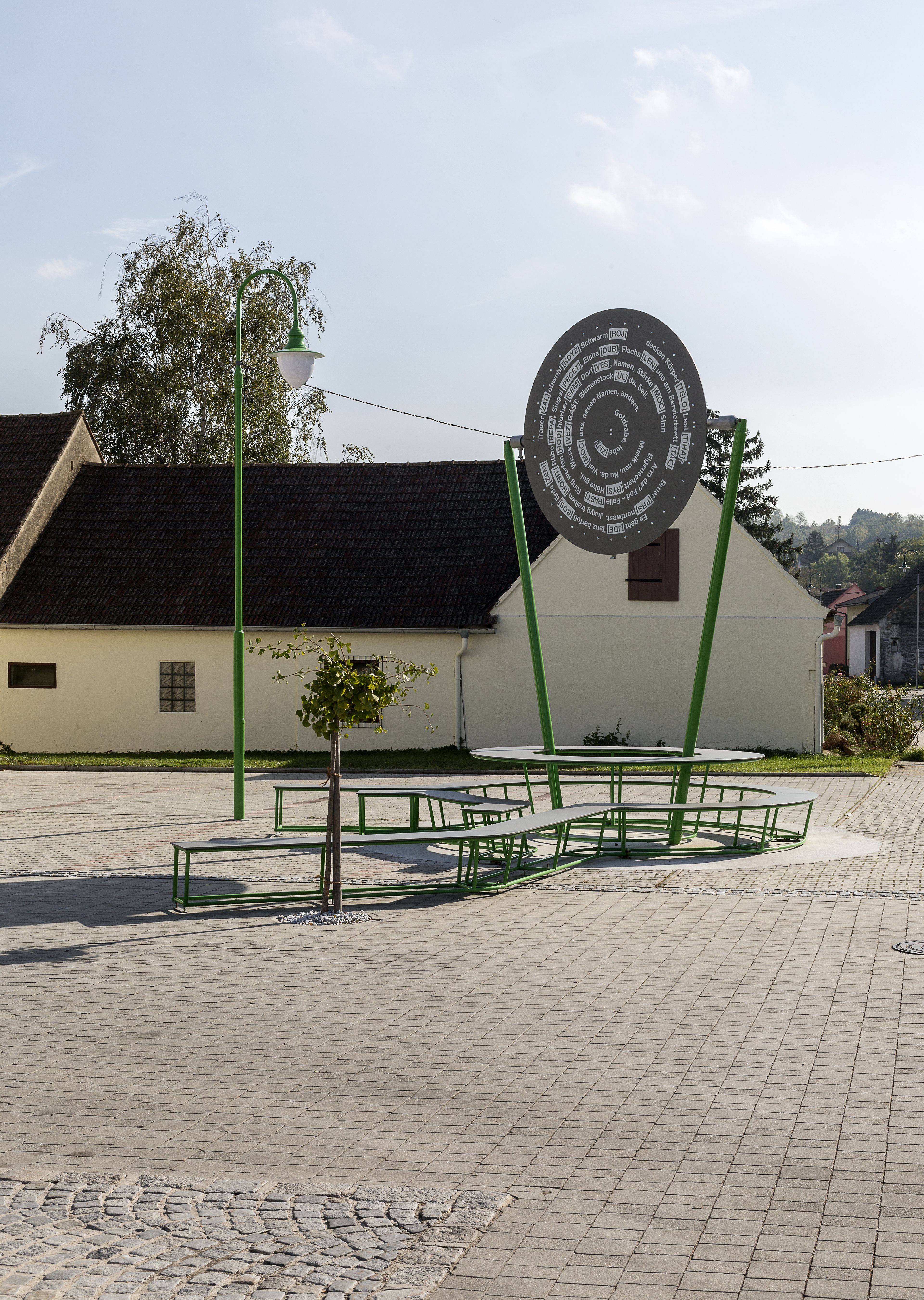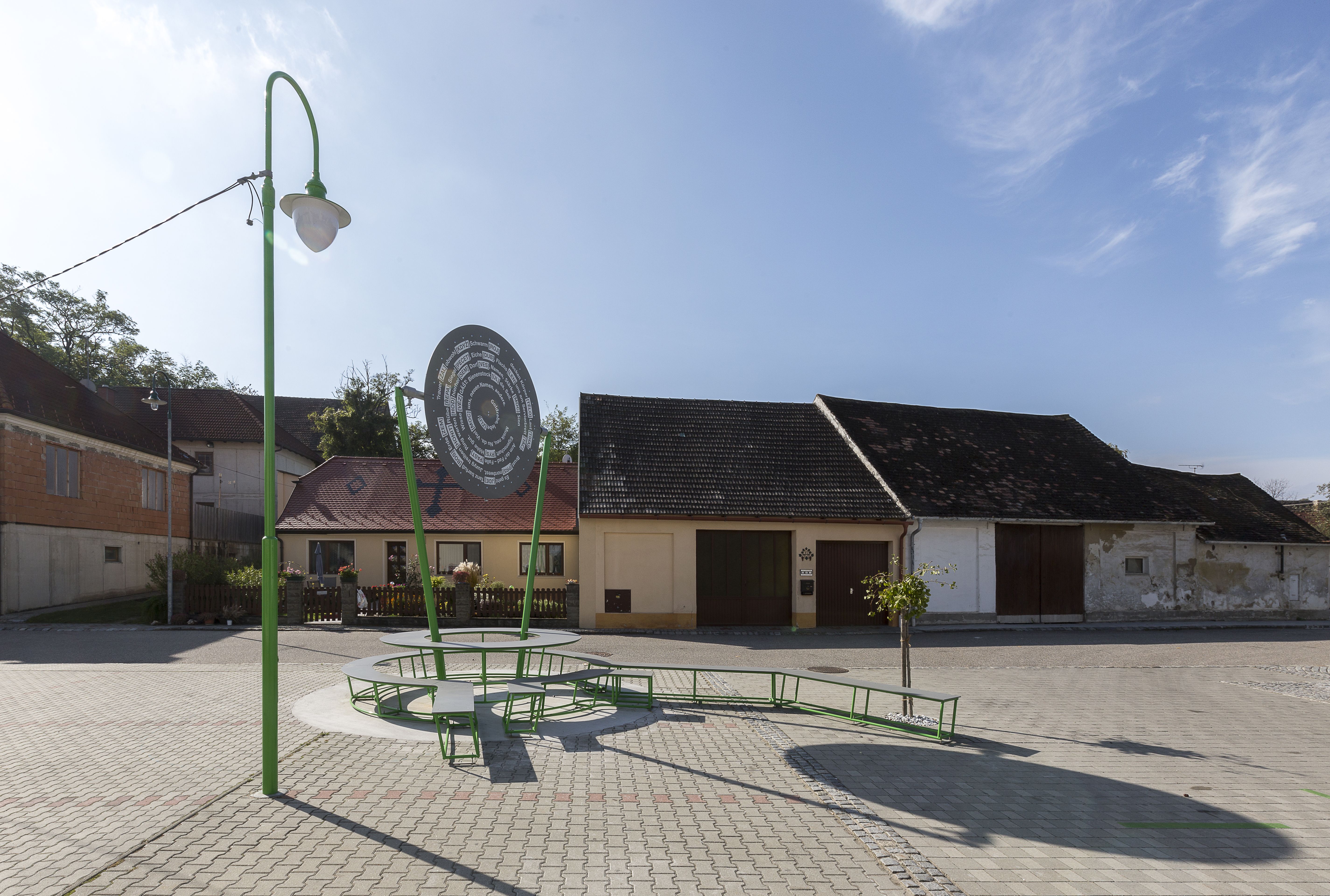 Their solution, "Request for the unrequested voluntary inter-linguisticality," consists of several parts and is intended as a work in process. In addition to setting the speed limit at 30 km/h and laying a road marking that runs across the street and creates a sense of cohesion, a shade-providing tree was also planted, and a typical Czech street lamp was installed. The heart of the project is a circular seating arrangement that stands for transnationality and acts as a monument against recurring populist demands for reinforcing borders. Most importantly, this metal seat & table sculpture symbolizes the potential of working together as a community. The rotating sun roof is also decorated with new German and Czech words that resulted from a cross-cultural game of Scrabble with the inhabitants of the neighboring village of Brezi in the Czech Republic.