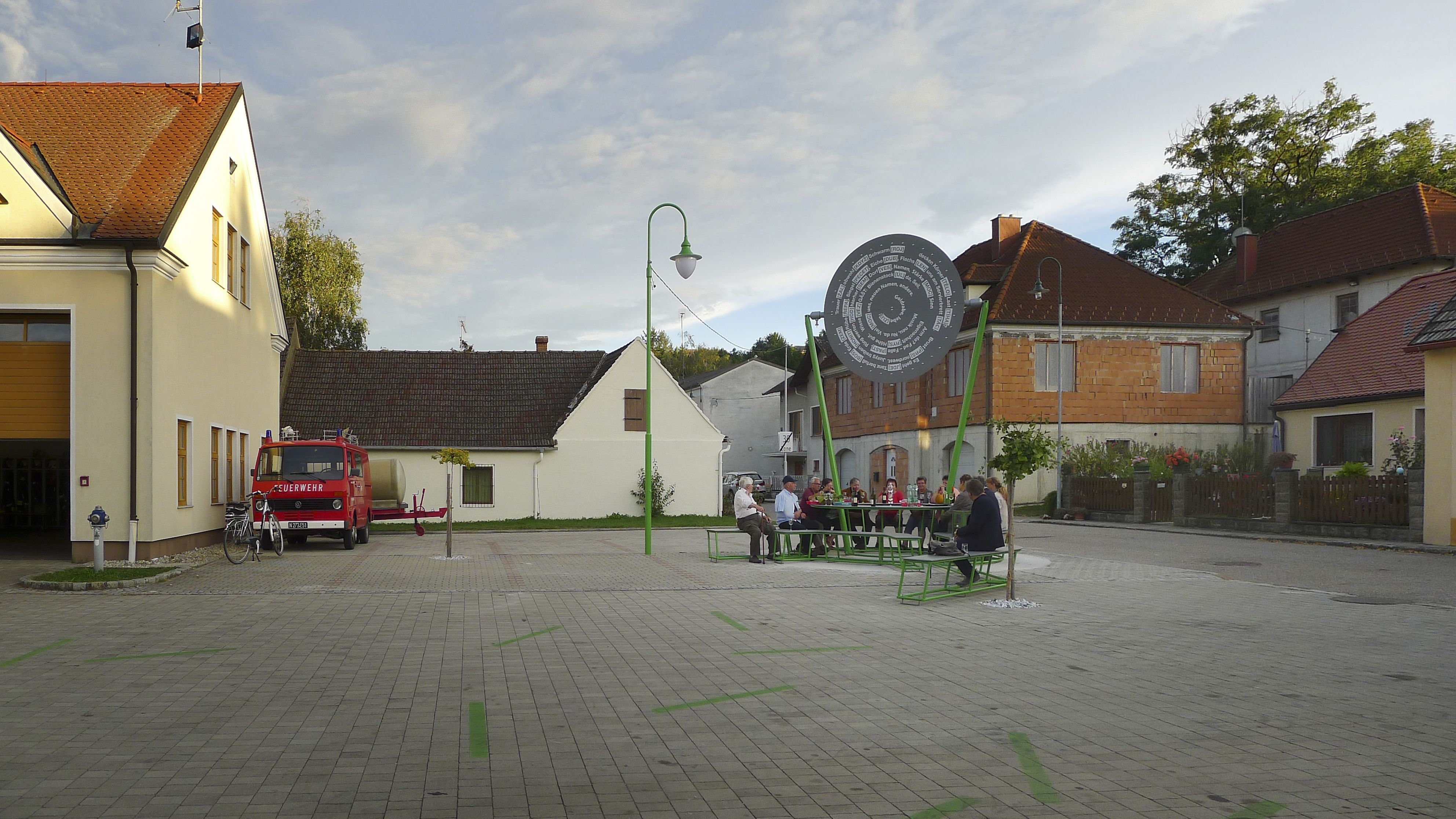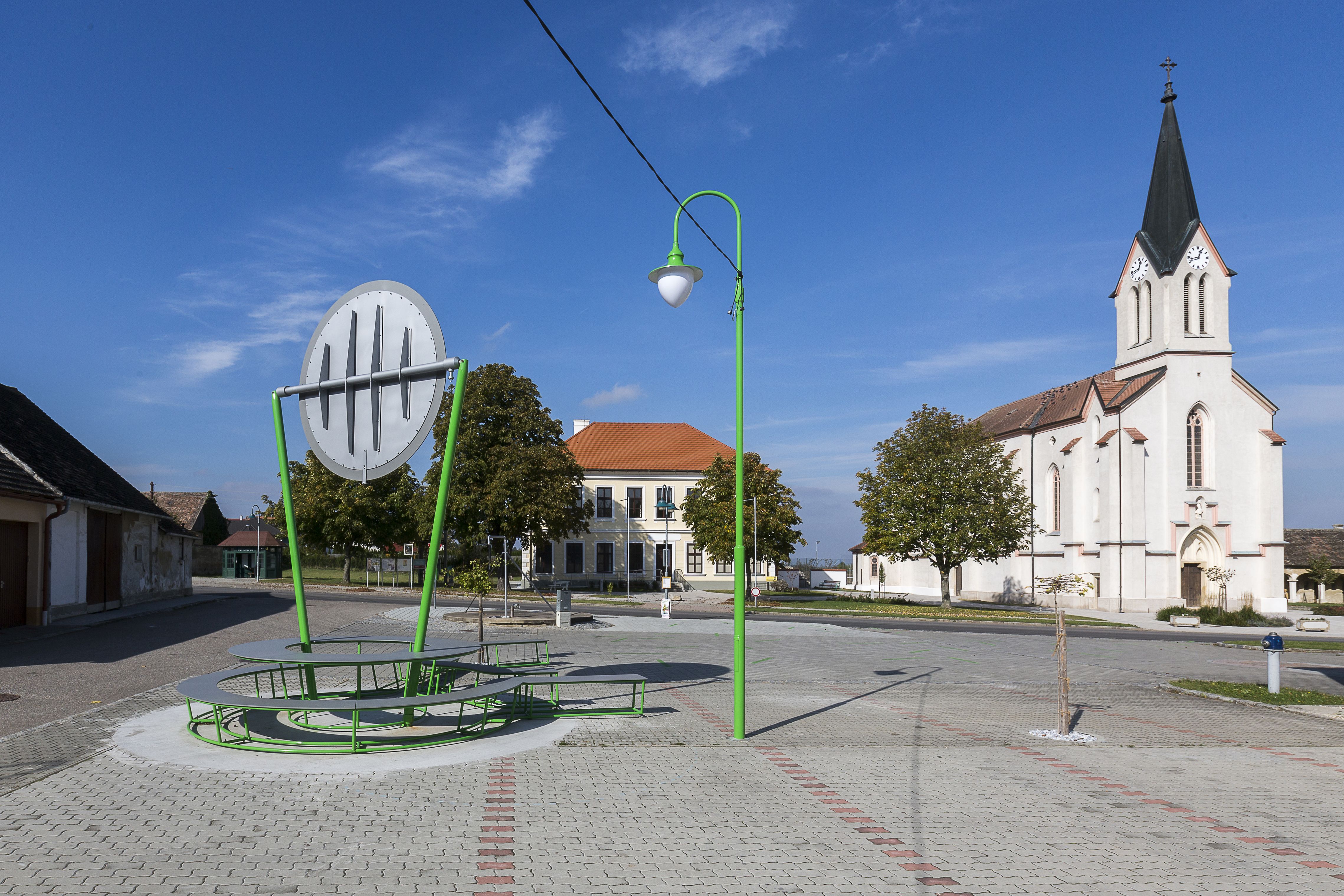 This was also the case in Pottenhofen, which is a small village located in the northern Weinviertel region of Austria, near the Czech border. A very busy country road runs through the middle of town, acting as a kind of structural divide. When the town decided to transform the former elementary school into a community center, complete with a grocery store and a youth club, the town soon had a second idea to commission artists to design the divided area in the town and give it the quality of a village square. The selection committee then directly handed the commission to transparadiso.