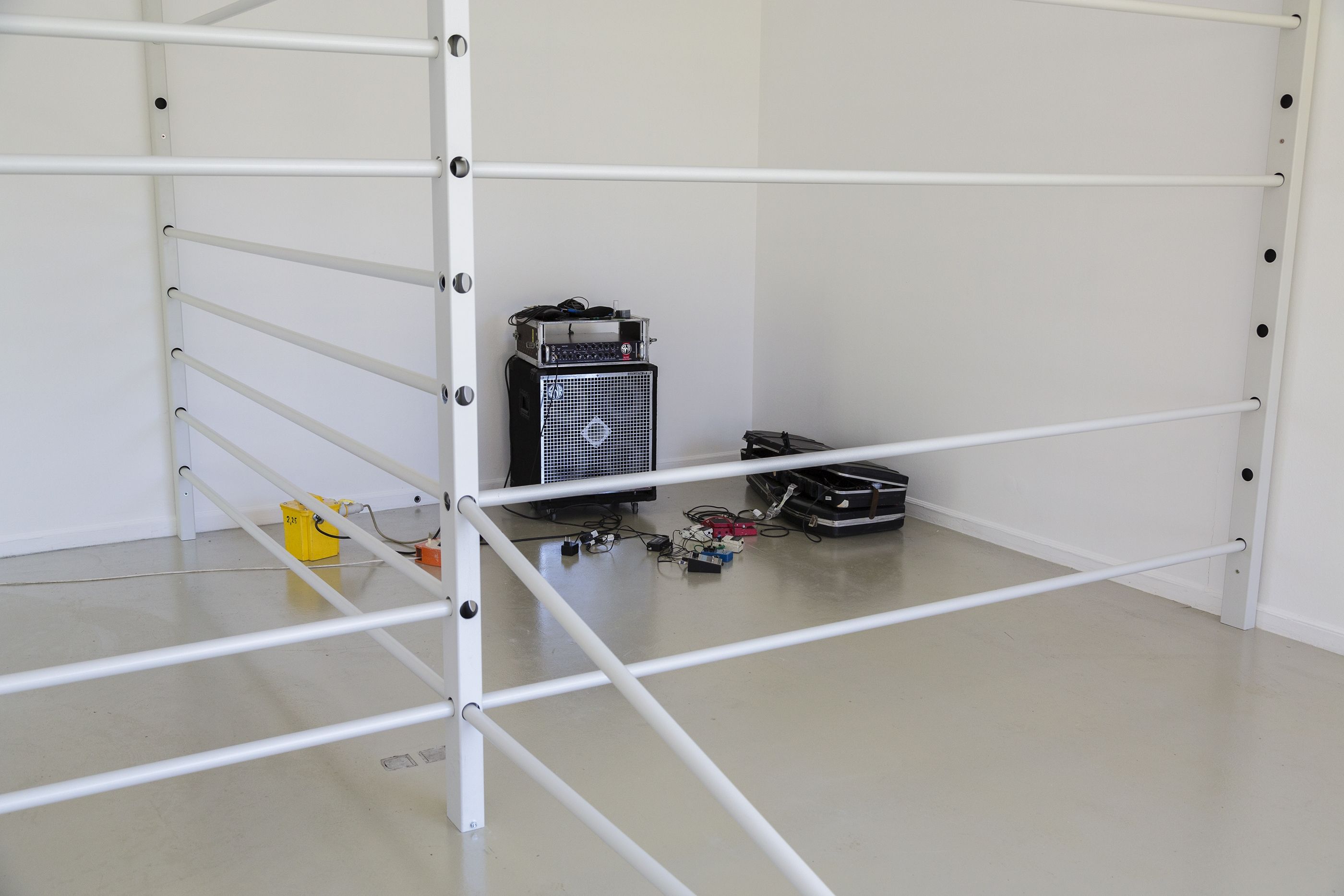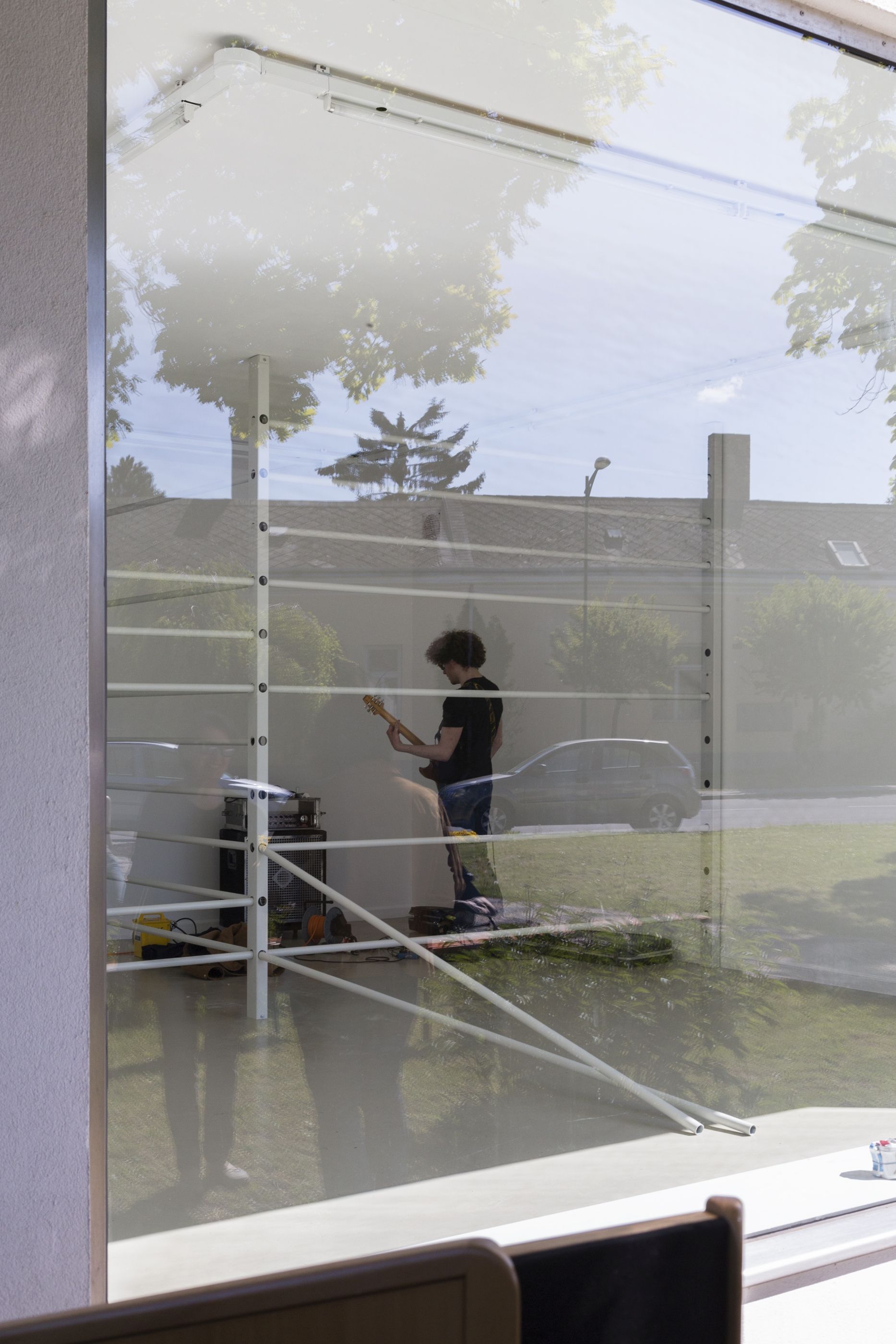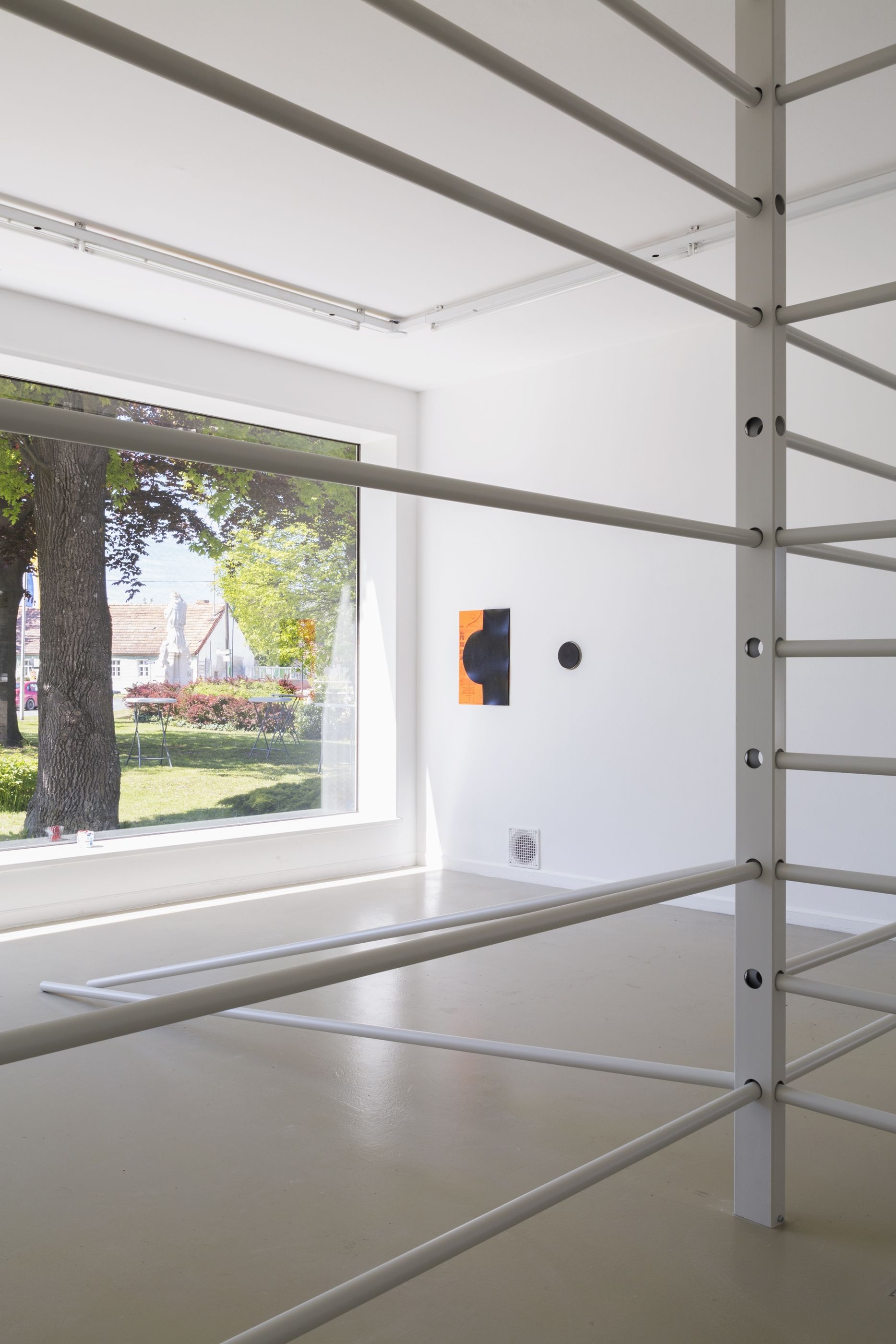In his installation in Weikendorf, Benjamin Hirte staged space as sculptural cohesion. He often uses minimal elements that he removes from their functional context, reassembling them in a new way. He prefers standardized parts, constructive elements, connecting pieces, or symbols from product emblems, which he then assembles in fragmentary sculptural passages. By combining isolated elements in his own grammar of sculpture, he creates an abstract logic with a dynamics of its own, generating room for the similarities triggered by different levels of language and objects. The installation resembles the ruins of a skeleton structure. The basic elements through which it asserts itself as a space exist, but they do not suggest a solution for establishing order. Transit is possible across the fragile barriers that divide the room into four parts and consist of removable horizontal rods that fit into the vertical poles. Transit works as a kind of glue, bringing big cities and emerging regions together under one umbrella. The four segments of the room are defined as zones that resist potential attempts to cross into them, while also inviting us to undermine this resistance. They are a texture of neighborhoods, underpasses, planes, fields, vectors, density, and distance. The steel scaffolding looks like the ruins of something that was never there, a relic of the mental construction of an umbrella term, a parenthesis. It can be read as a reference to something contemporary that only exists as an idea that has missed the present moment. What remains may be what Benjamin Hirte calls "a symbolic unifying gesture, a claim, an agreement, and (as is often the case) a certain imposition."