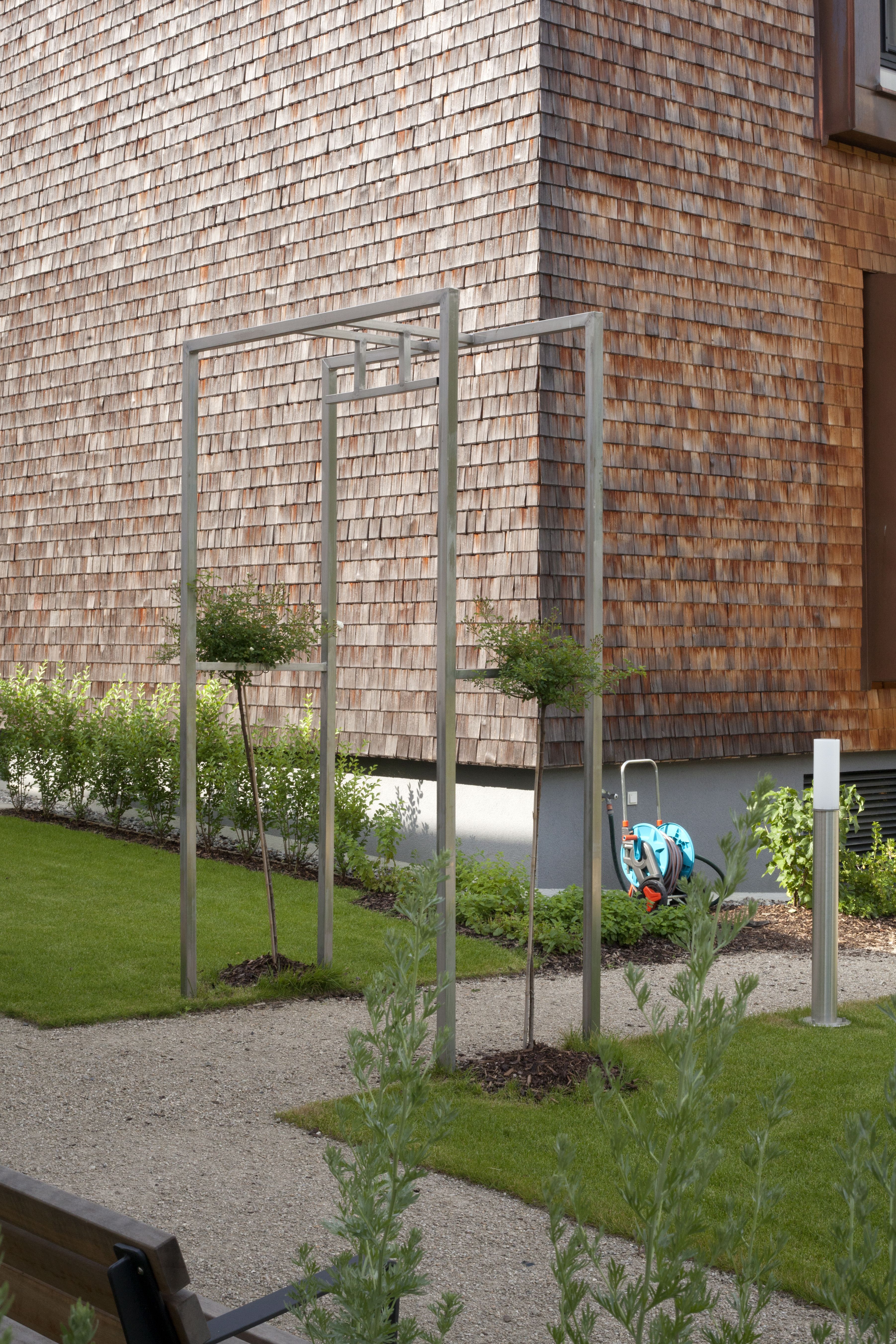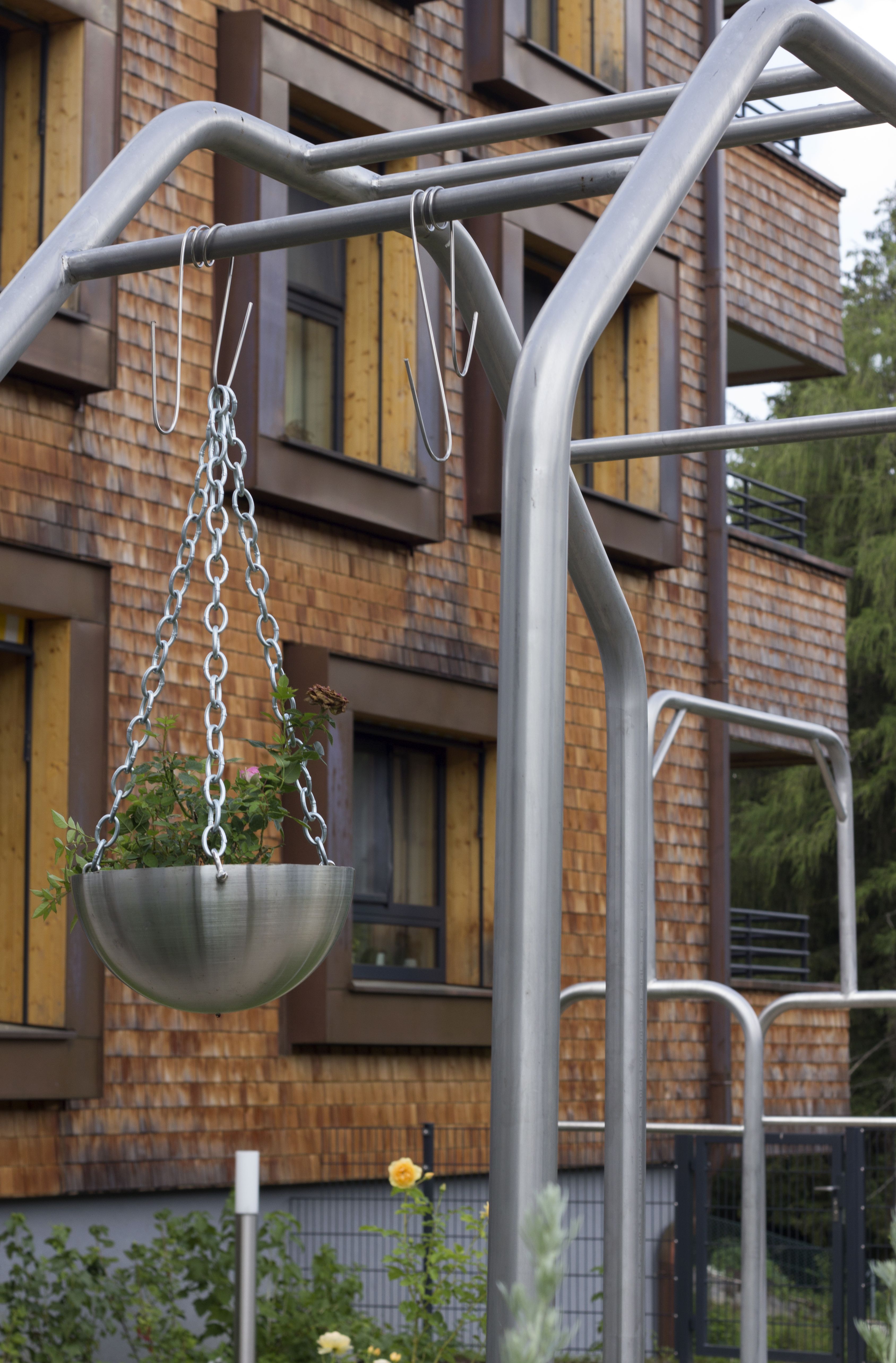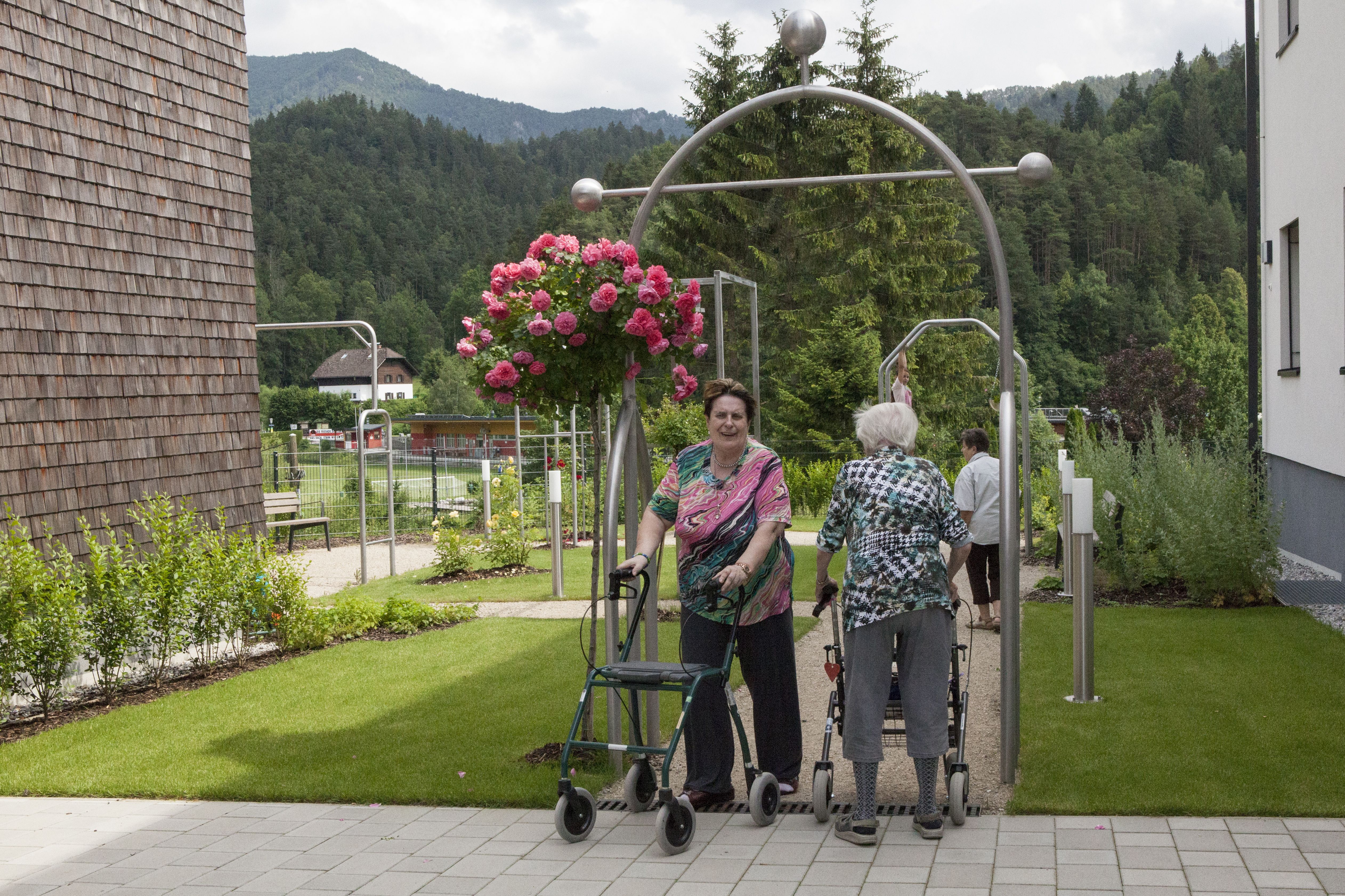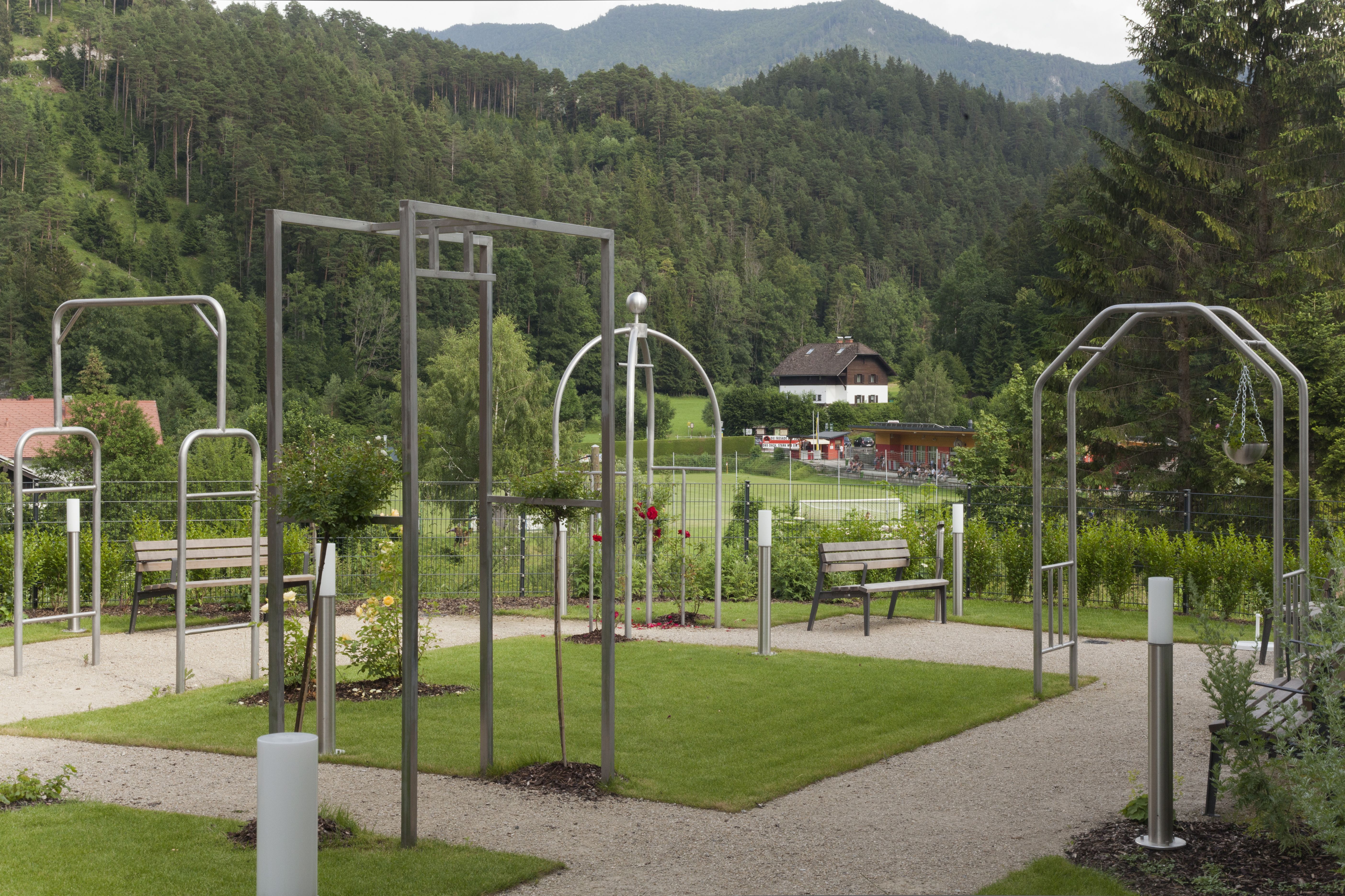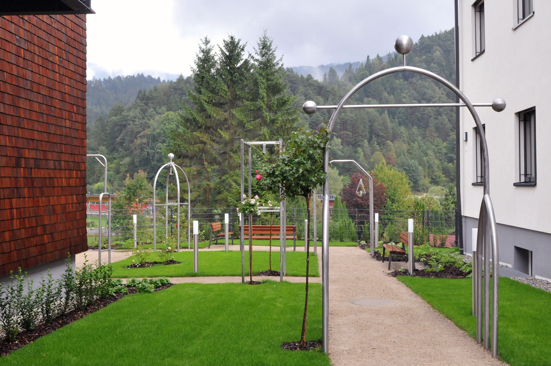 The annex building of the Lower Austrian state nursing home and assisted living center in Türnitz, which was finished at the end of 2016, stands out from the usual sober architecture of nursing homes thanks to the high quality and aesthetically pleasing design of the exterior wall cladding with durable larch wood shingles. The irregularly placed large windows with sheet copper frames lend the building a sculptural appearance. The materials are meant to “age with dignity,” according to the architect. Apparently inspired by this approach, Lazar Lyutakov created a complex installation for the garden of the nursing home. This consists of five stainless steel objects that arch over the paths, while serving as trellises for roses. While they may function as rose arches, they do not look like classical trellises. Instead, Lyutakov modelled them on luggage trolleys like the ones we know from large hotels. Each arch refers to a different model, and through their formal references and obvious functionality, they are ideally suited for evoking different associations and mental images. Regardless of whether they make us think of vacations or luxurious holidays, or things like sports equipment (walkers have also been mentioned), or whether we only see their function or regard them as minimalist sculptures, these associations reflect our world of thoughts – a space Lyutakov helps to create through the openness of possible interpretations, allowing us to revel in self-reflection.