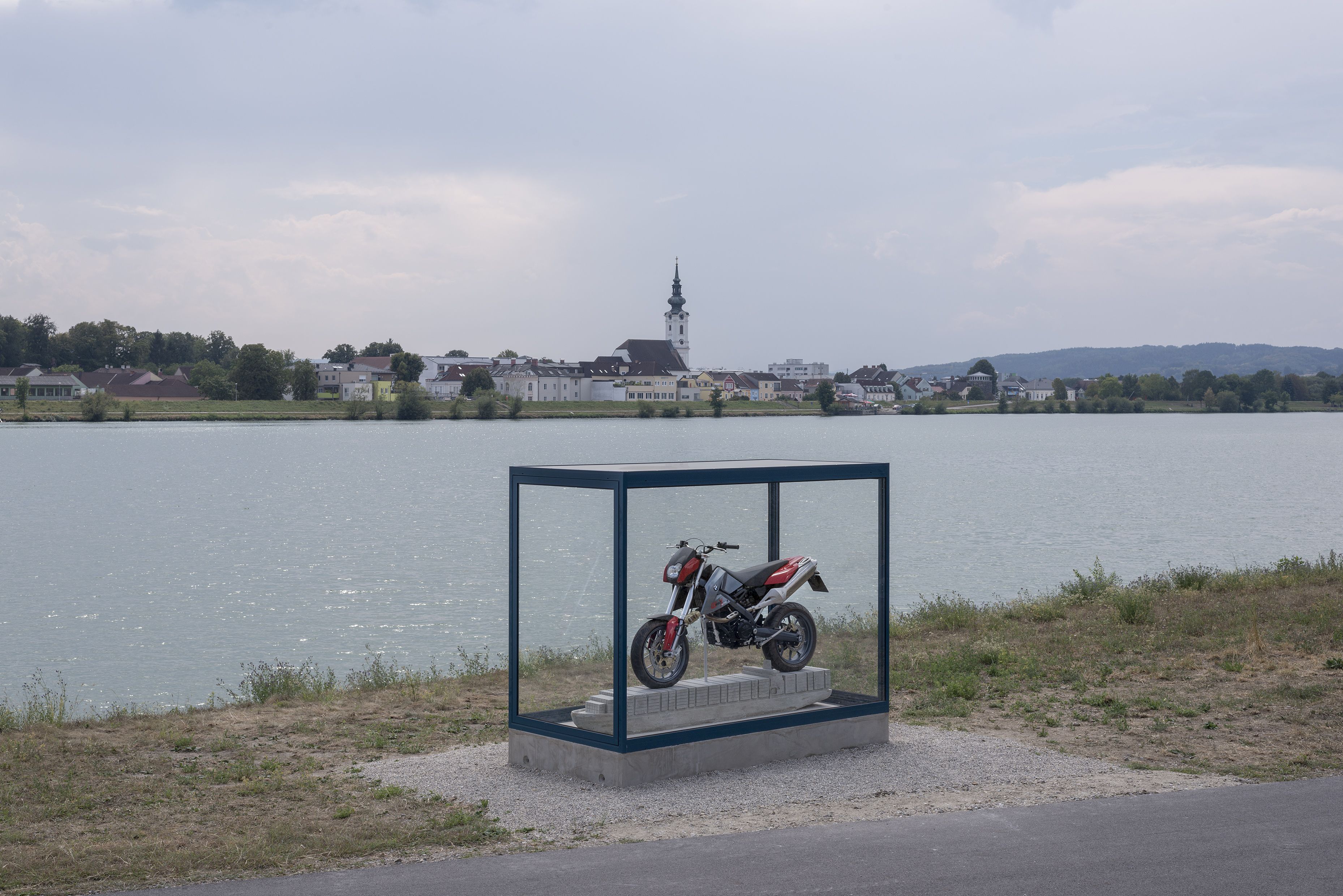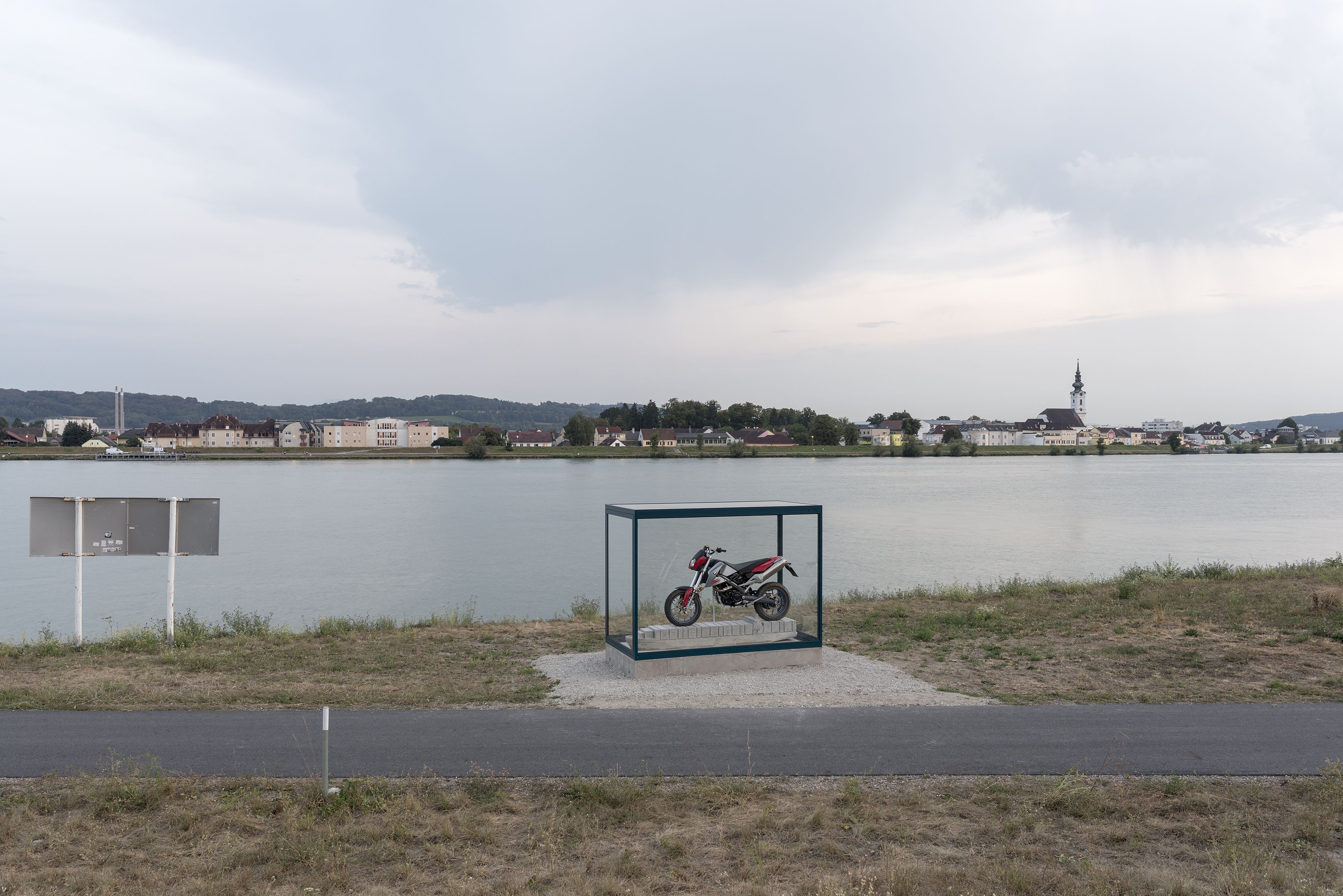 In the artist’s work Cycles Galore ! , an original BMW motorcycle inside a glass showcase placed at an emergency mooring area on the banks of the Danube, where ships can stop if they are in trouble. The work stands on a plinth with contours modelled after the container vessel MSC Napoli, which ran into difficulties in the English Channel on January 18, 2007, during storm Kyrill. As a result, at least 200 containers went overboard near Devon in Cornwall on the southern coast of England. Two days after this occurrence, there began to be reports that some of the cargo had been washed onto the shore near the town of Branscombe. This news of the flotsam attracted onlookers, who began to scavenge in increasingly large numbers. When the situation started getting out of control – an official report about the situation described systematic plundering – the beach was declared a crime scene and the local authorities began to investigate. Prior to this, the local police had informed the public that anyone who recovered flotsam had to declare retrieved goods within 28 days and were allowed to keep them as long as the rightful owner could not be found. According to a report by the BBC about the legal situation, people from all over the south of England came to Branscombe. Images in the media showed men transporting barrels of wine with a row boat, collecting sneakers, and rummaging through soggy cardboard boxes in the containers. One photo became especially famous and shows three young men, posing with a motorcycle they found on the beach. In an interview with the Daily Telegraph , they talked about their find during the so-called “Branscombe Beachcombing,” and their names were printed as well. This caught the company BMW’s attention, who manufactured the motorcycle, and it issued a claim of ownership. What followed was a lengthy legal battle between the two parties until the international company finally shelved the lawsuit and caved in to the stubborn men, who were not intimidated by the legal consequences.