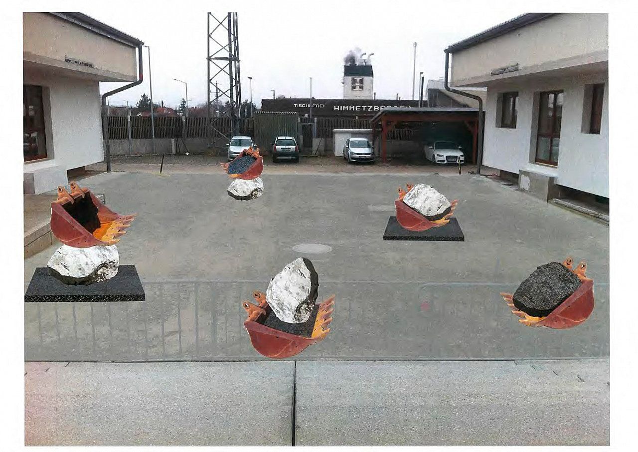 For the competition to design a project for the area in front of the newly built training facility of the road maintenance agency in Krems, Sofia Hultén suggested several sculptures that consisted of the same three elements – an excavator, asphalt, and a boulder – in different combinations. However, the road maintenance agency decided to expand the building and remodel the landscaping instead, and the design could not be realized.