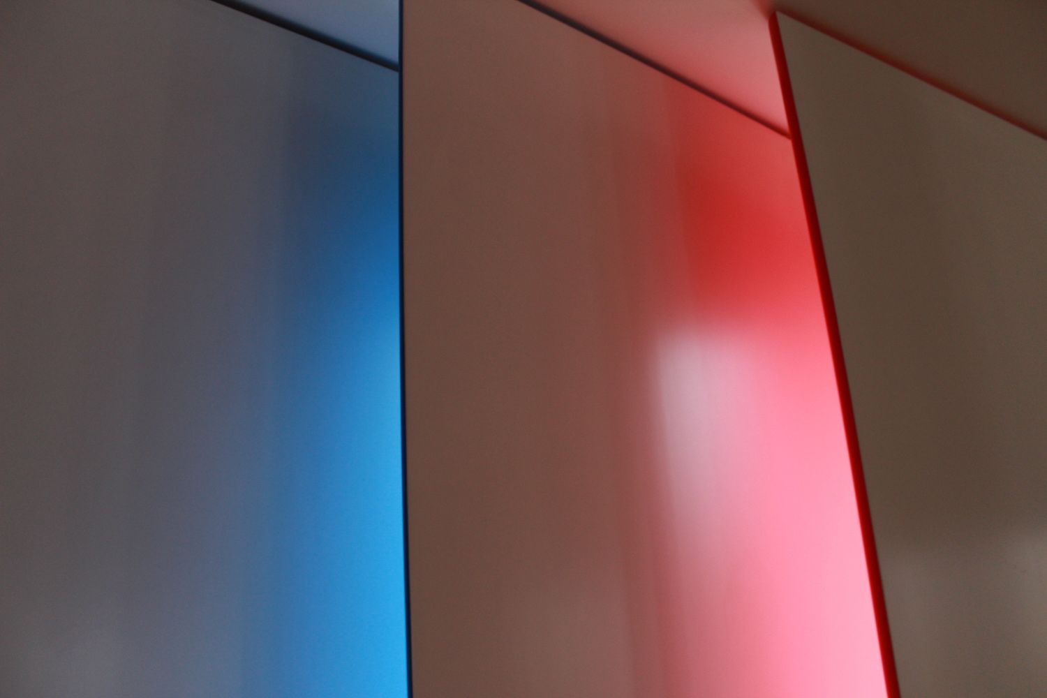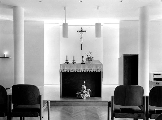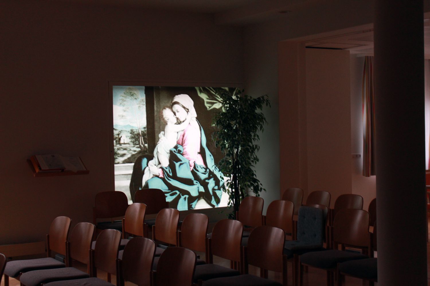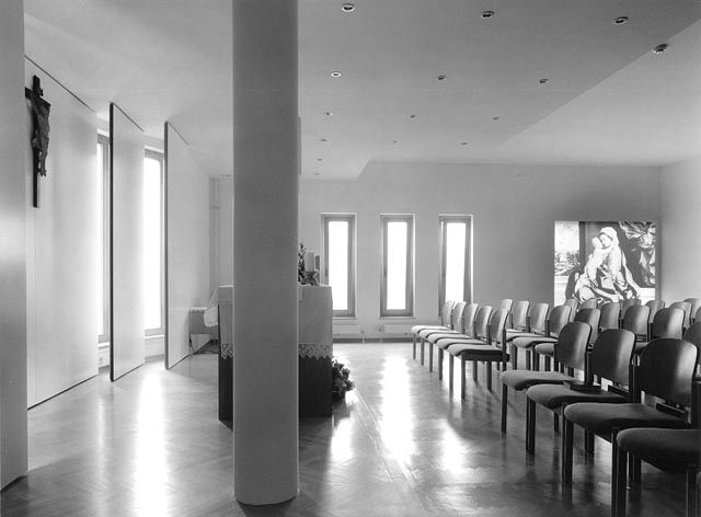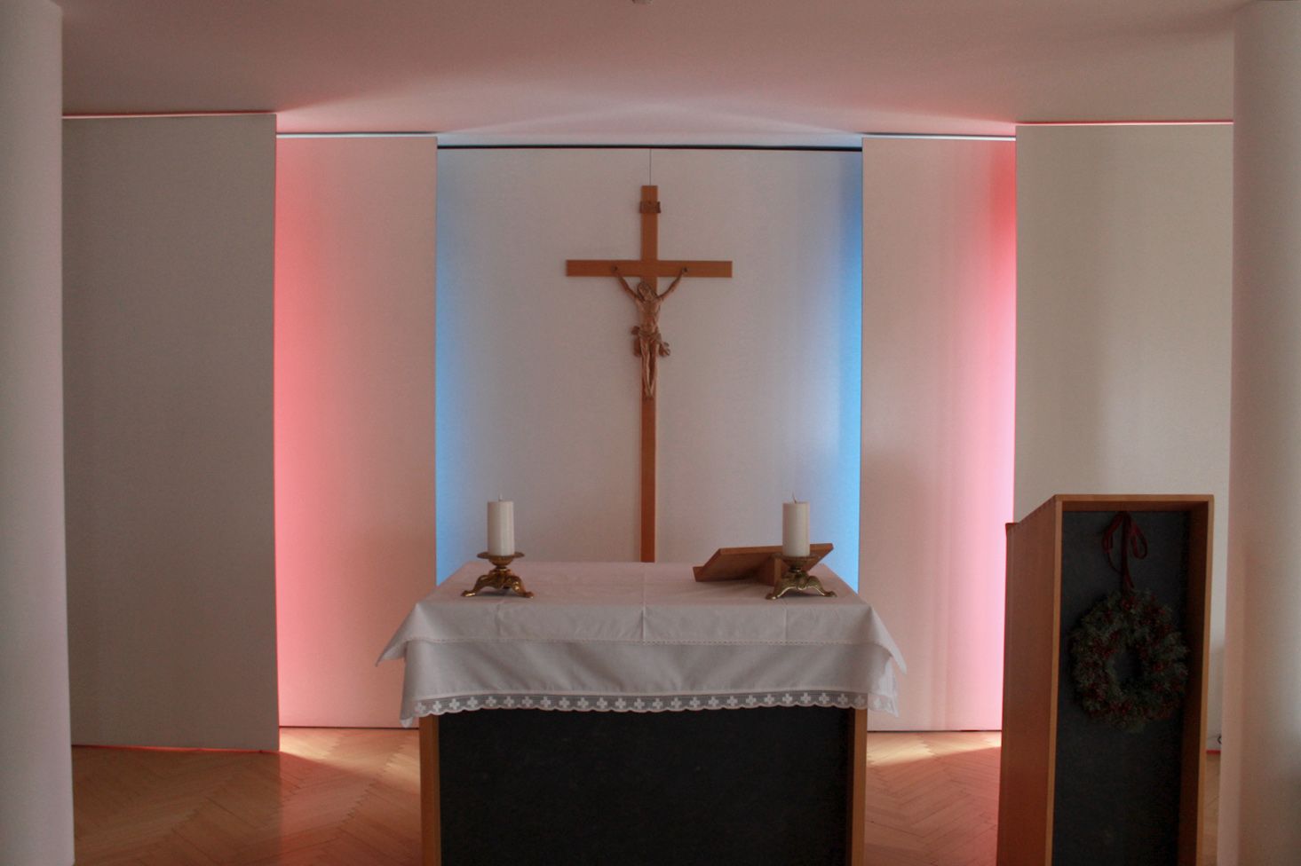 The interior of the chapel is simple, restful and bright. Its atmosphere and vibrations are produced by the light, the colours, the beech wood used and an image of the Virgin Mary and Child. The special wish for a chapel dedicated to the Virgin Mary has been included in the artistic design and implemented, using contemporary technology, as a large-scale glass painting that determines the first impression upon entering the chapel. The backlight of the window apertures situated in the altar area is an indirect light source for colour reflections on slightly staggered wall panels. This produces a colour space that penetrates the depth and subtly repeat the characteristic red and blue colours in the image of the Virgin Mary. The design of the session, tabernacle, ambo and altar, which has been kept very plain in beech wood with integrated dark slate tiles, determines the contemplative atmosphere of the altar area and of the chapel.