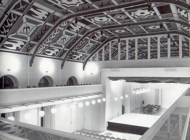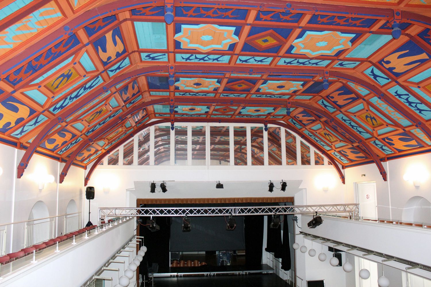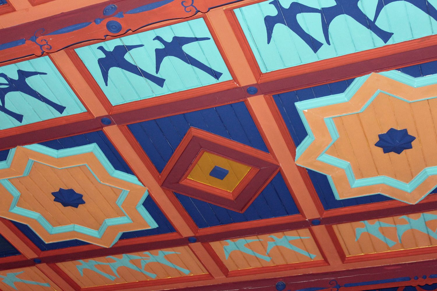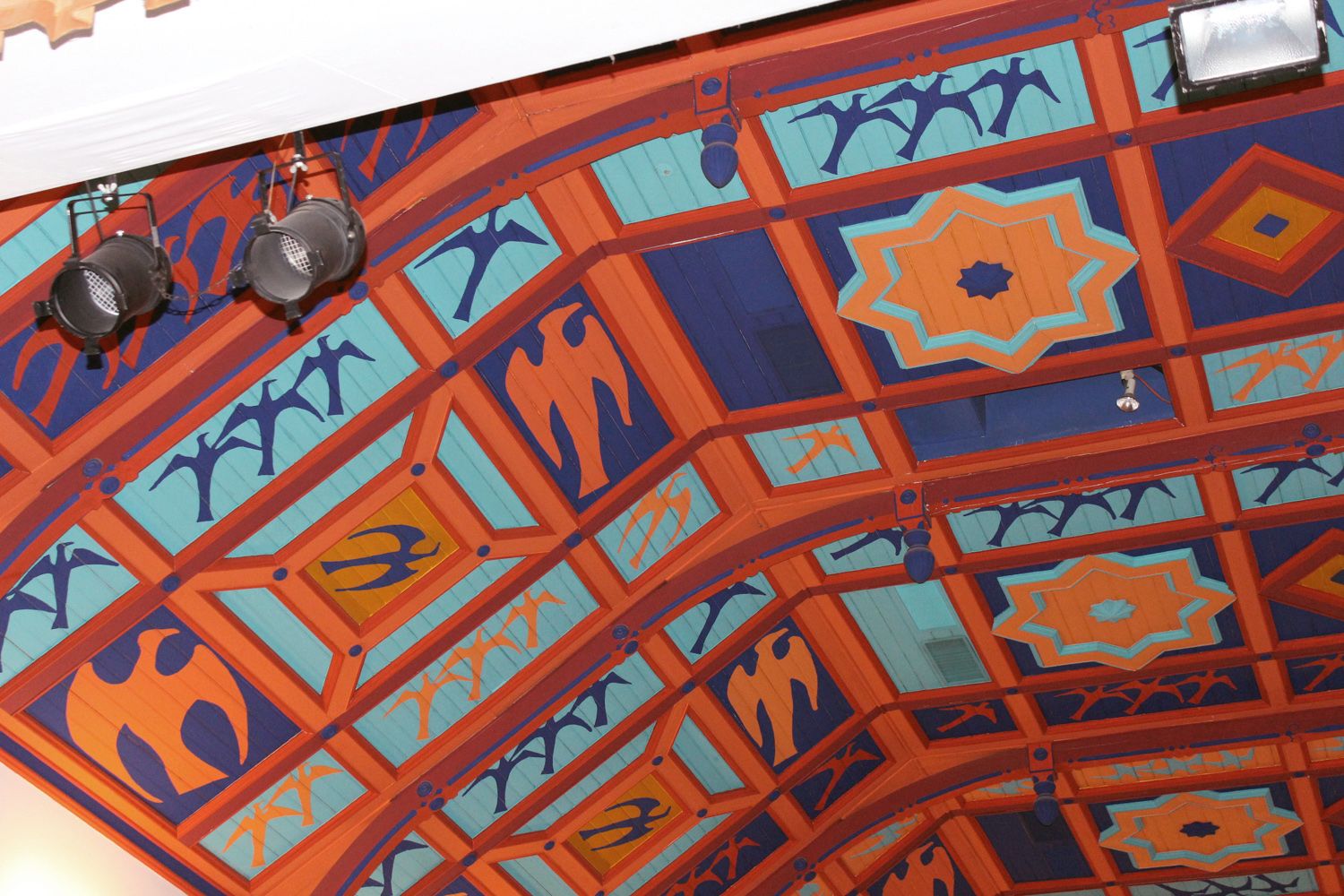 The existing structure was to be retained in its entirety but relieved of some of its weight and bawdiness by the application of colour and shapes. The selected colour scheme is supported by the notion of the Firmament. Flying birds move and enliven the panels in the ceiling with their rhythm. The use of complimentary colours for the birds and their respective backgrounds results in a coherent system of surfaces. The existing ornamentation in the panels is reproduced in the colour scheme, emphasised and pulled towards the sky like a net. The cords to the truss are freed of their weight by the employment of several colours, primarily red, and emphasised as a structure; the carved parts are highlighted to visible effect. The play of the different hues of colour and different forms frees the ceiling of its material quality. The dark tones draw the space out lengthways, the combination of orange and turquoise creates the illusion of sunshine with its brightness and radiance.