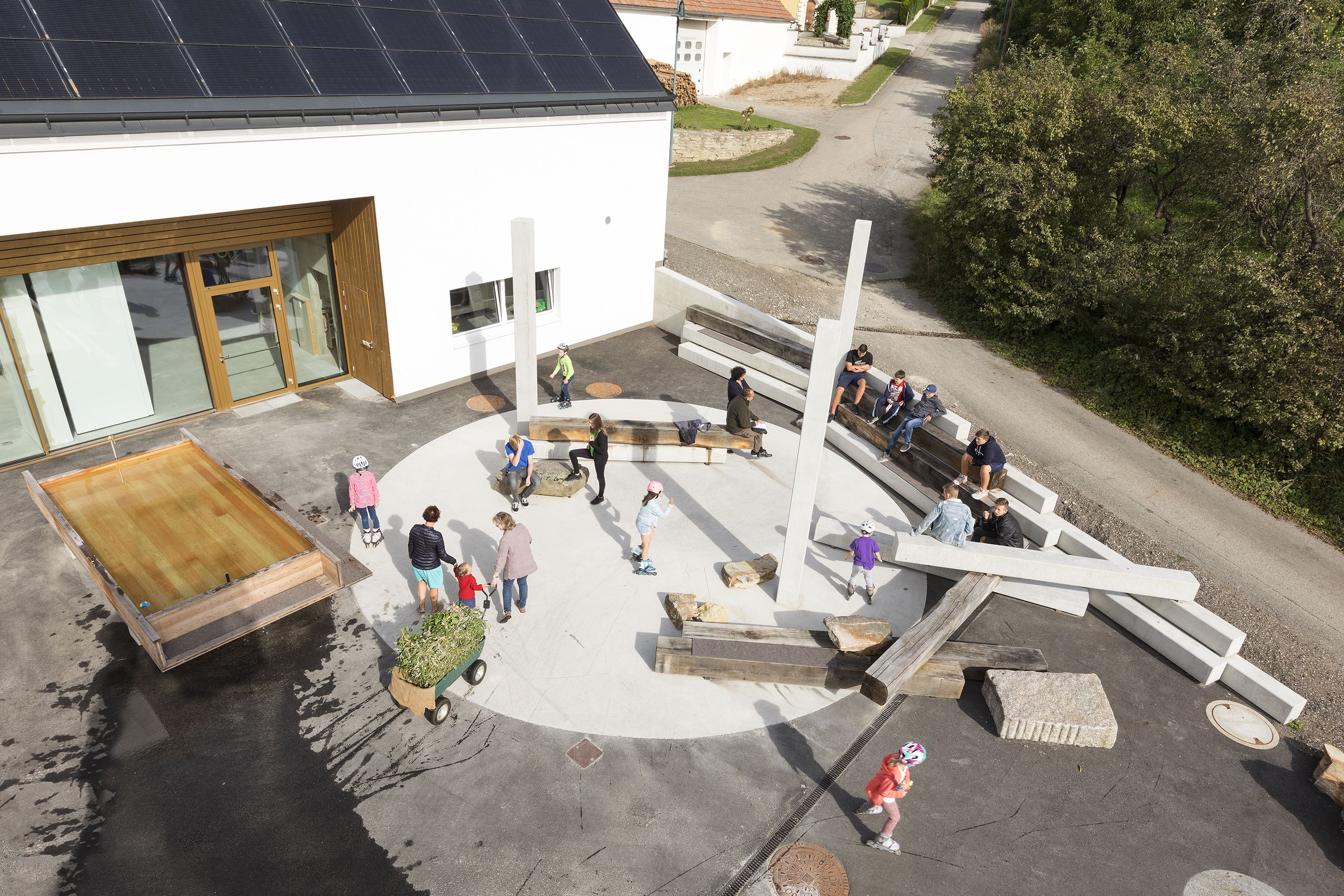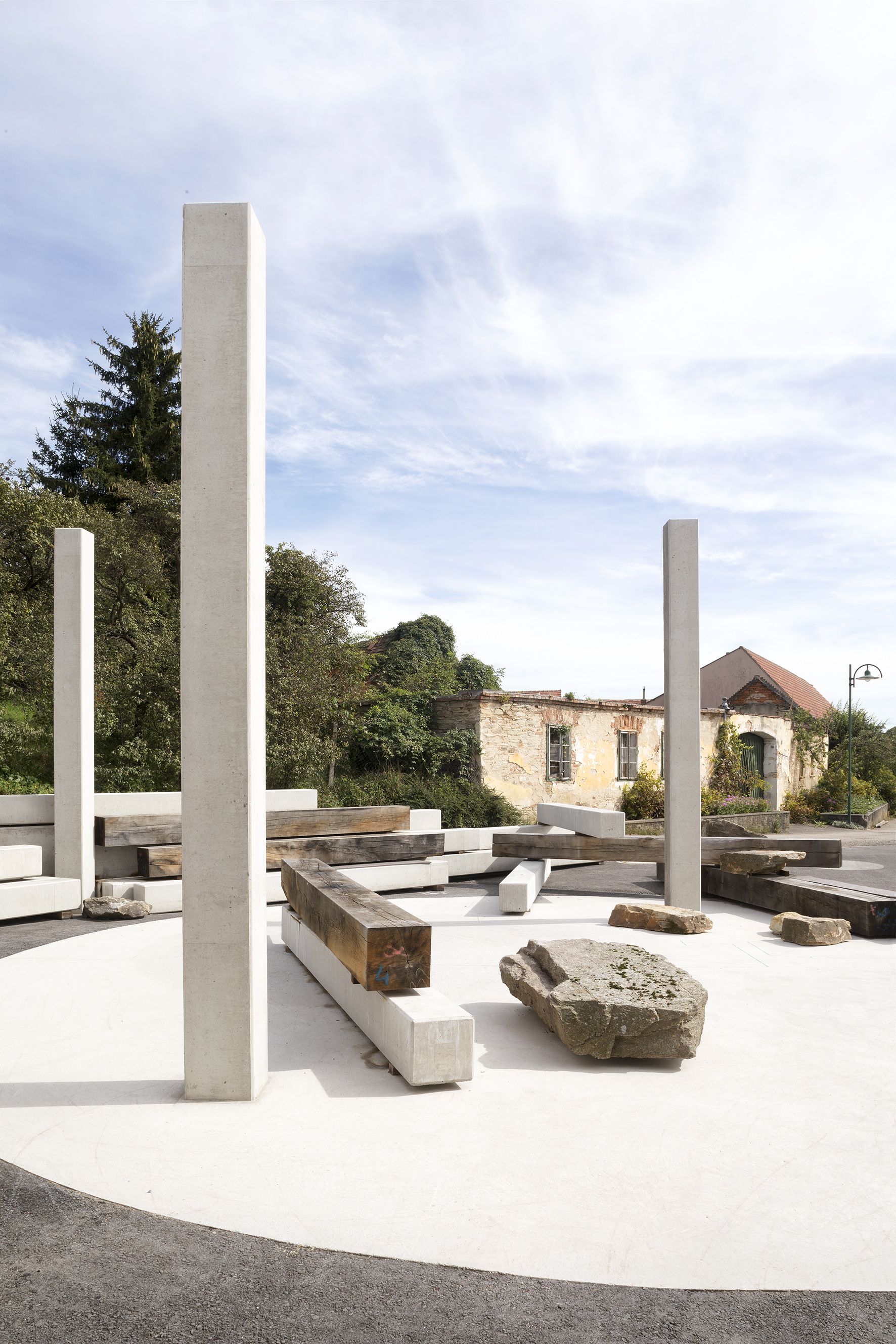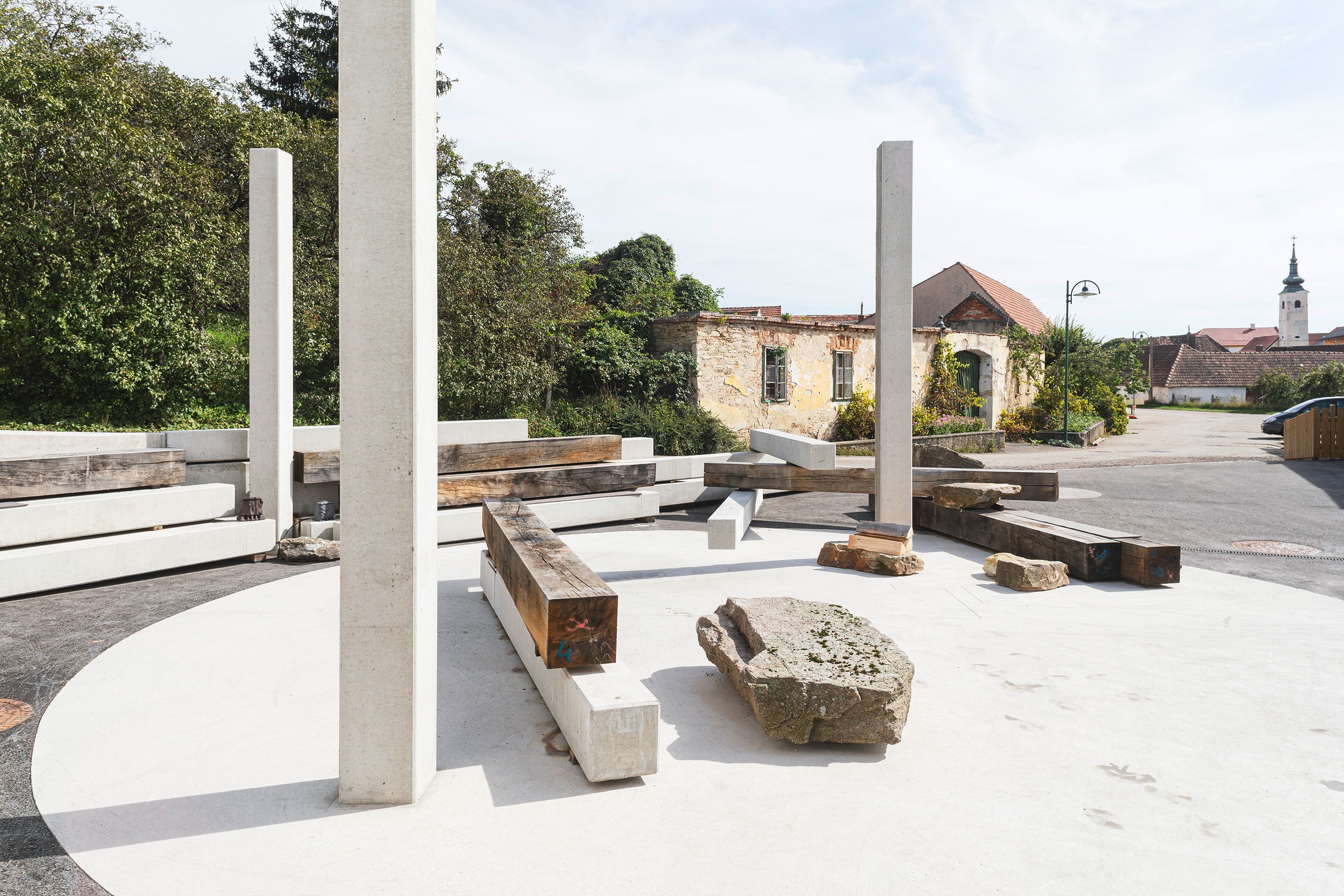 The square is defined by elements designed by the artist duo Nicole Six and Paul Petritsch. Their design proposal was the winner of an invitation-only call to artists organized by Public Art Lower Austria. Six and Petritsch have developed a space full of possibilities with a structure for social life. The design of the square is essentially based on three elements that anchor it in several underlying narratives about humanity and our relationship to the world. The components are designed to promote the shared use of the square and consist of a campfire circle on polished concrete, a fountain made of larch wood the size of a parking space, and scattered heavy oak beams and prefabricated concrete elements to sit on. The moveable elements can be playfully rearranged with tractors and forklifts. They can be stacked like oversized Mikado sticks, or they can be moved around to serve as seats, stands, a bar, or as demarcations, according to the village’s needs.